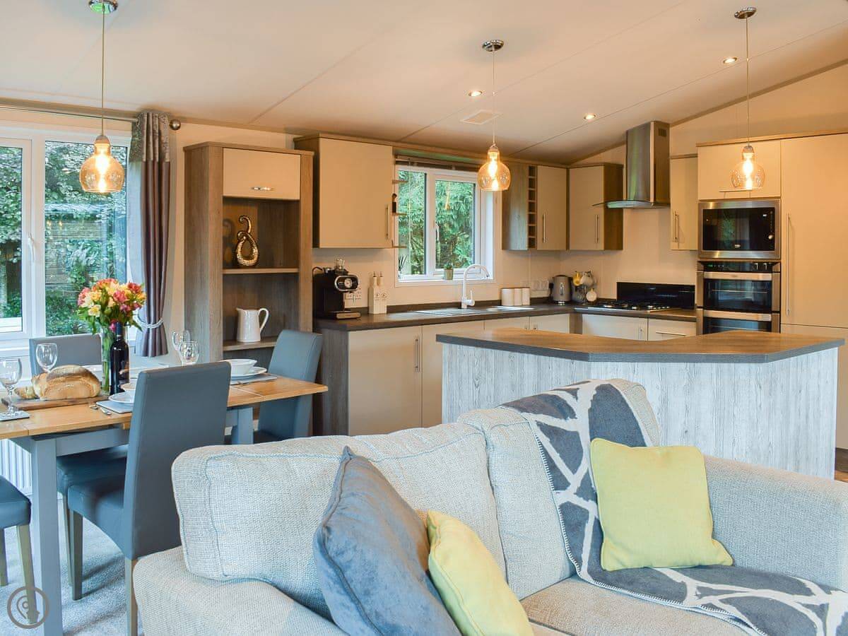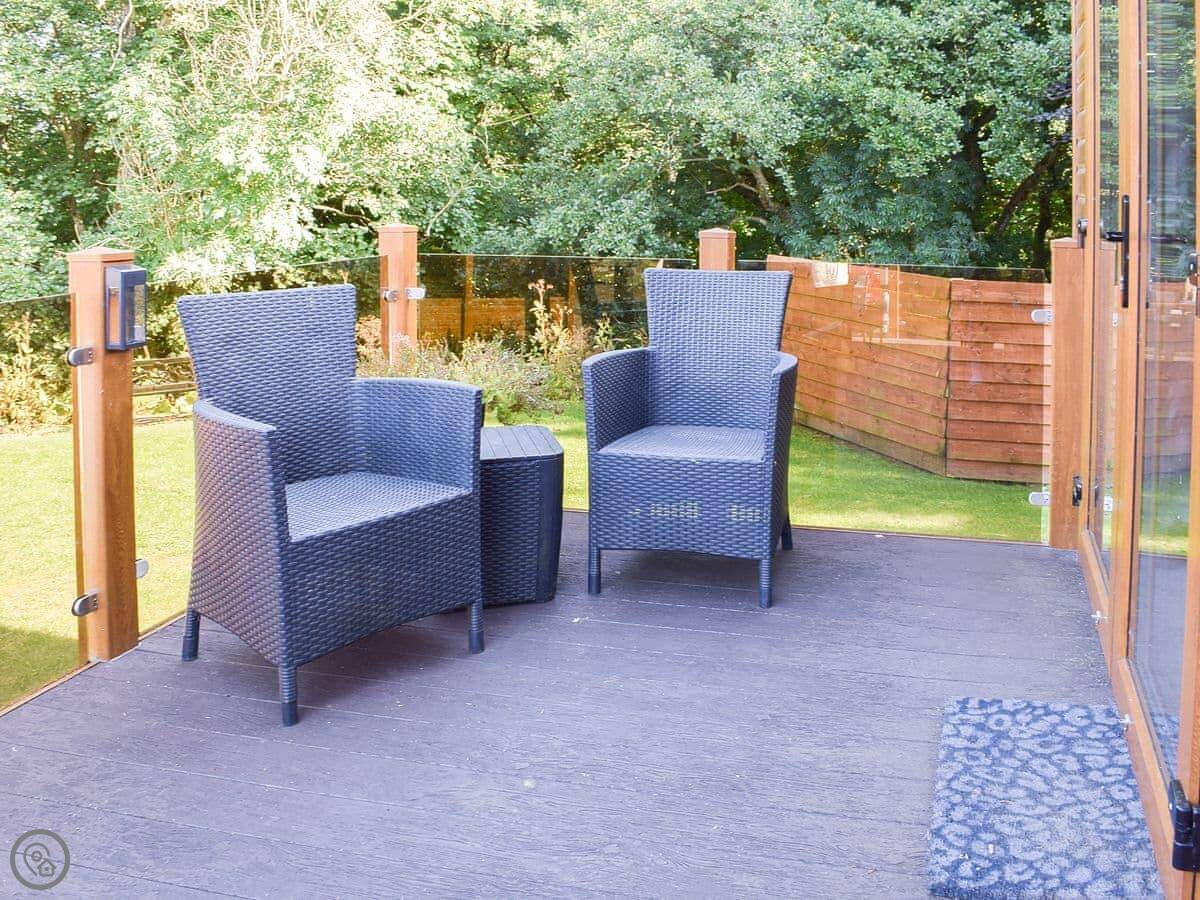 The main room is open plan, kitchen, dining, and sitting area. Patio doors open onto a decked area with a table and chairs. There's a wood-burning stove for the colder months. You've got all the usual things, dishwasher, washing machine, wifi. Parking is right outside.