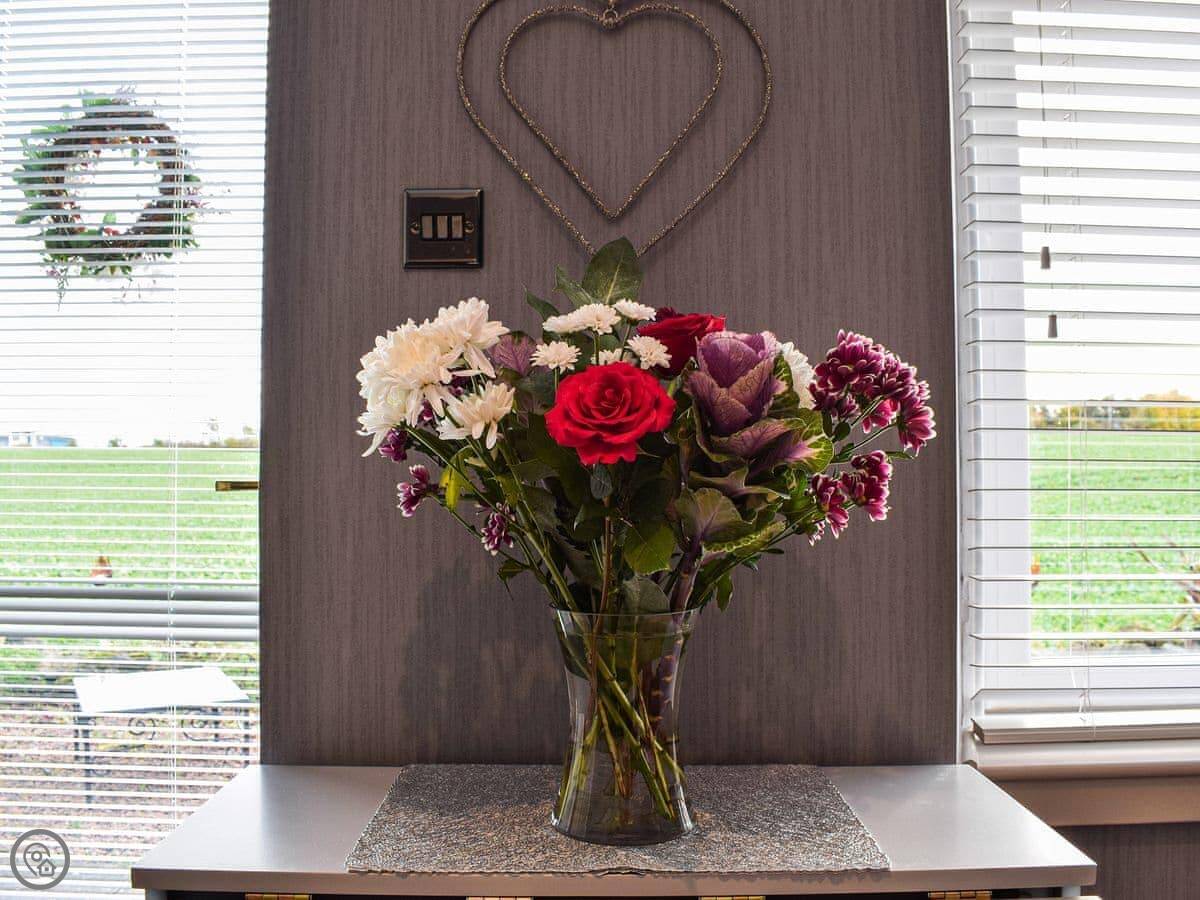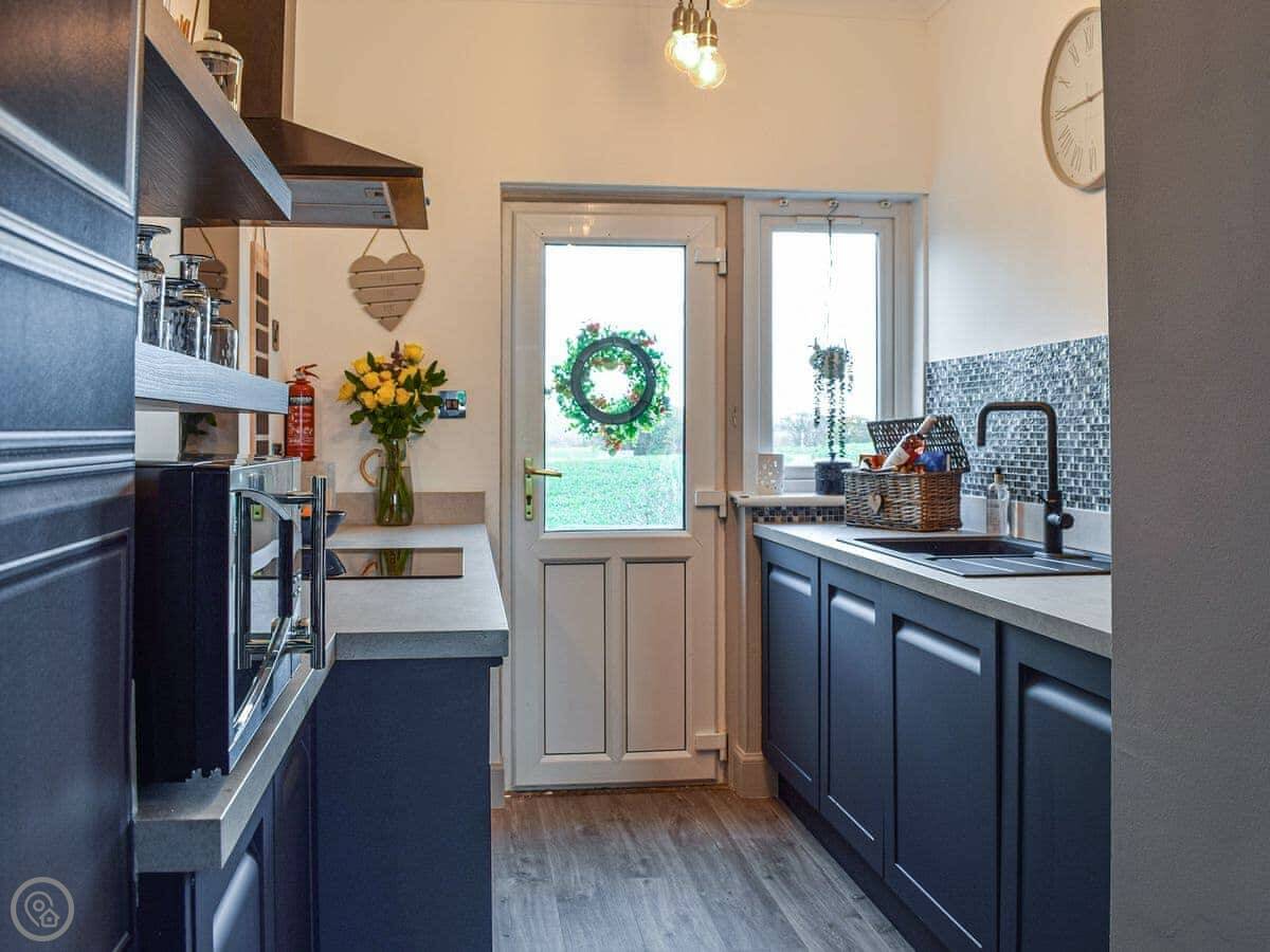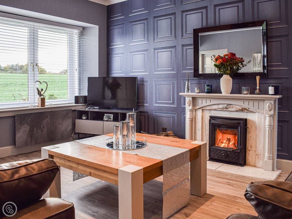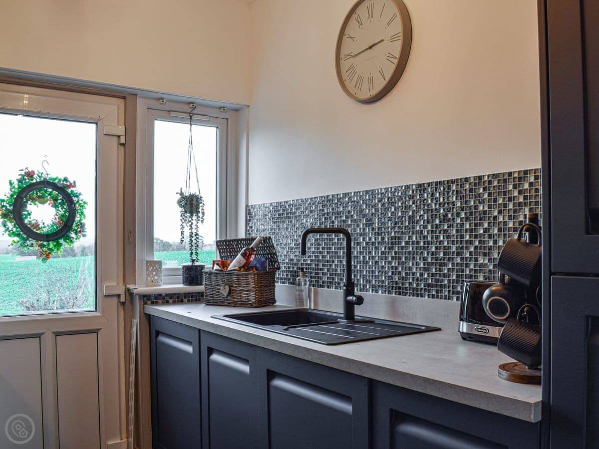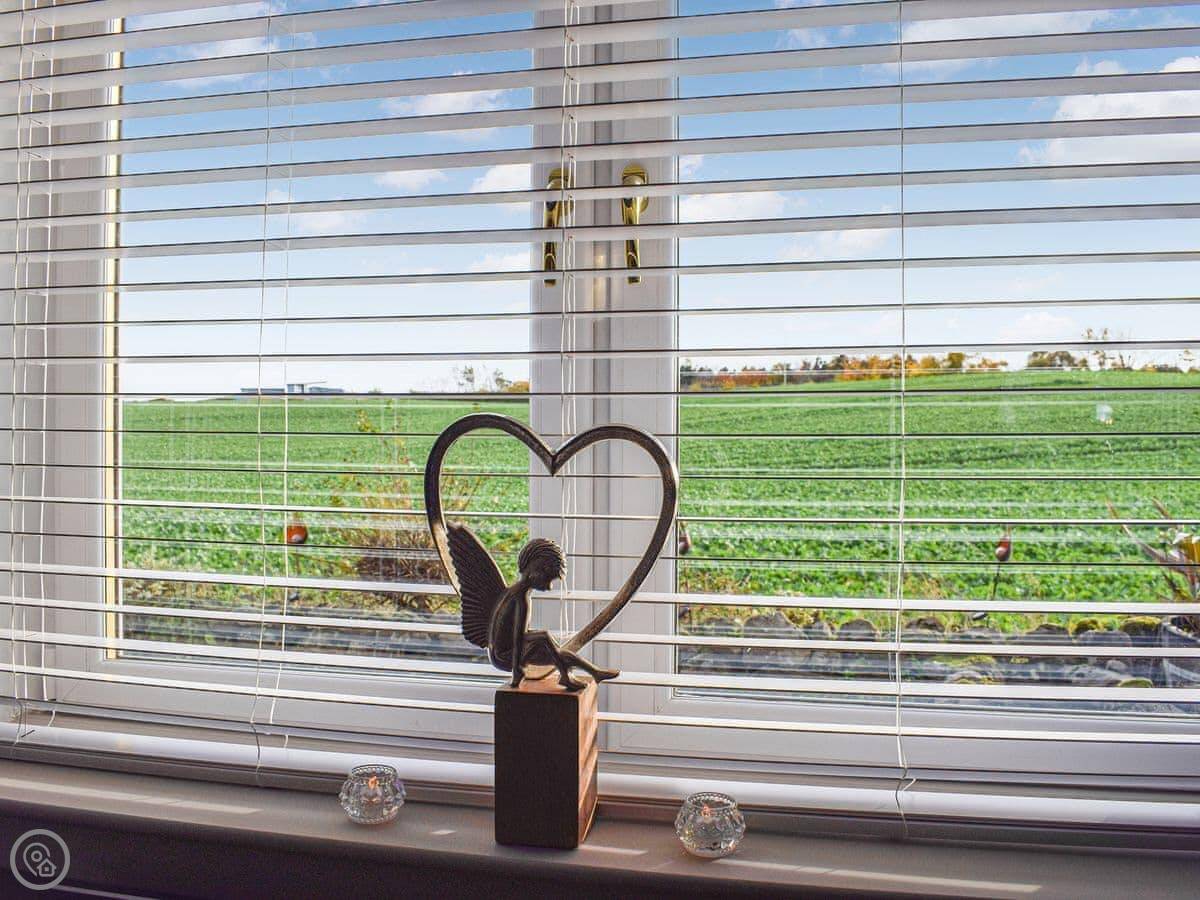 It's all on one level inside, which is handy. Two double bedrooms and a shower room. The lounge looks out the front over fields. There's a wood burner for colder days. The kitchen is new.