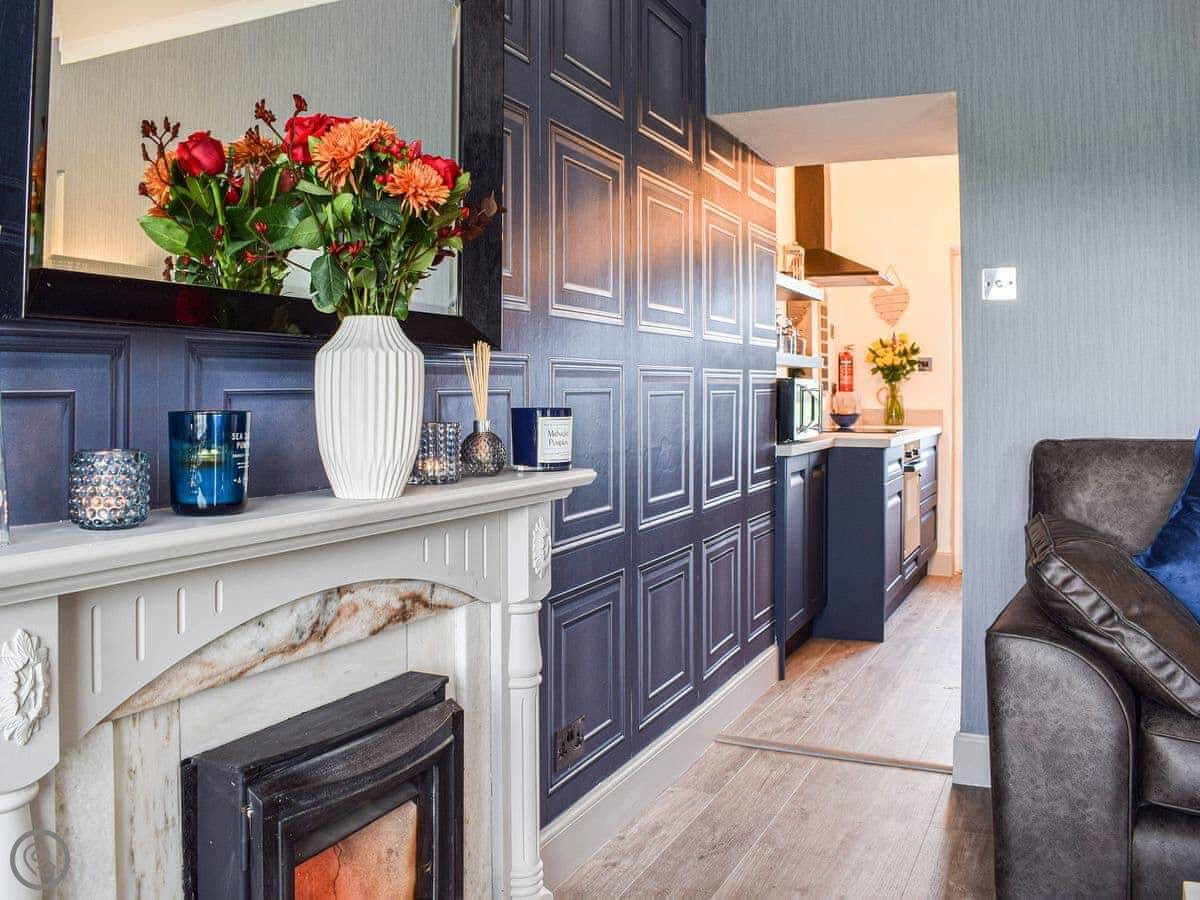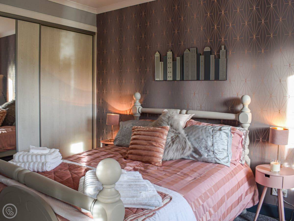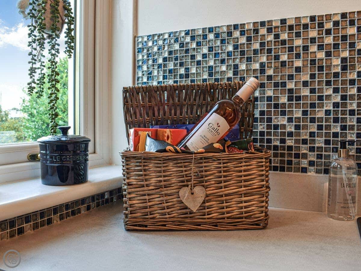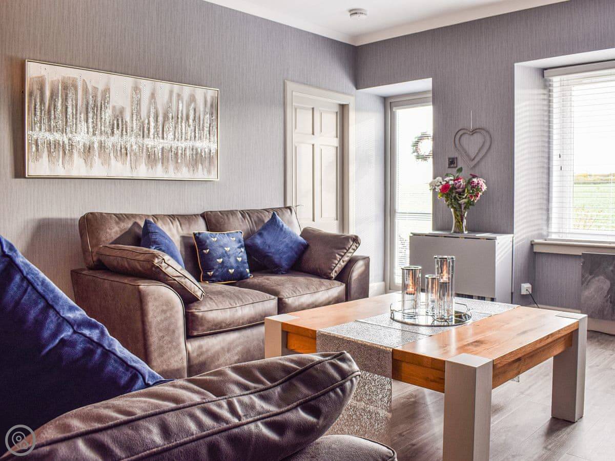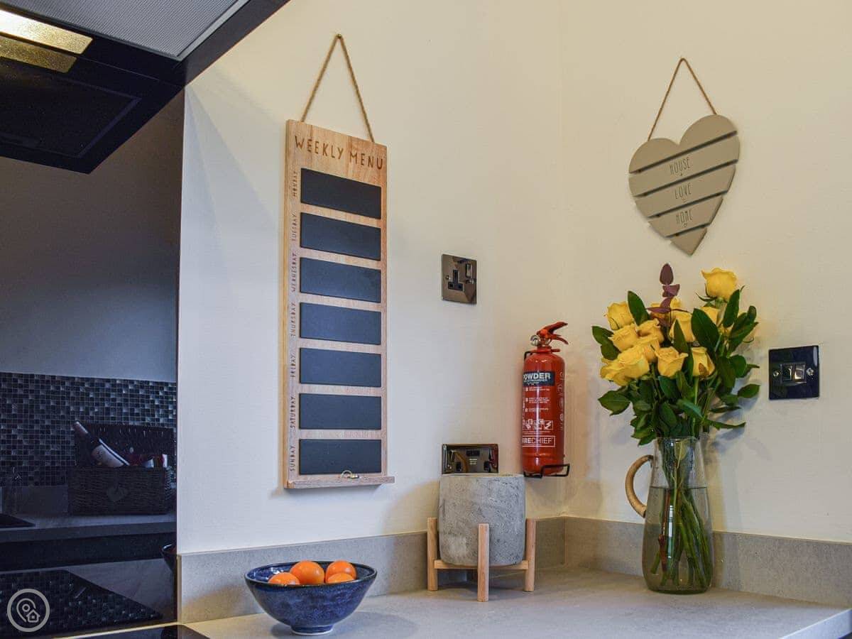 It's all on one level inside, which is handy. Two double bedrooms and a shower room. The lounge looks out the front over fields. There's a wood burner for colder days. The kitchen is new.