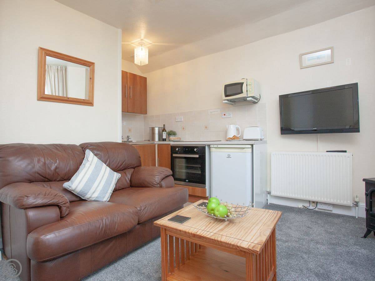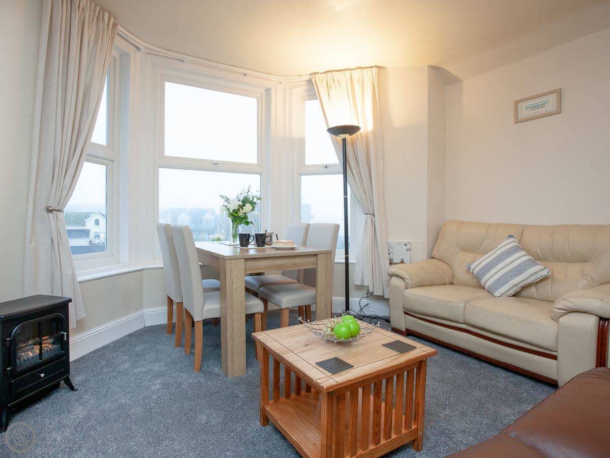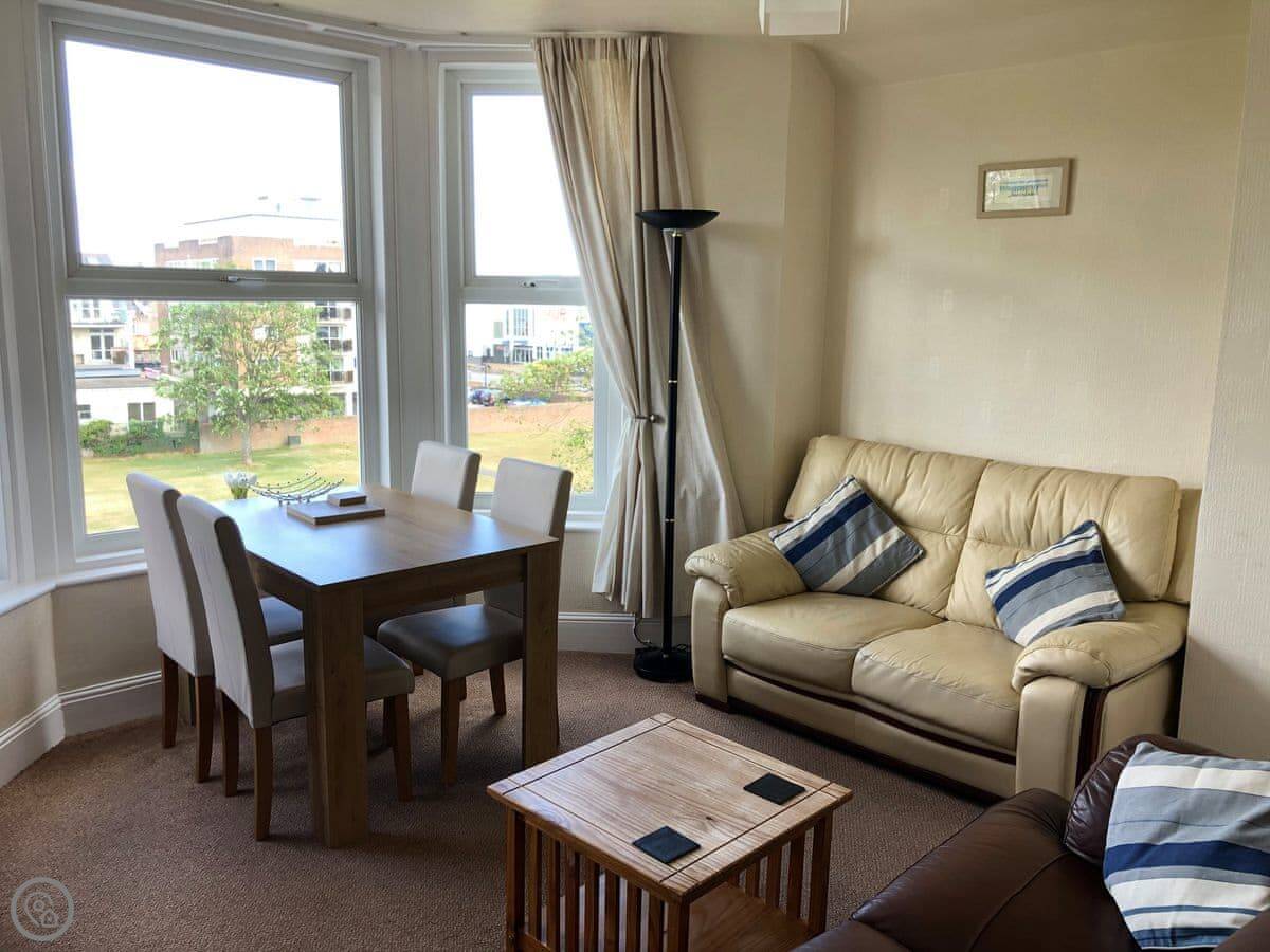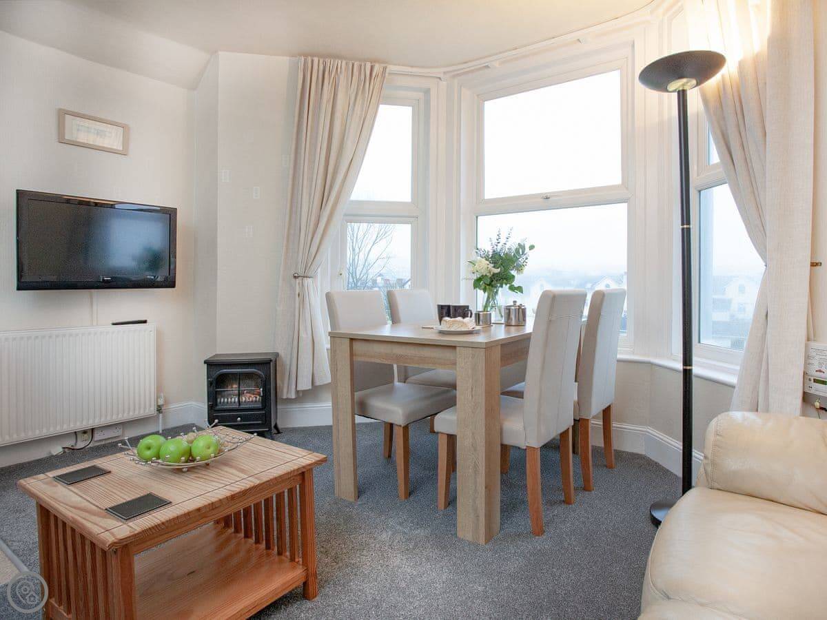 The main living area is all one open plan room with a kitchen at one end. The big bay window looks out over the gardens and you can see the sea. You can see the pier from there.