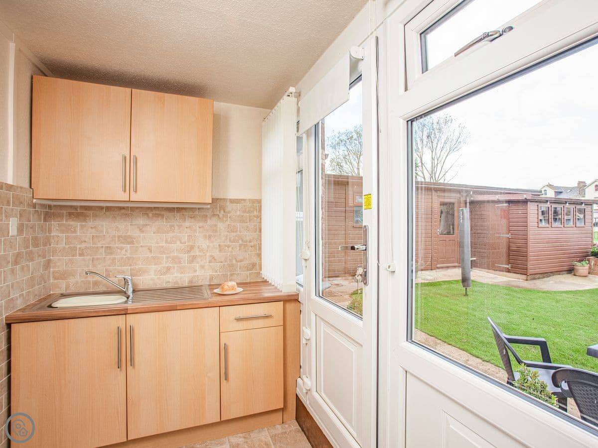 The main room is open plan. There's a kitchen area, a dining space, and the lounge. A door leads straight out into the back garden. It's a shared garden space with the other flats, but it's a decent size. You can sit out there.