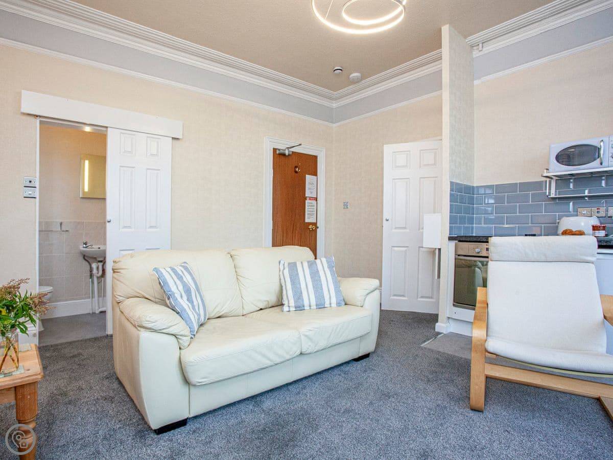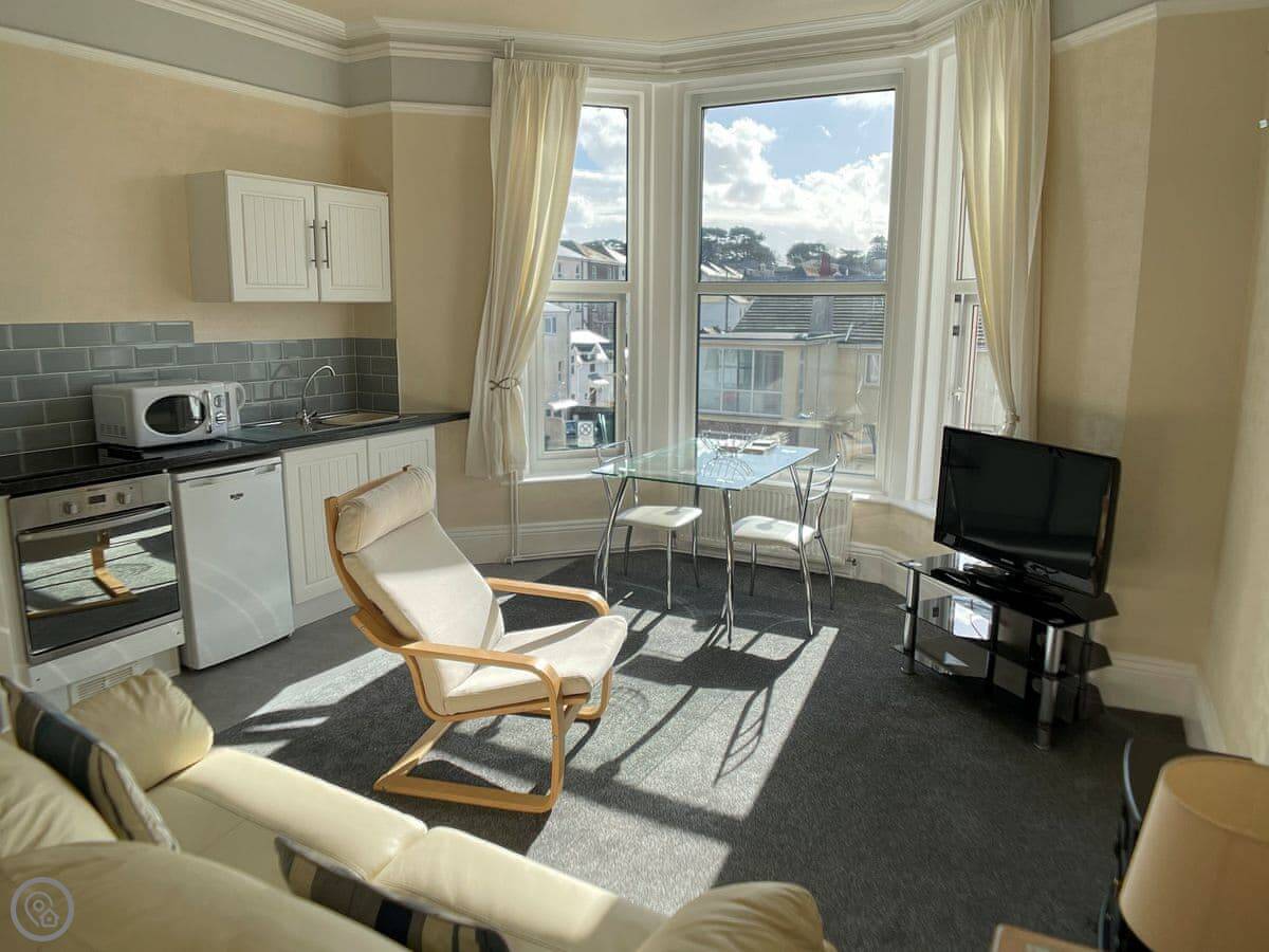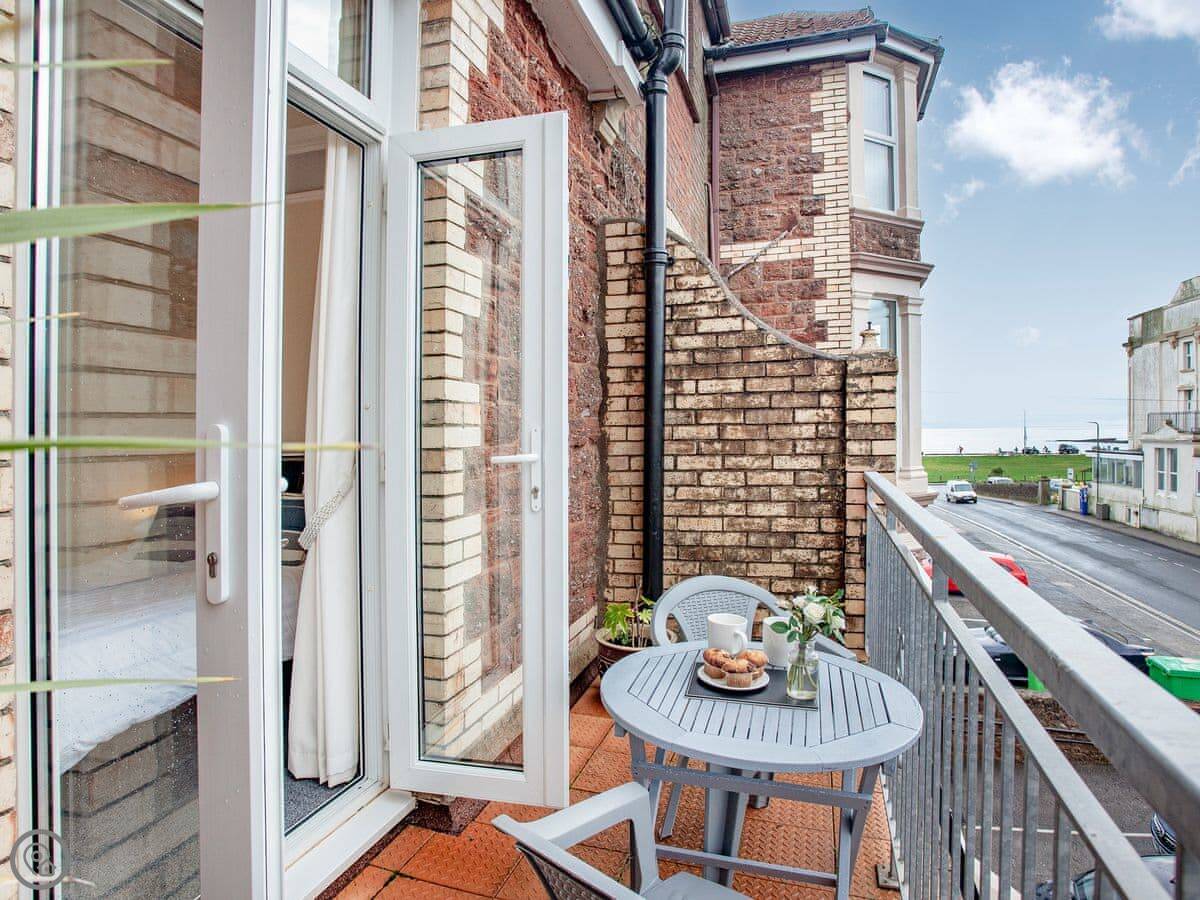 The main thing is the sea view. The living room and the bedroom both face south over the seafront. You get a private balcony off the bedroom with a table and chairs.