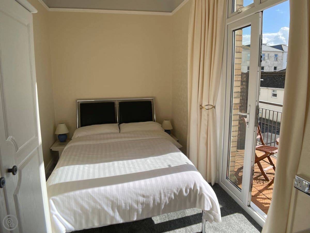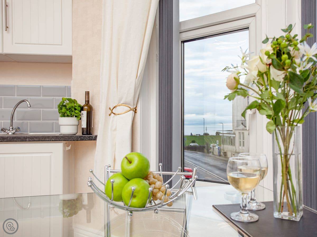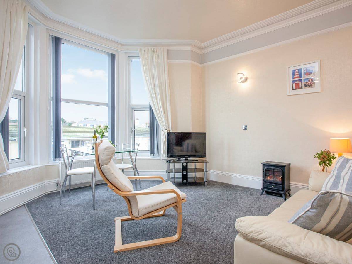 The main thing is the sea view. The living room and the bedroom both face south over the seafront. You get a private balcony off the bedroom with a table and chairs.
