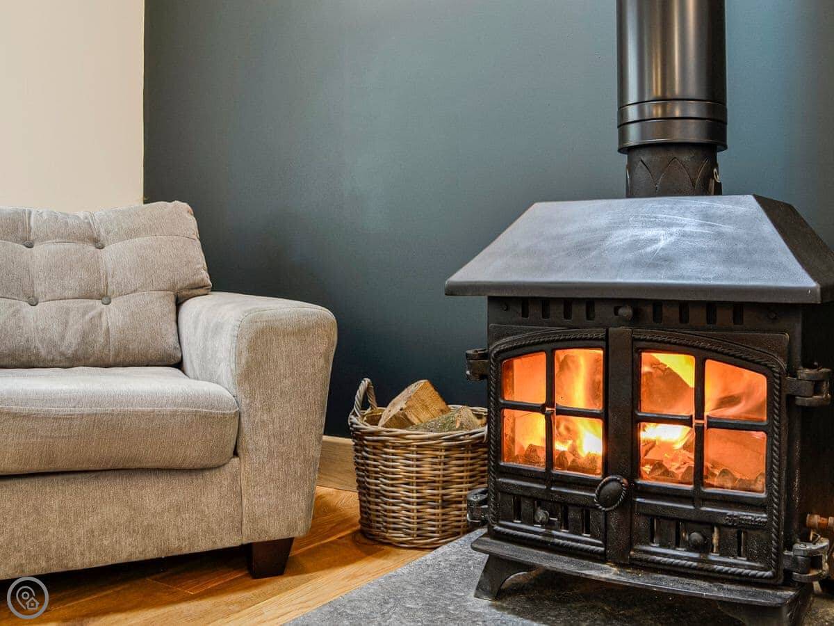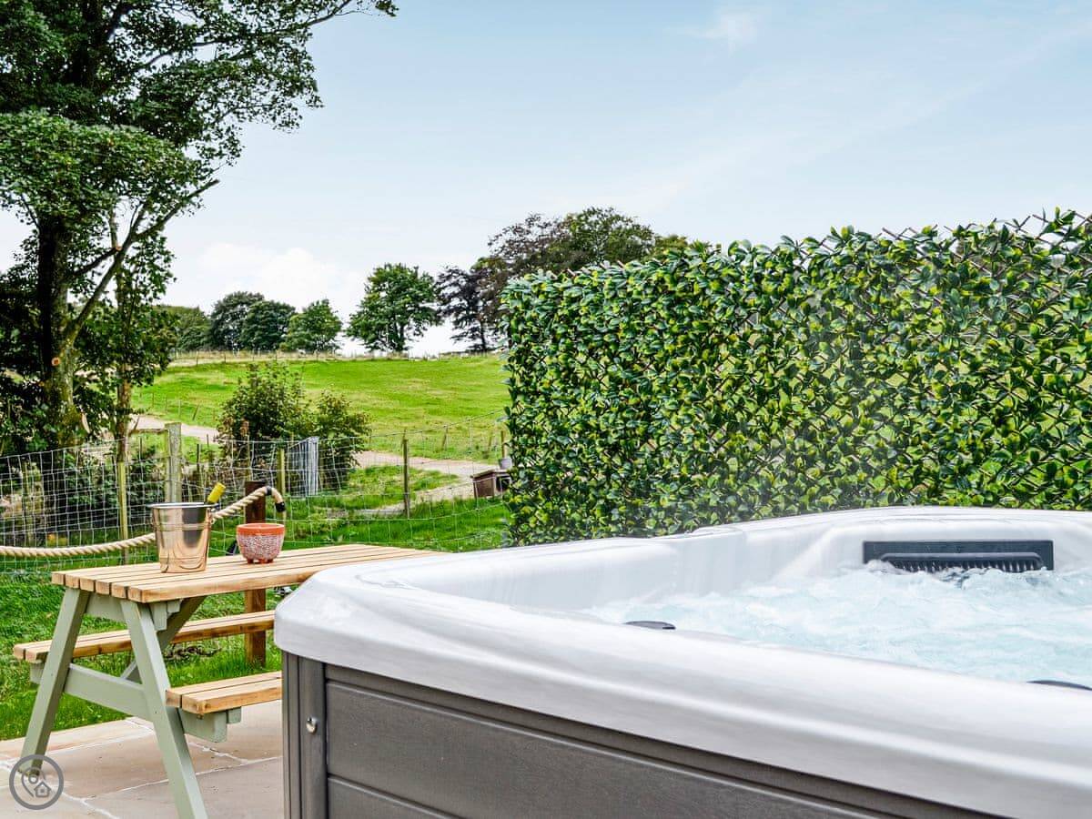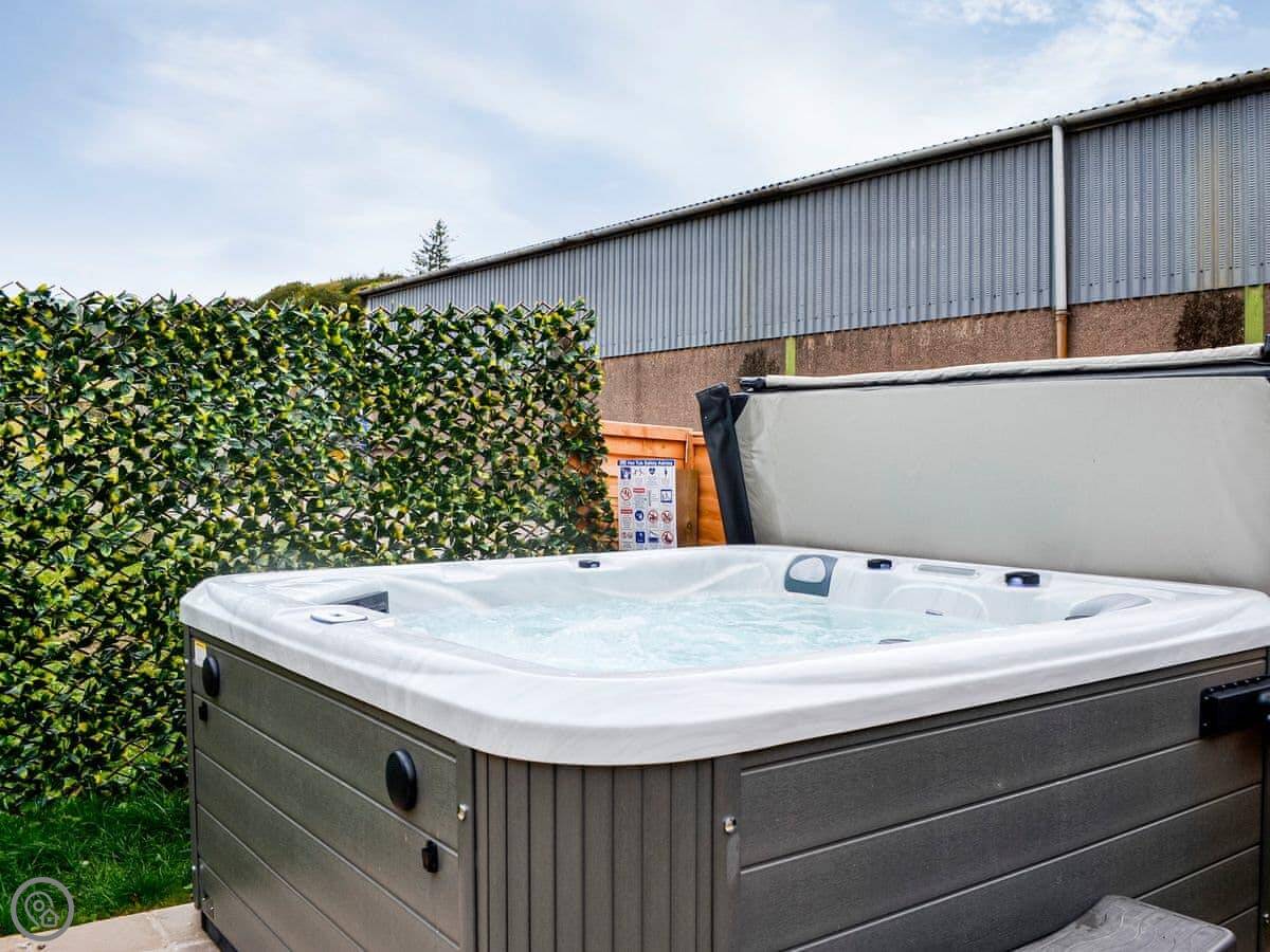 There's a wood burner in the main room. The bathroom has a bath and a separate shower. Outside, there's an enclosed garden and a patio with a hot tub. We leave robes for it.