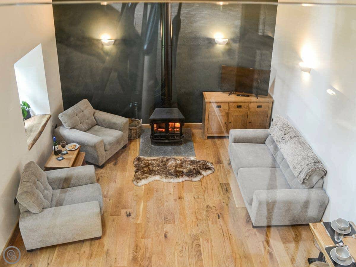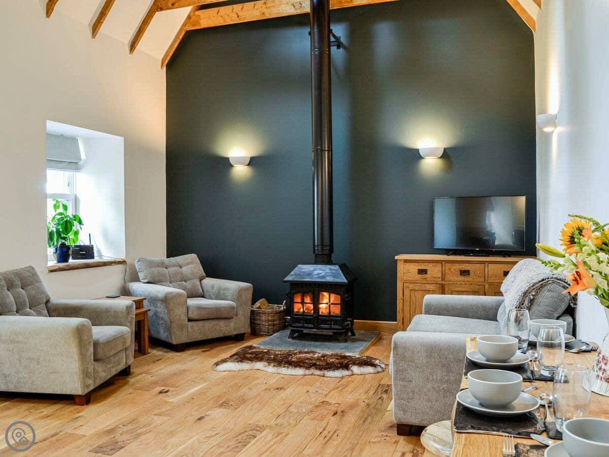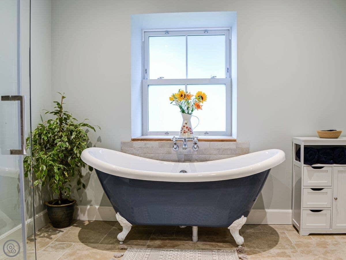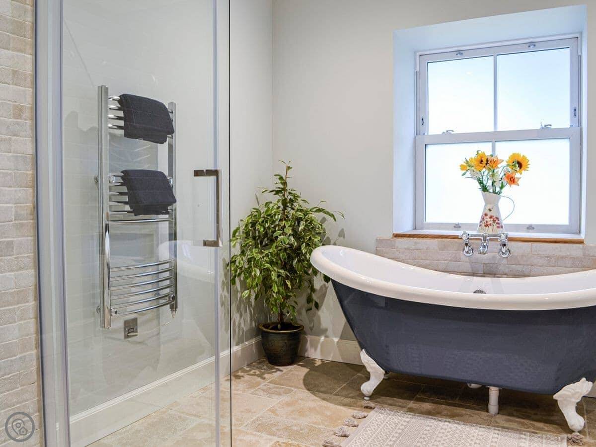 There's a wood burner in the main room. The bathroom has a bath and a separate shower. Outside, there's an enclosed garden and a patio with a hot tub. We leave robes for it.