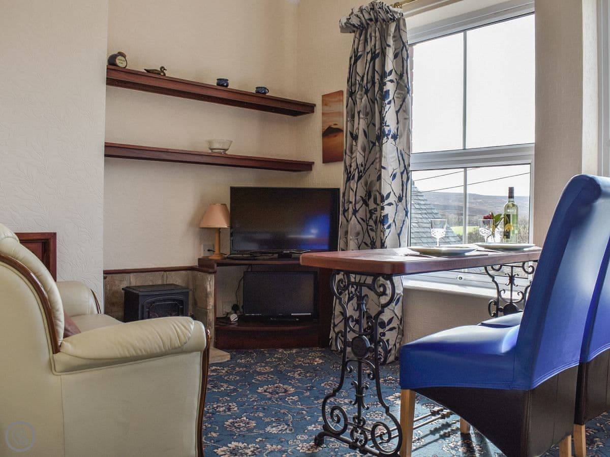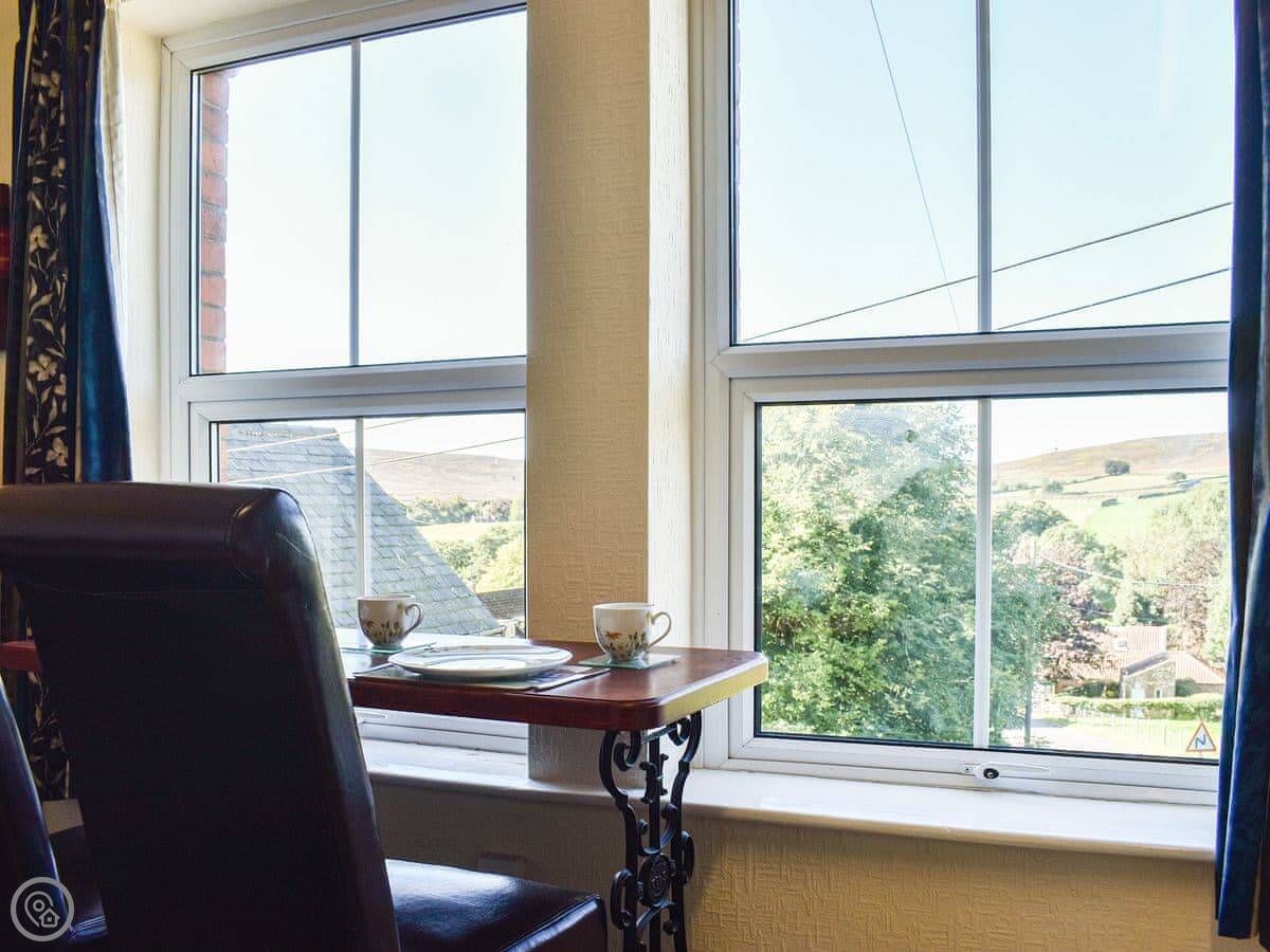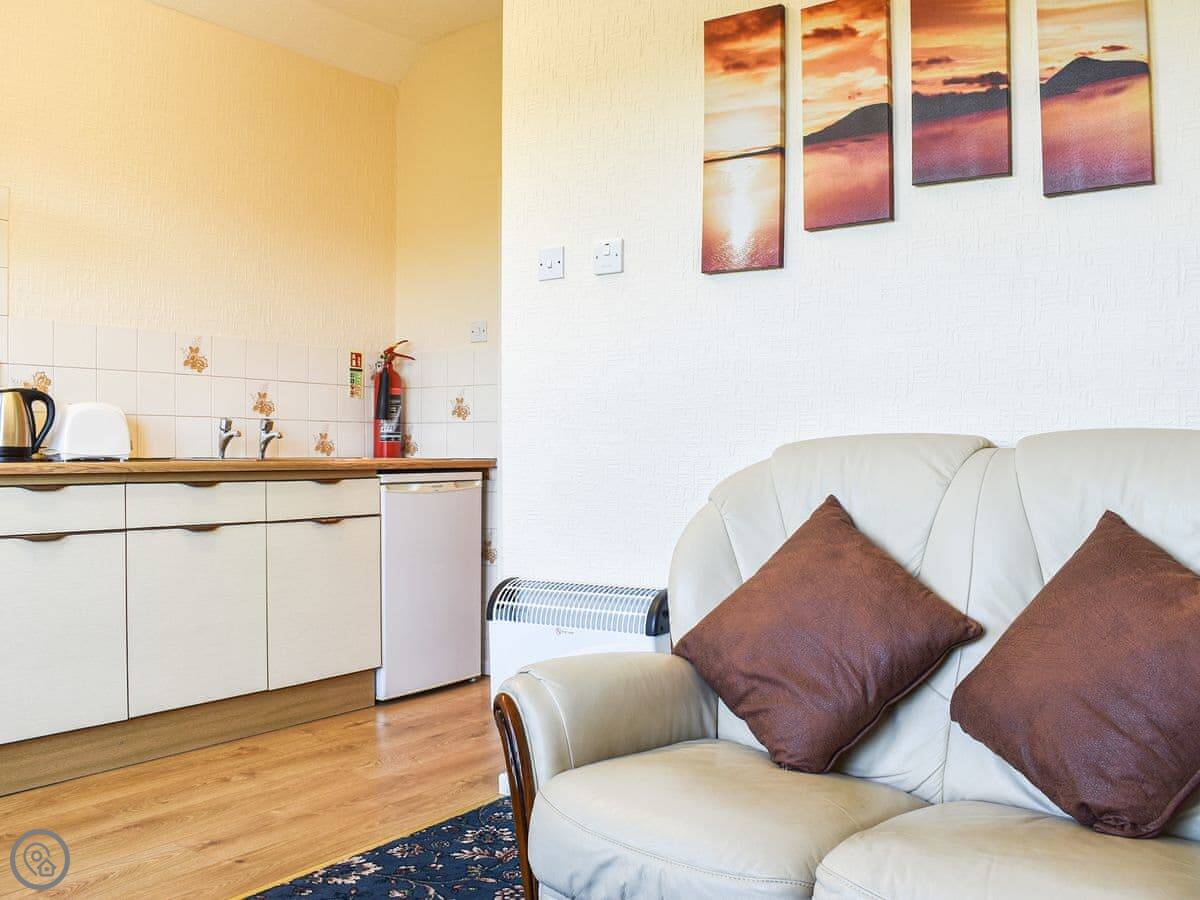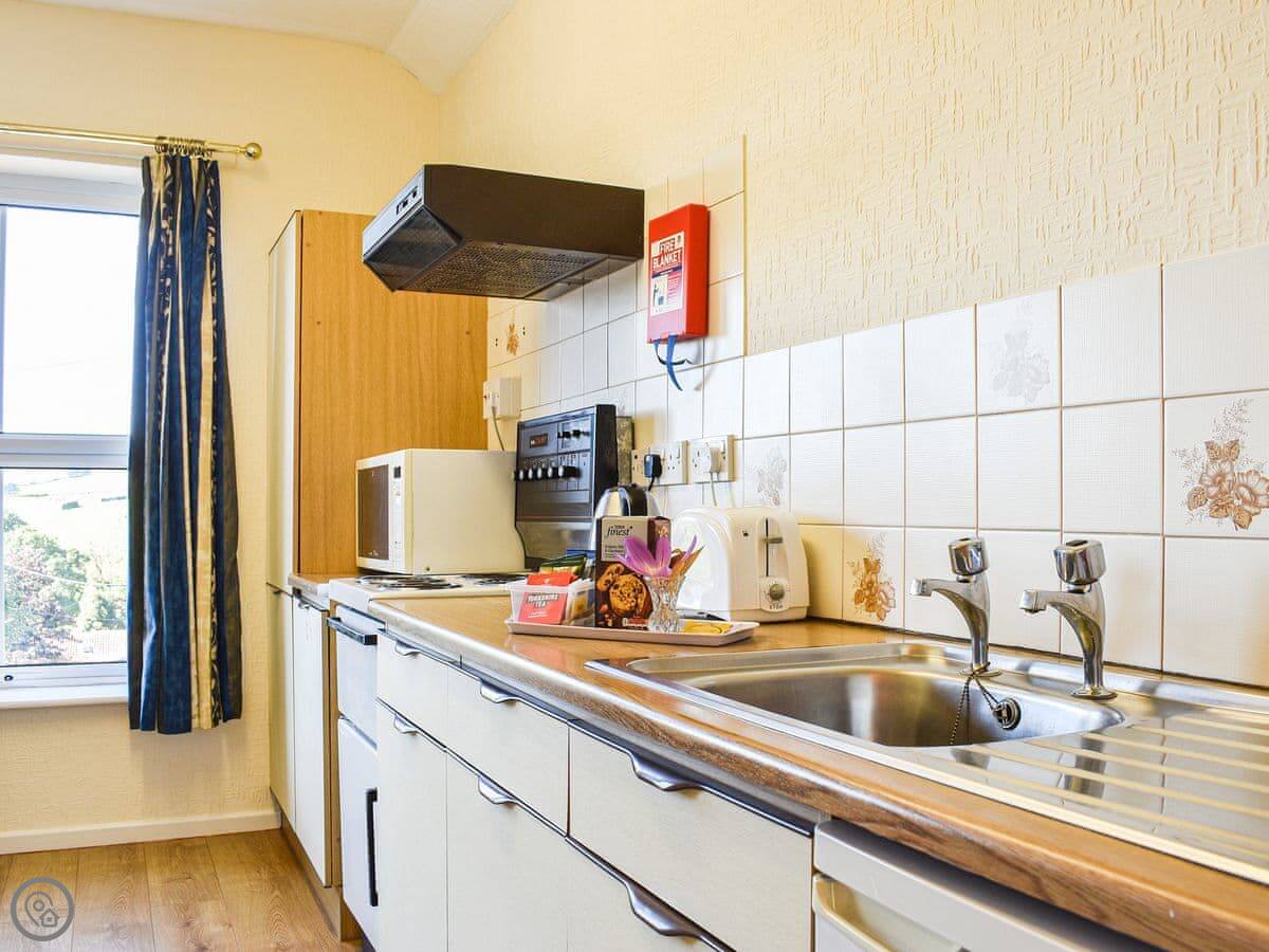 The living area is open plan. There's a table by the window where you can sit and look out over the village and the moors. The sofa faces an electric fire. The kitchen has what you need.