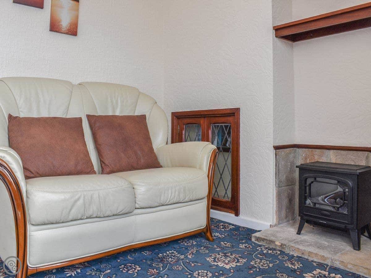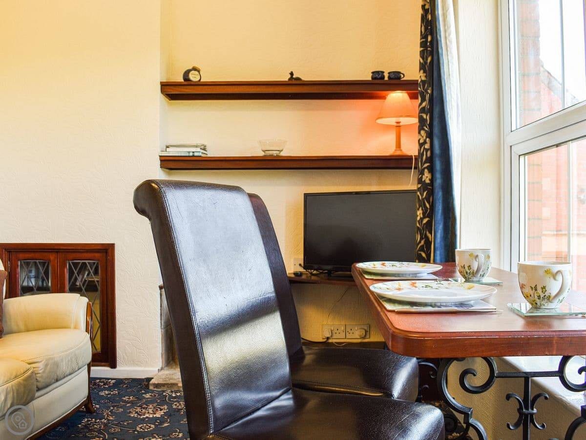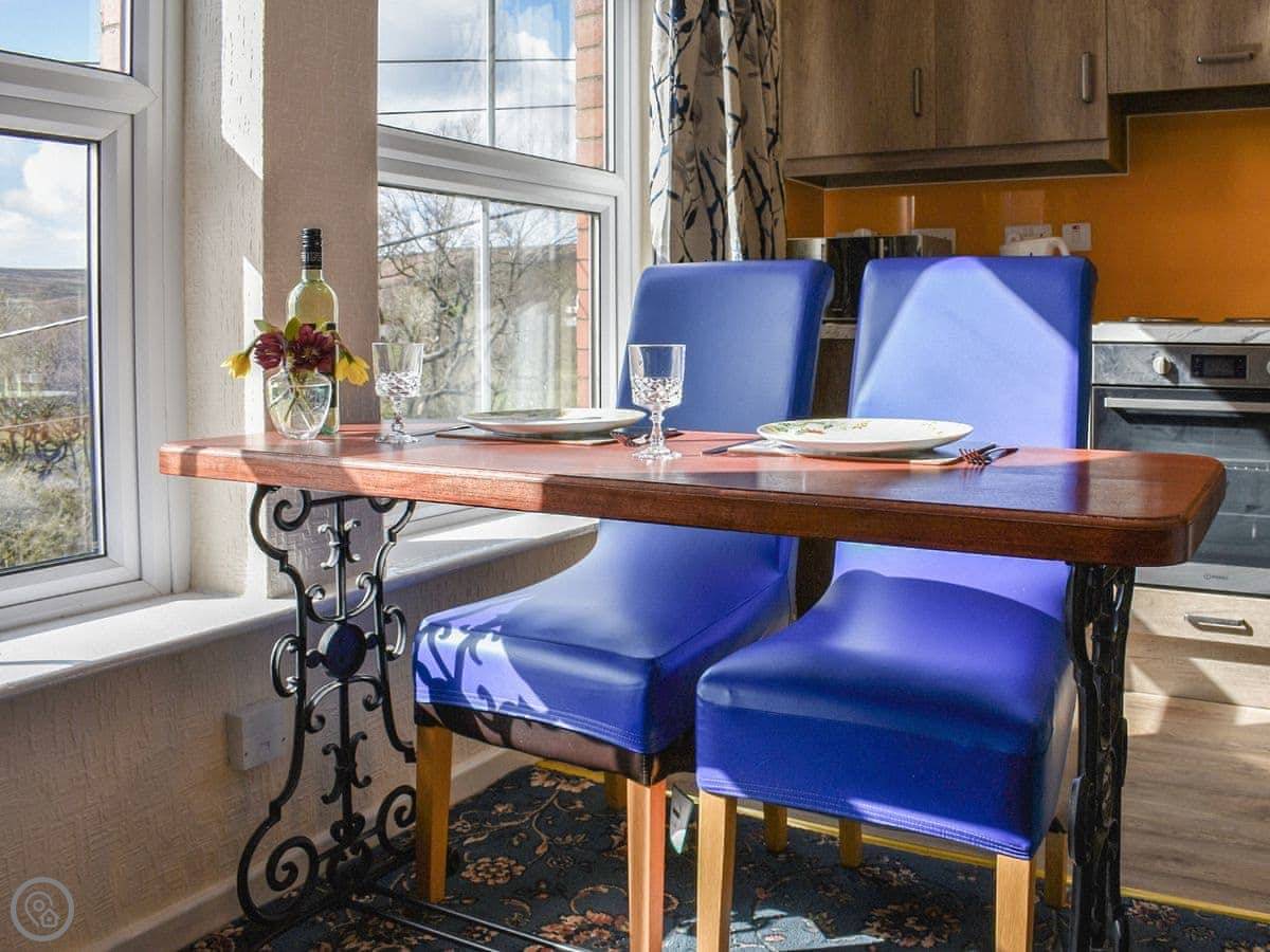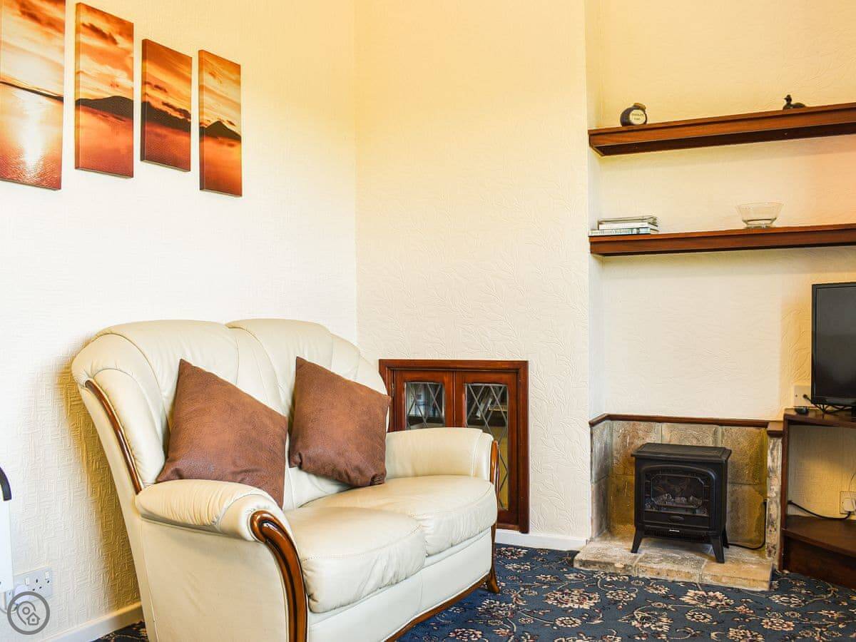 The living area is open plan. There's a table by the window where you can sit and look out over the village and the moors. The sofa faces an electric fire. The kitchen has what you need.