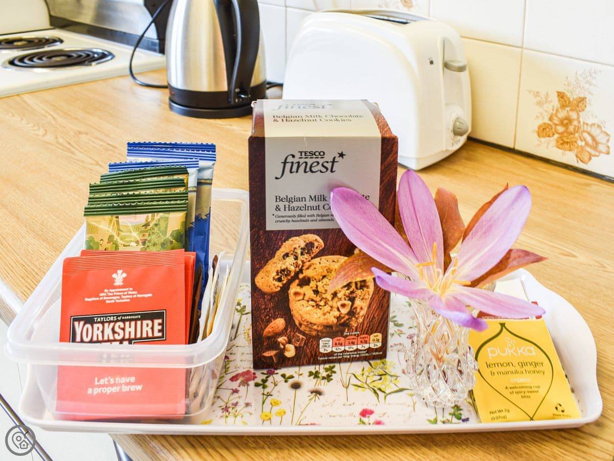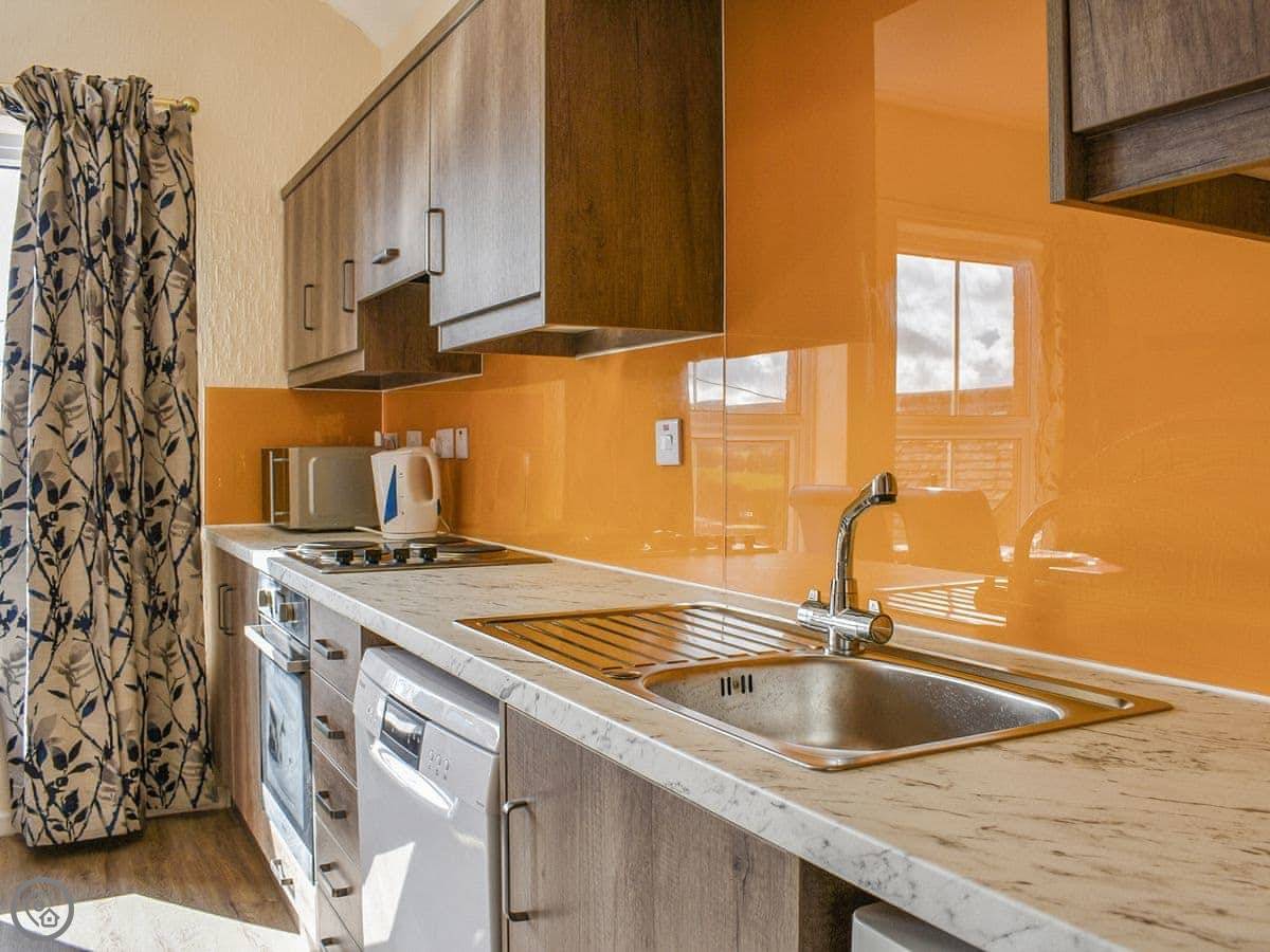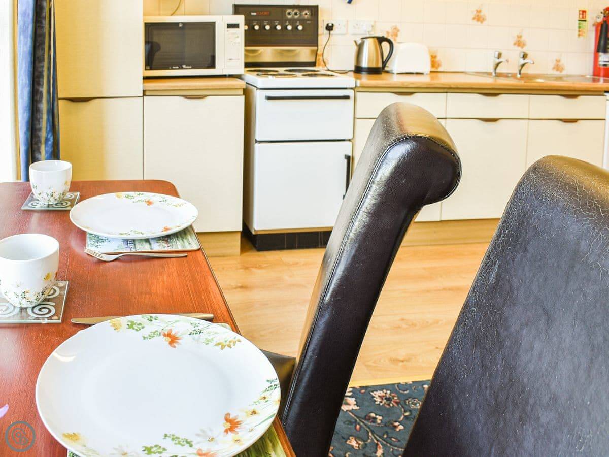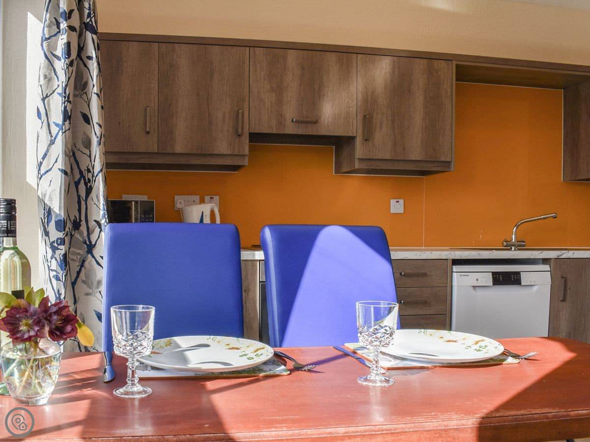The living area is open plan. There's a table by the window where you can sit and look out over the village and the moors. The sofa faces an electric fire. The kitchen has what you need.