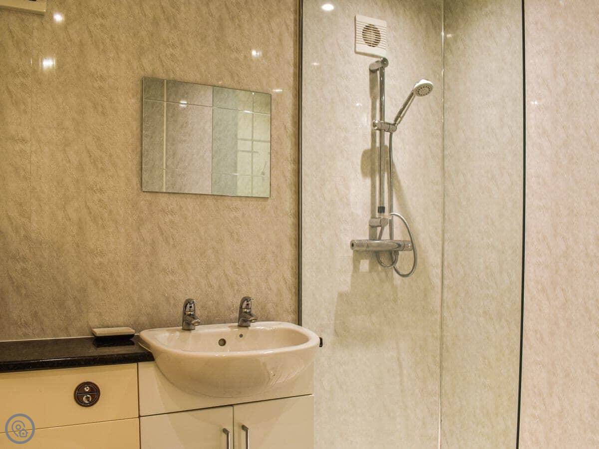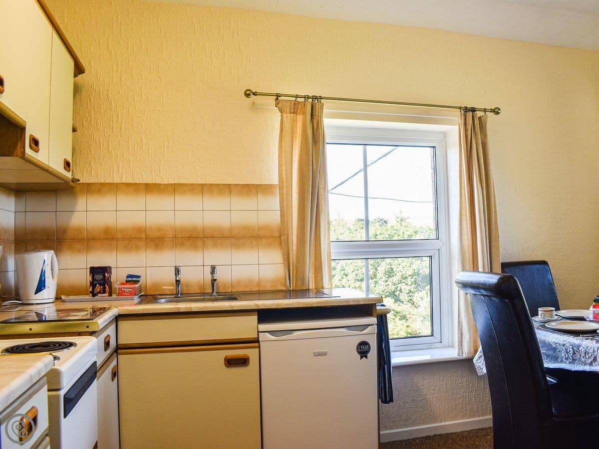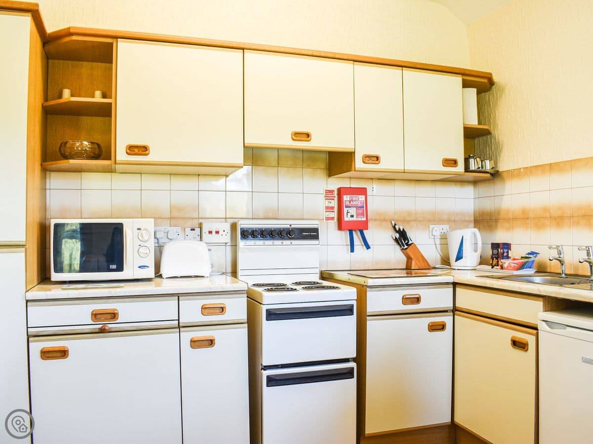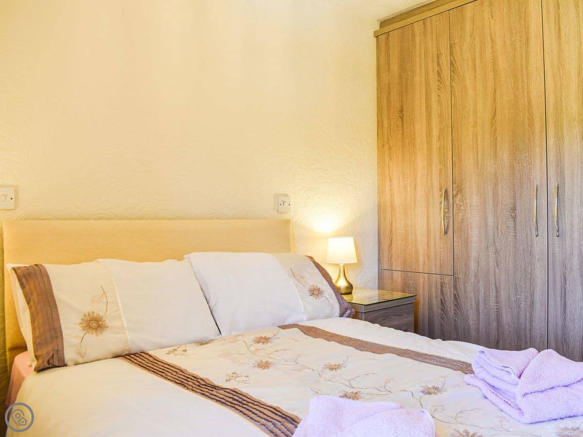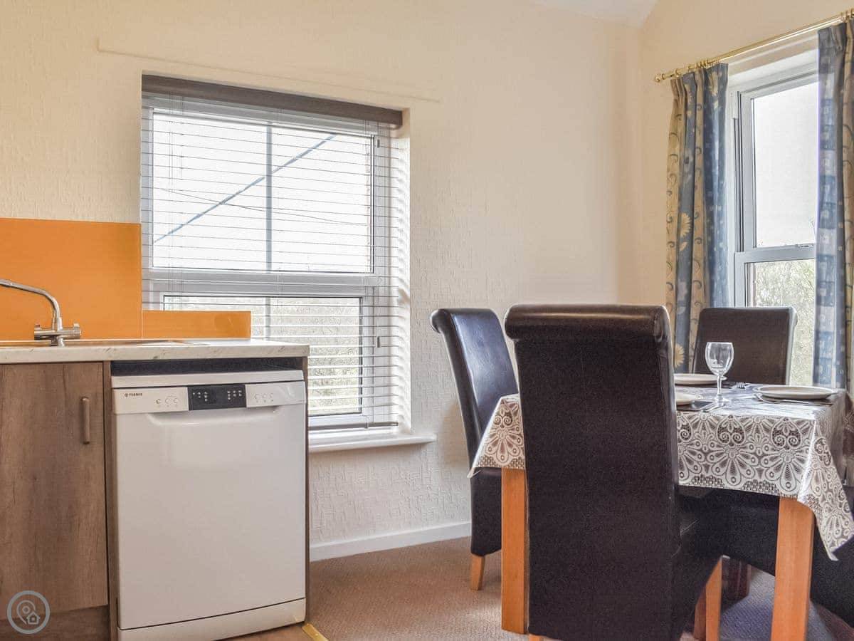 It sleeps four. Two bedrooms, one double and one twin. One bathroom with a walk-in shower. It's got a 3 Star rating, so it's comfortable and clean. The kitchen has what you need, including a dishwasher and a washing machine.