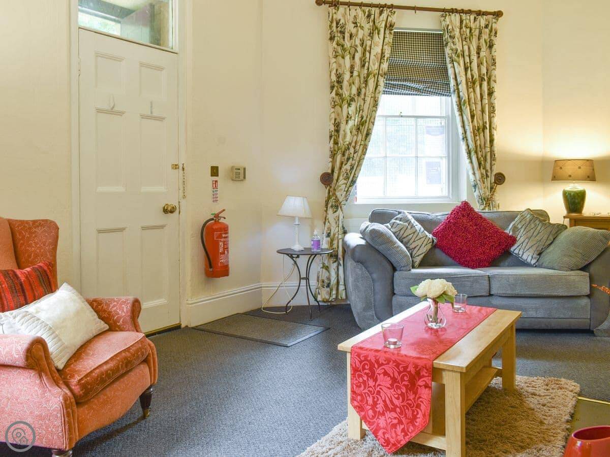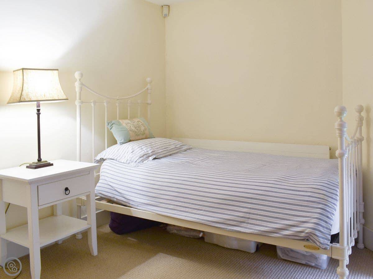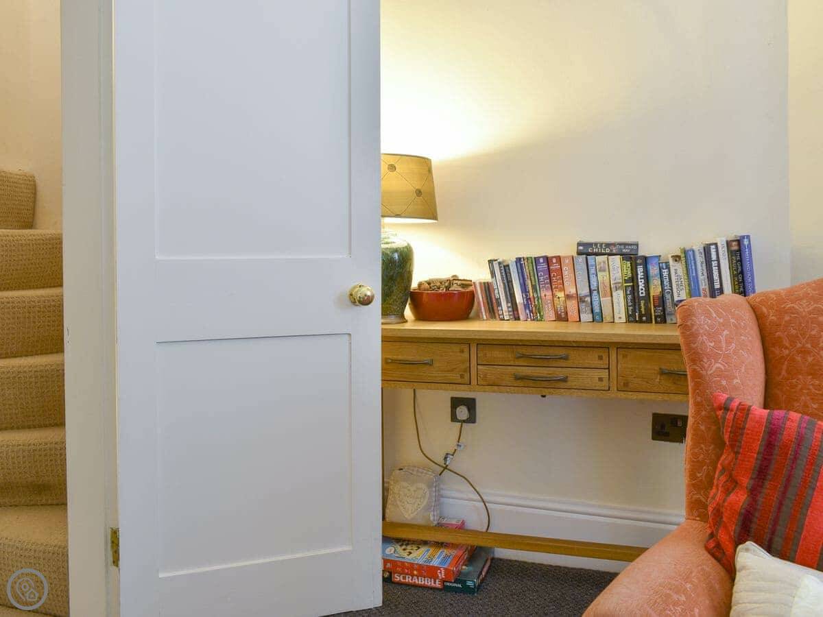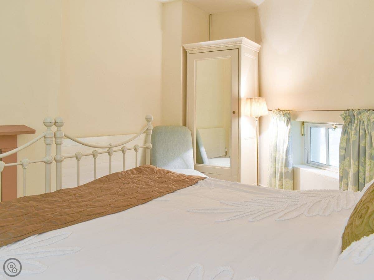 It sleeps four, with two bedrooms and a bathroom upstairs. It's got a 3 Star rating. The stairs are steep and there aren't any handrails. The lighting's mostly from lamps because of the listing rules. It's fine if you're careful.