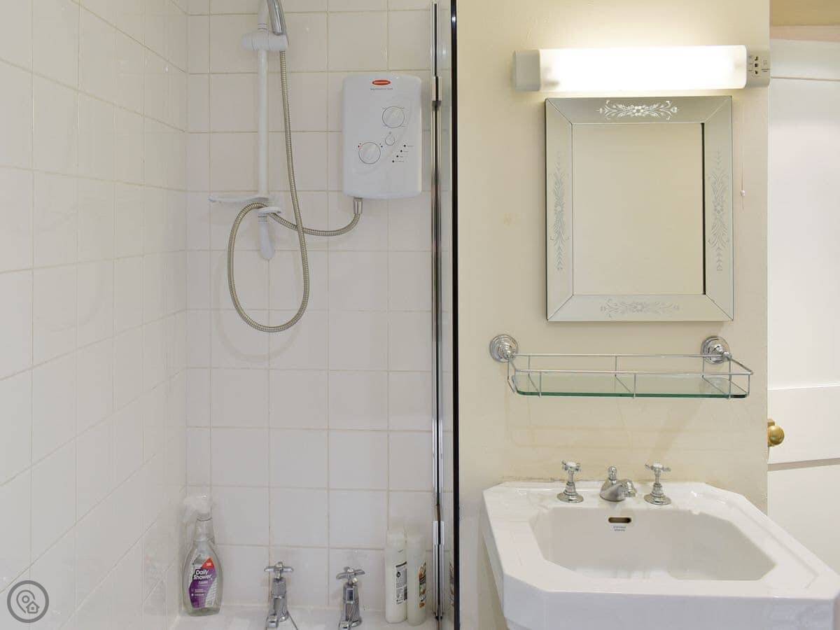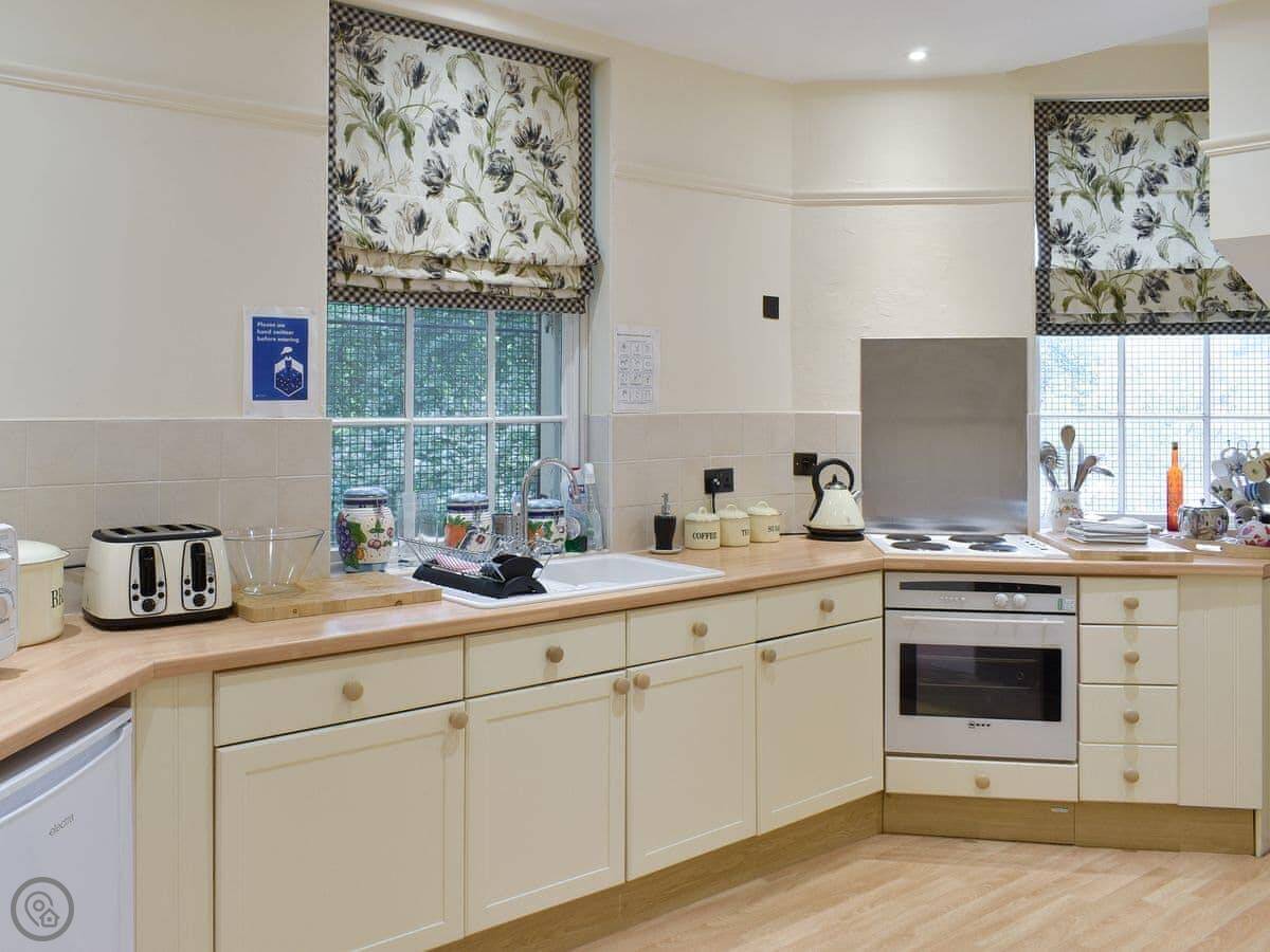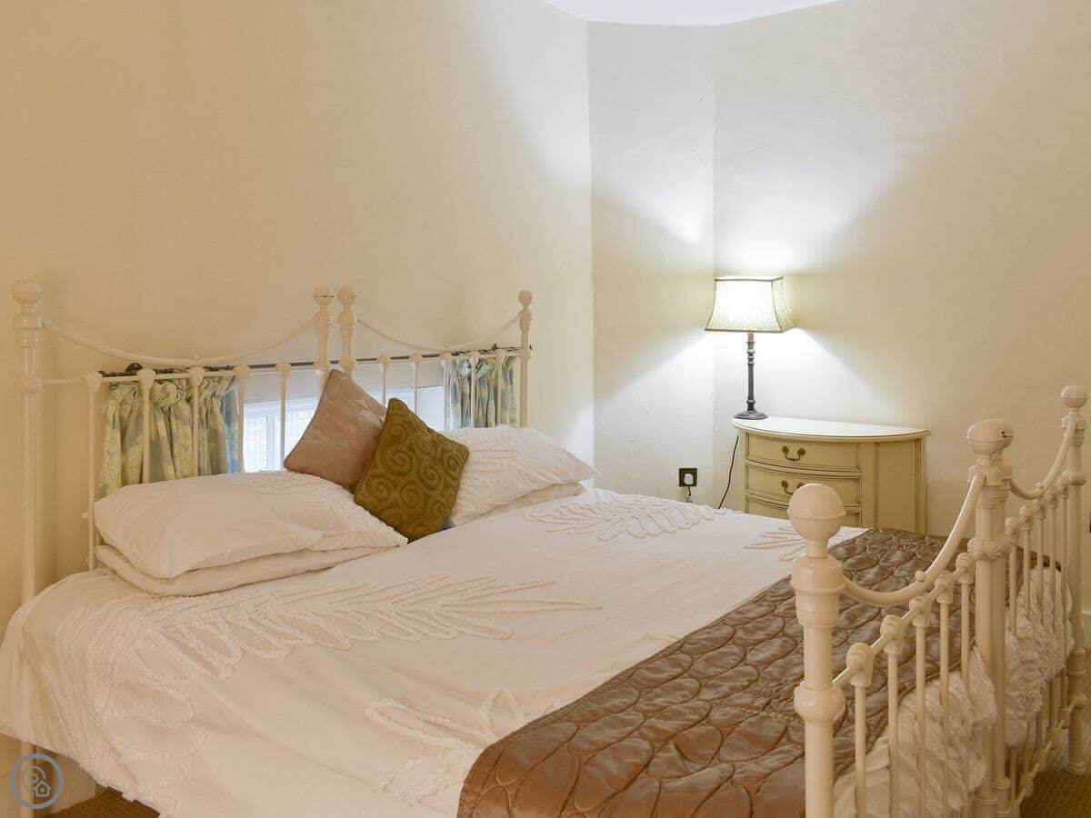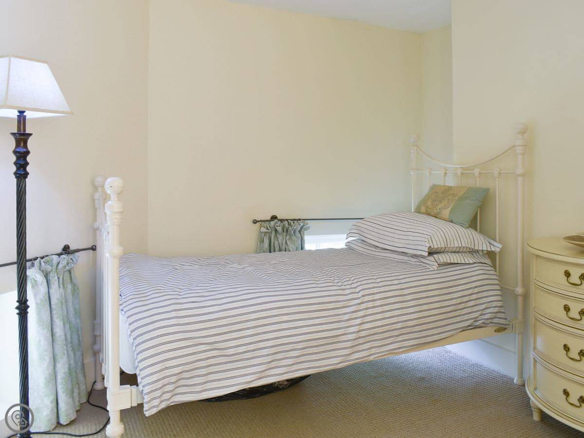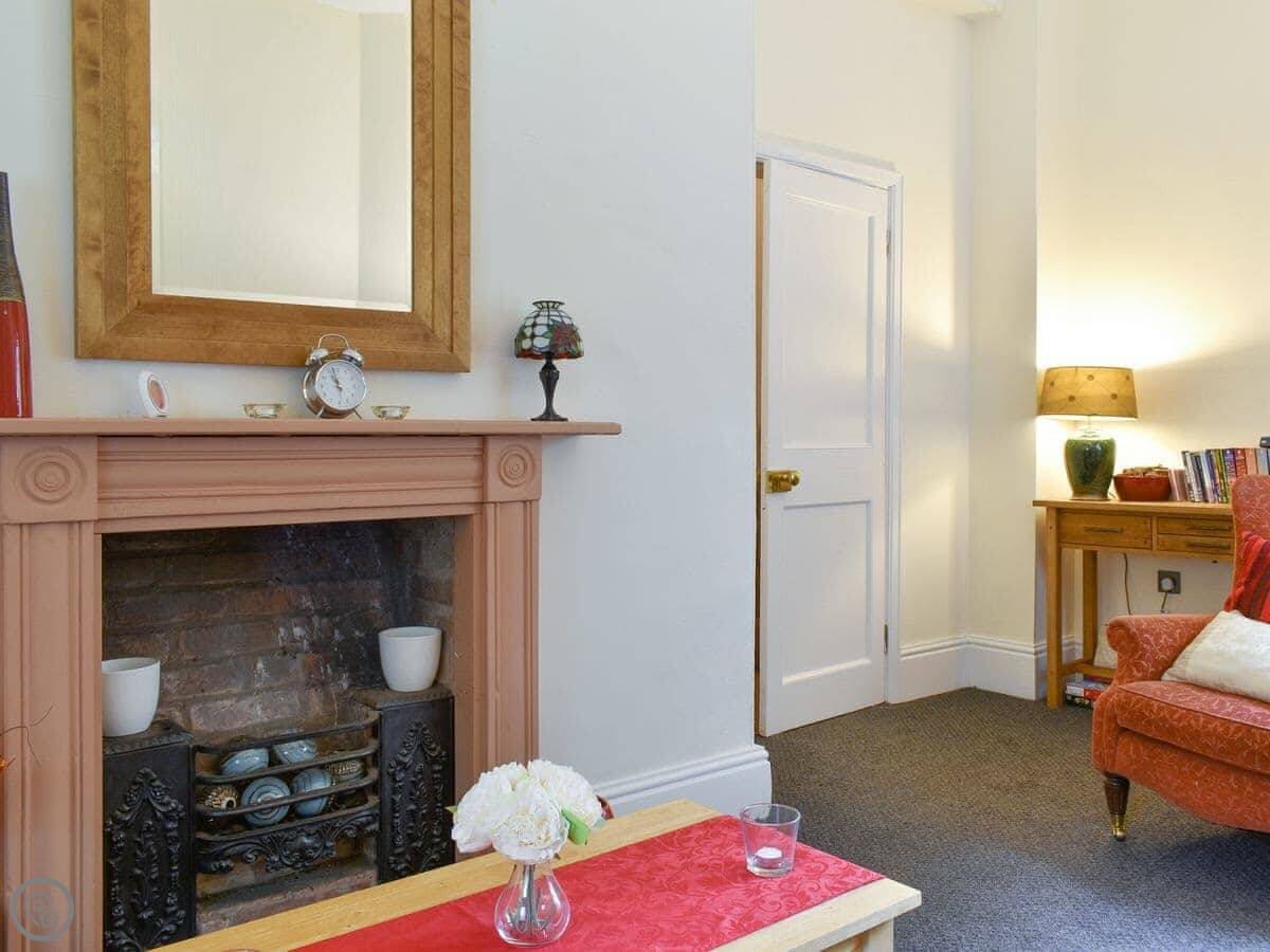 It sleeps four, with two bedrooms and a bathroom upstairs. It's got a 3 Star rating. The stairs are steep and there aren't any handrails. The lighting's mostly from lamps because of the listing rules. It's fine if you're careful.