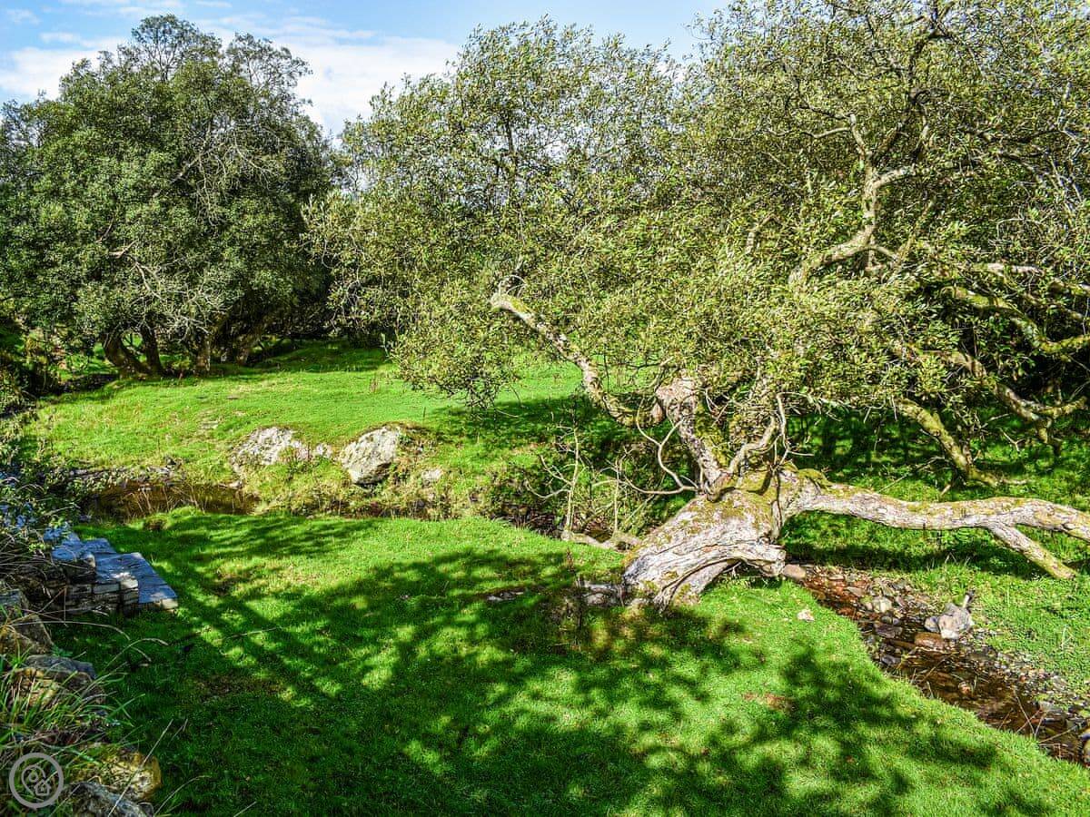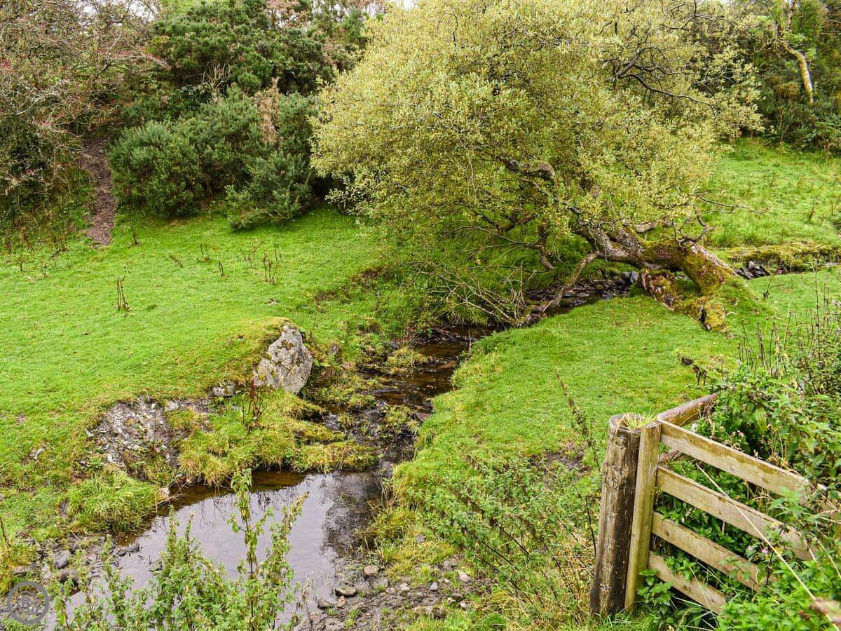 The garden is partly enclosed with a patio and some furniture. There's a field next to it where horses sometimes graze. A gate at the side leads down to a small stream. It's not always accessible, as it depends on the livestock. Please shut the gate.