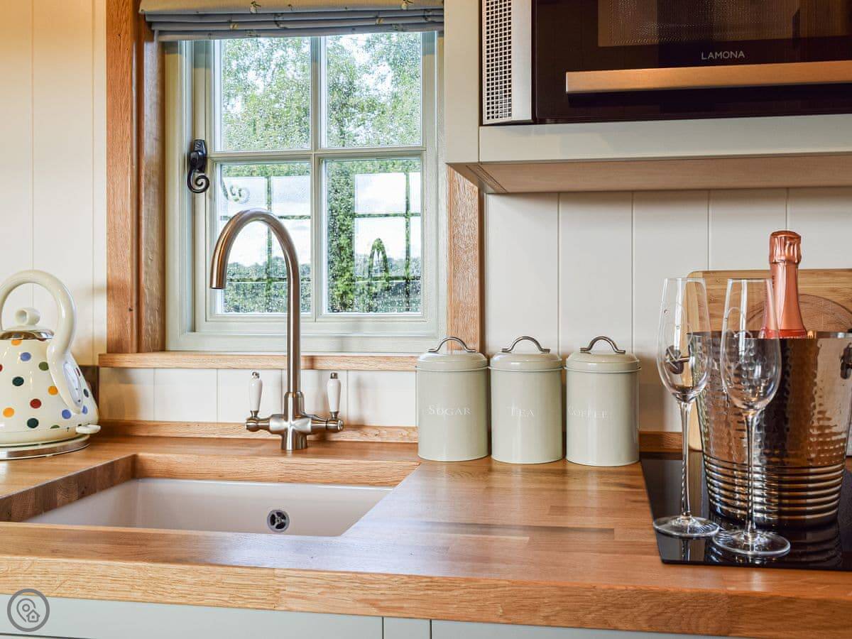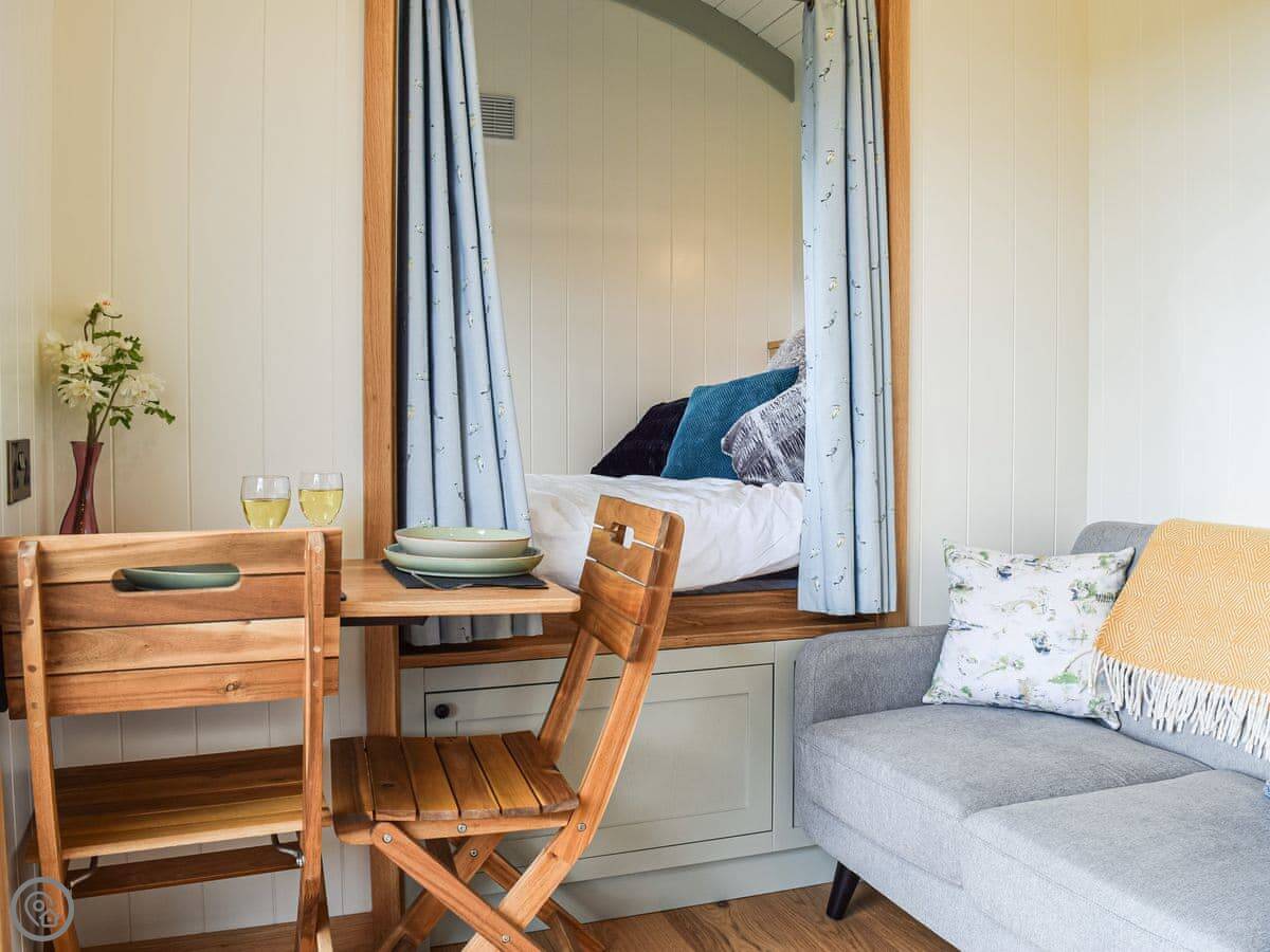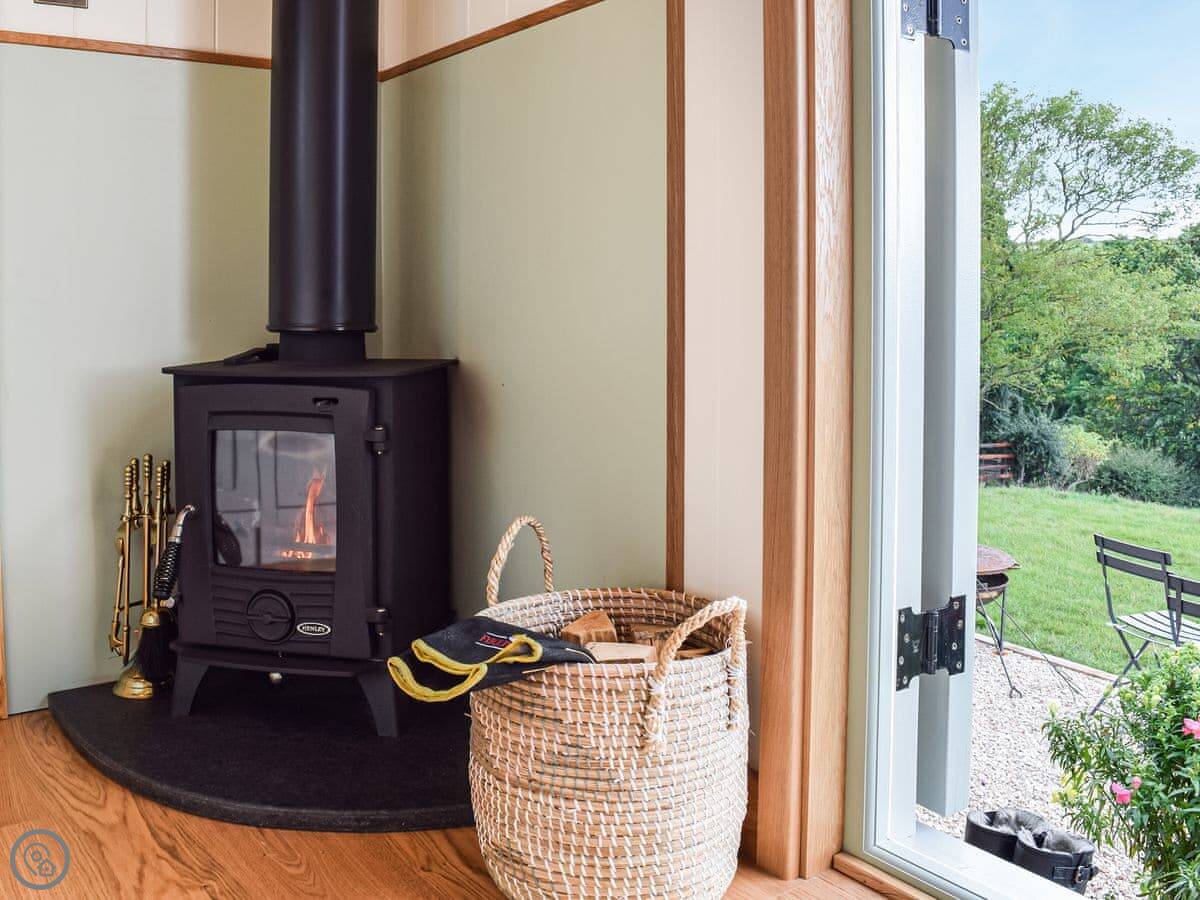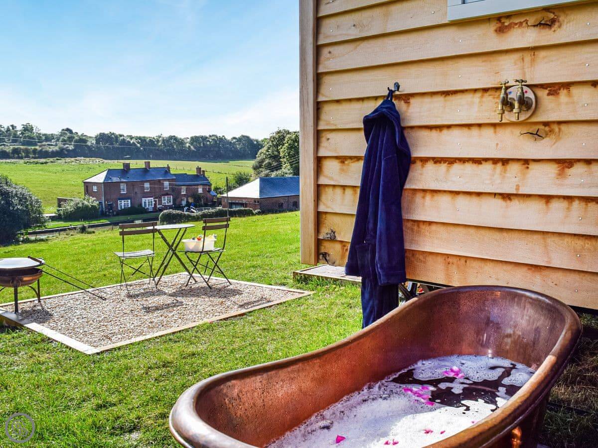 It's a 4 Star place, so it's comfortable and well-equipped. It's got a wood burner and underfloor heating, so it's cosy in winter. There's a small kitchen area, a shower room, and a double bed. The main thing is the outdoor copper bath on the decking. It's private, but you are in a field. There's also a firepit.