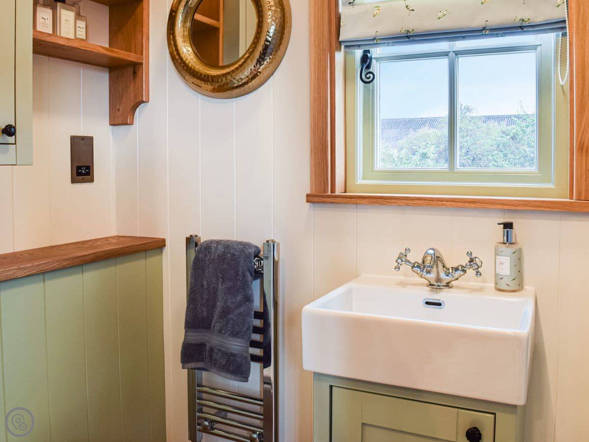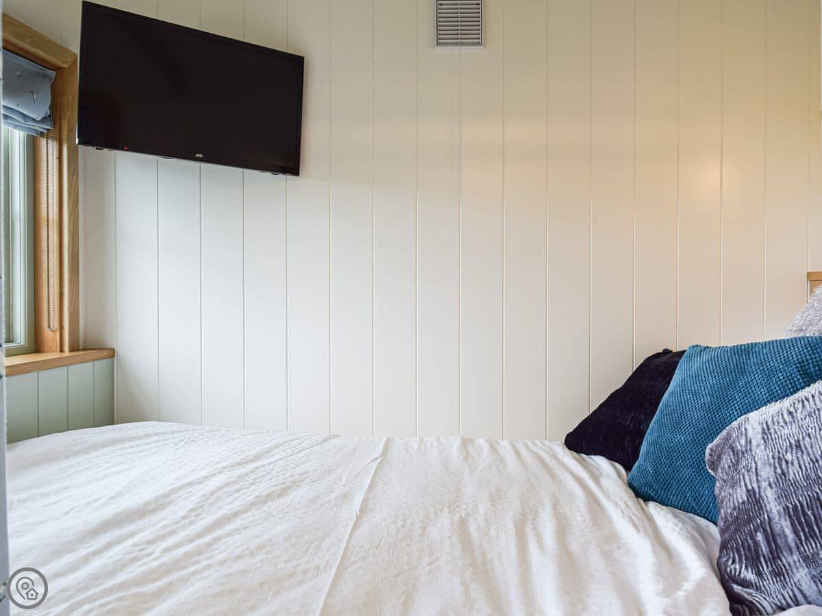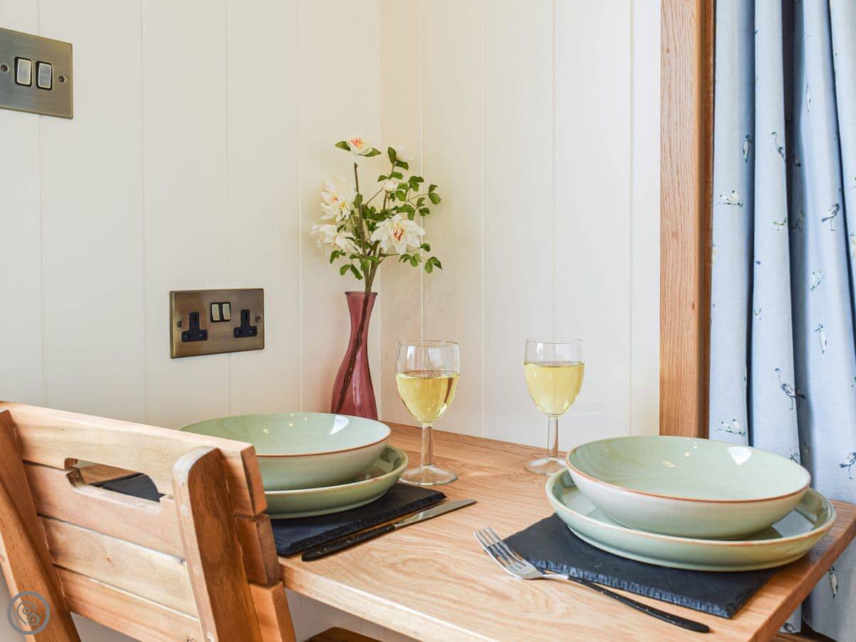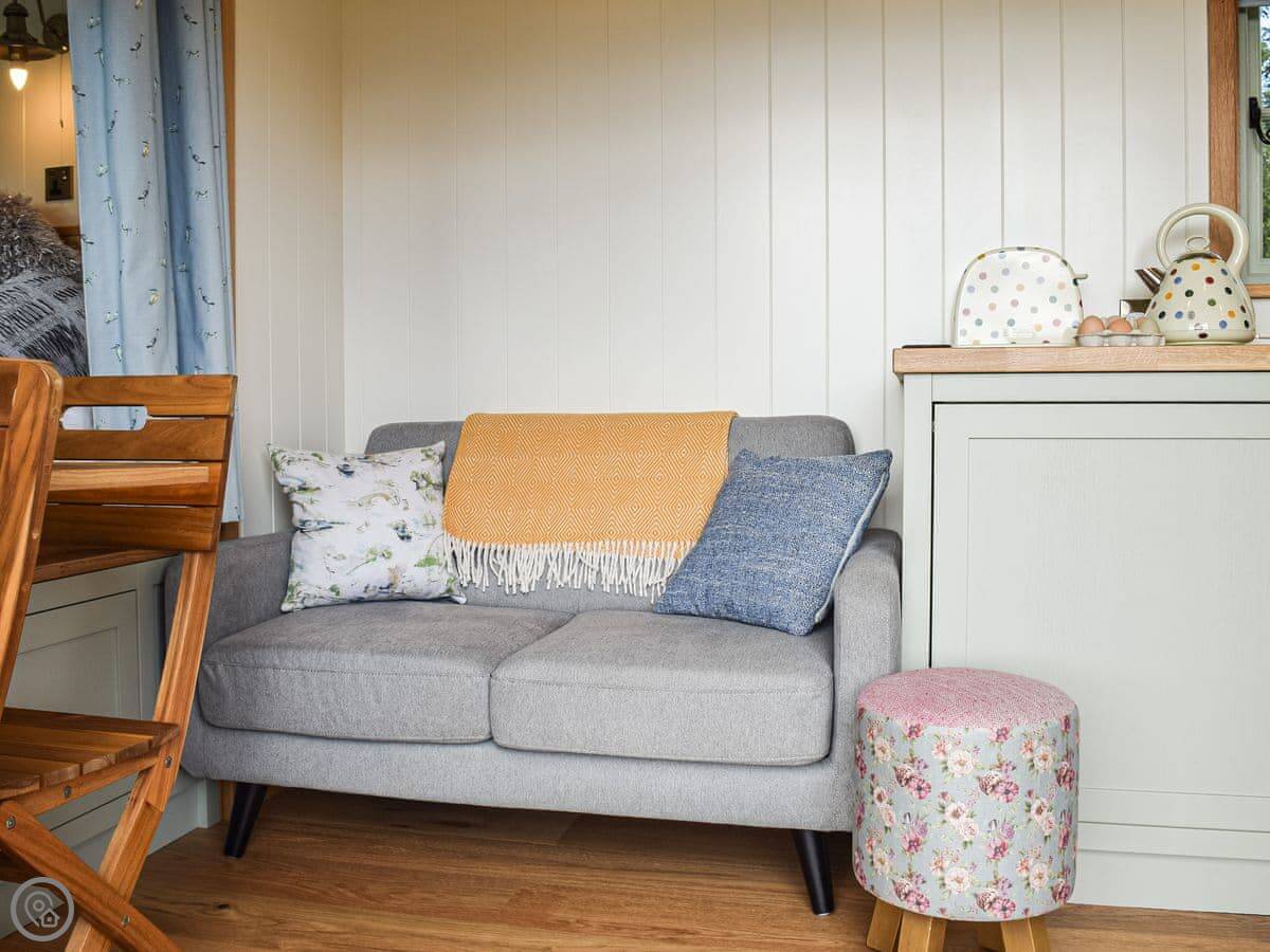 It's a 4 Star place, so it's comfortable and well-equipped. It's got a wood burner and underfloor heating, so it's cosy in winter. There's a small kitchen area, a shower room, and a double bed. The main thing is the outdoor copper bath on the decking. It's private, but you are in a field. There's also a firepit.