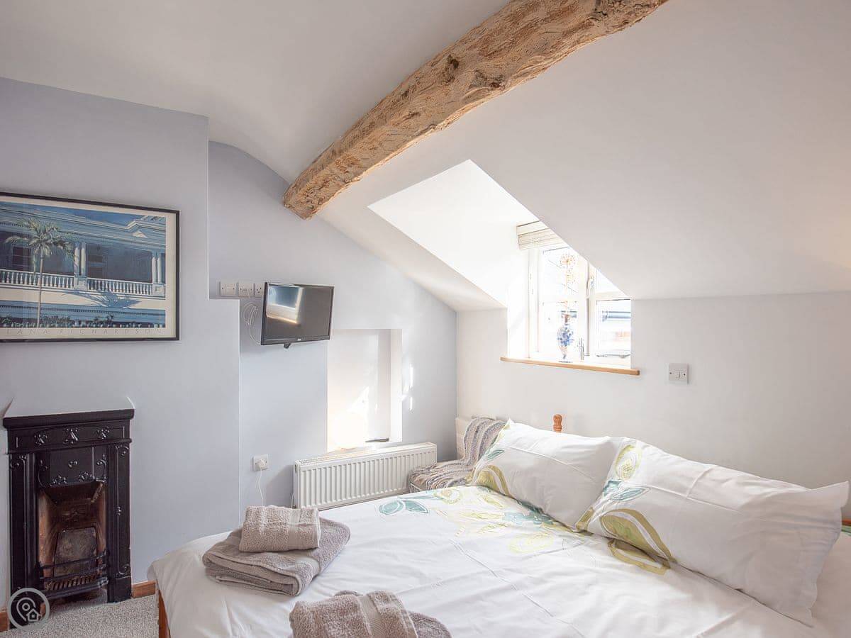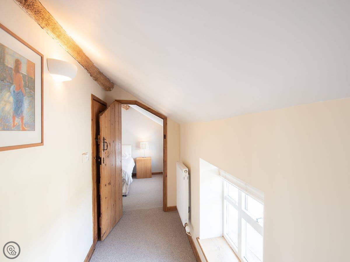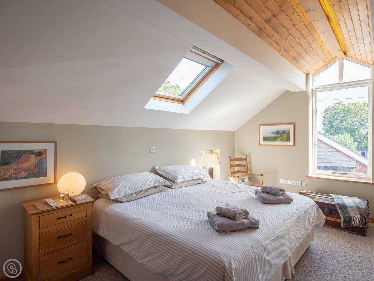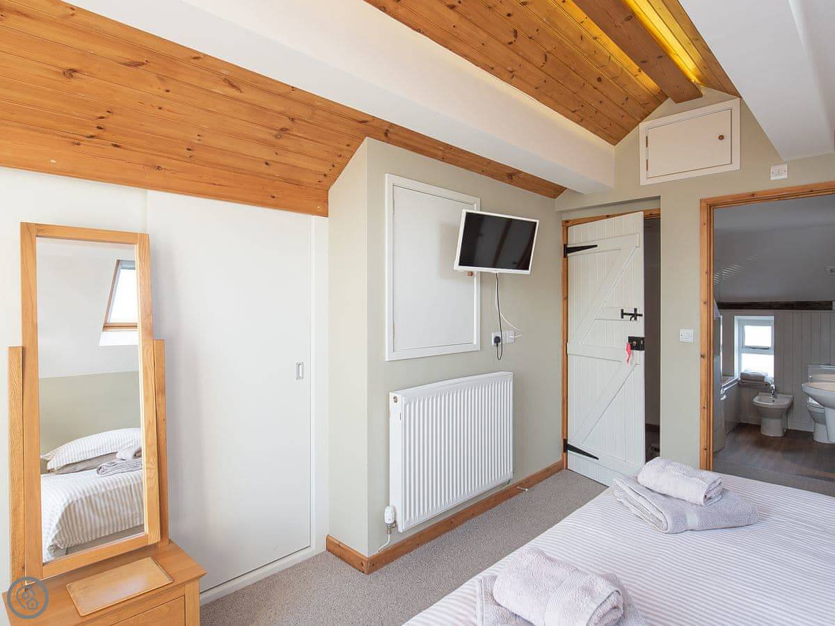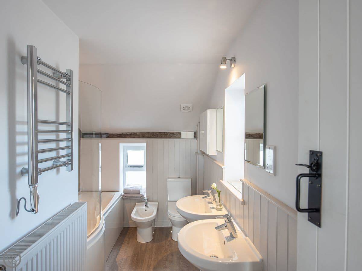 It sleeps six. Three bedrooms, all with their own bathroom. That's useful. It's got a 4 Star rating. The kitchen has a Rayburn, which is a solid old cooker, and an electric hob and oven. The living room has a wood burner. There's a patio and a garden at the back, it's private.