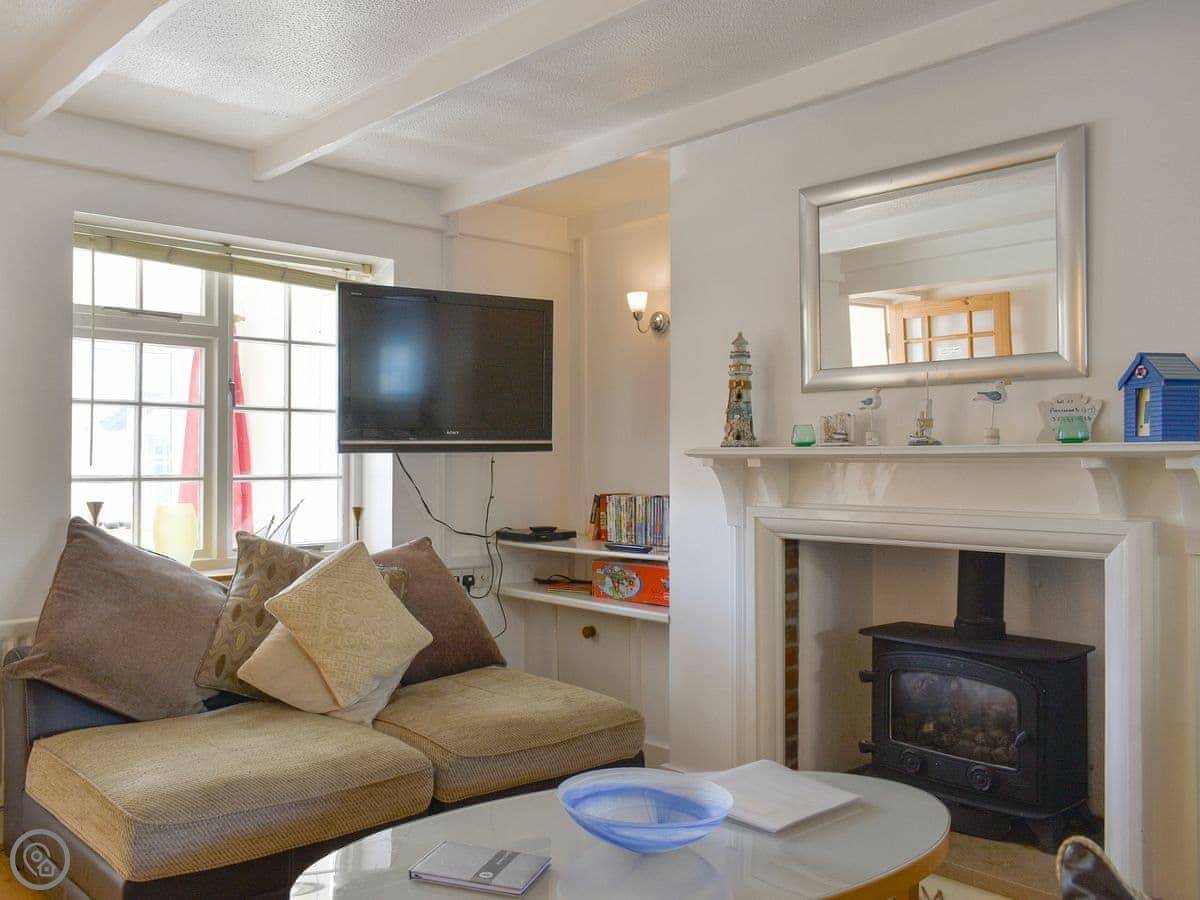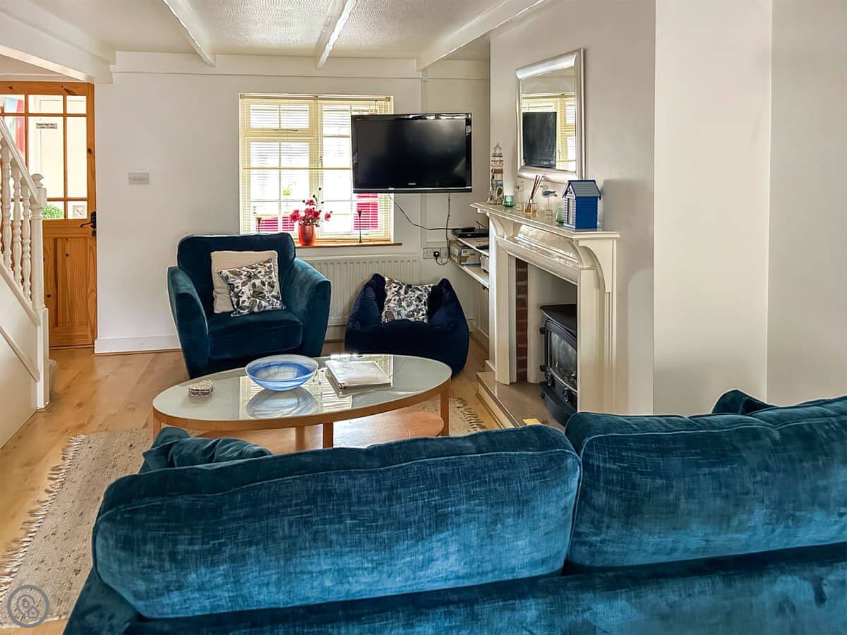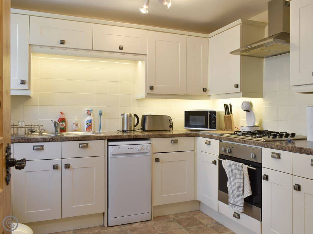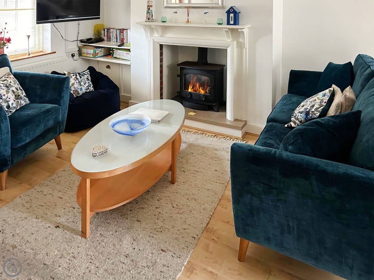 The living room is a decent size. There's a table for eating, a sofa, and a TV with Freeview. The gas stove works fine when it gets cool in the evenings. The kitchen has what you'd expect: fridge, oven, washing machine, and a dishwasher.