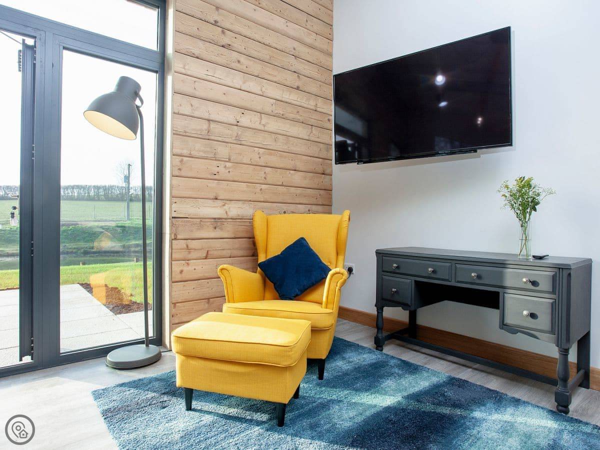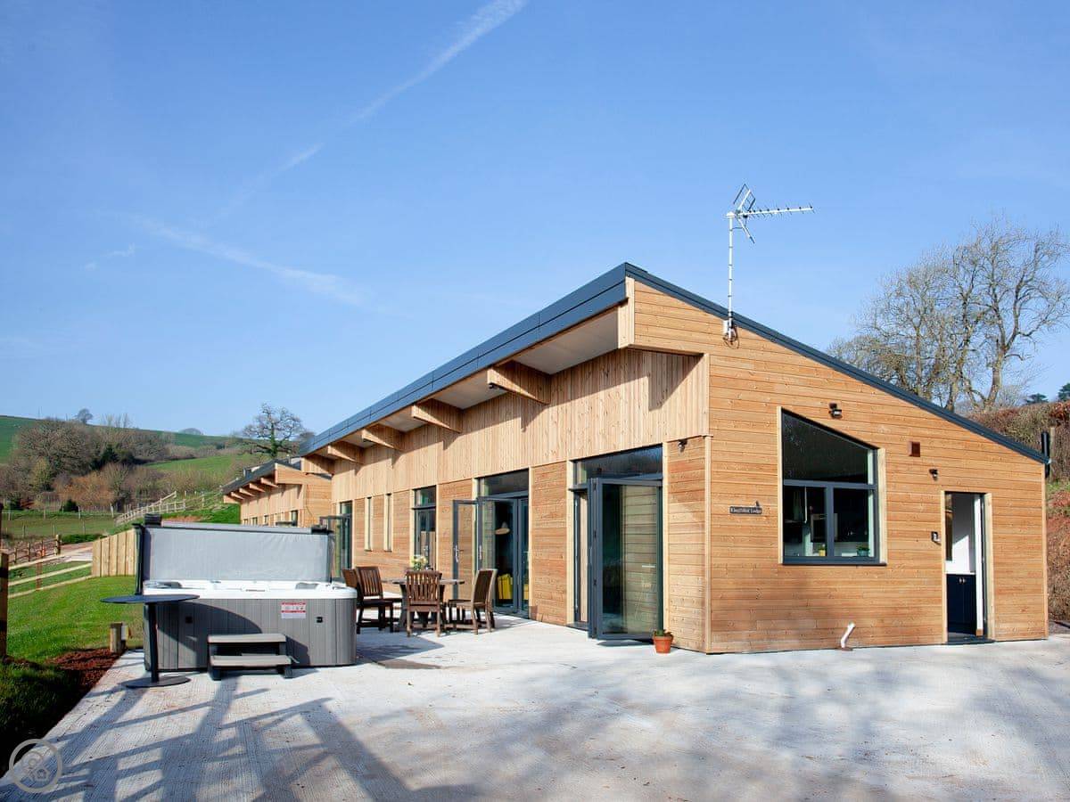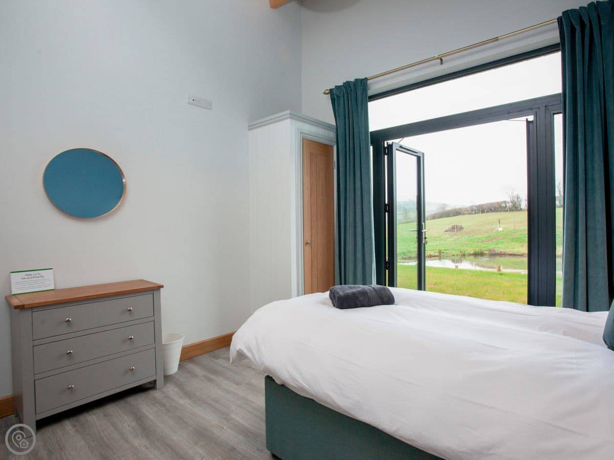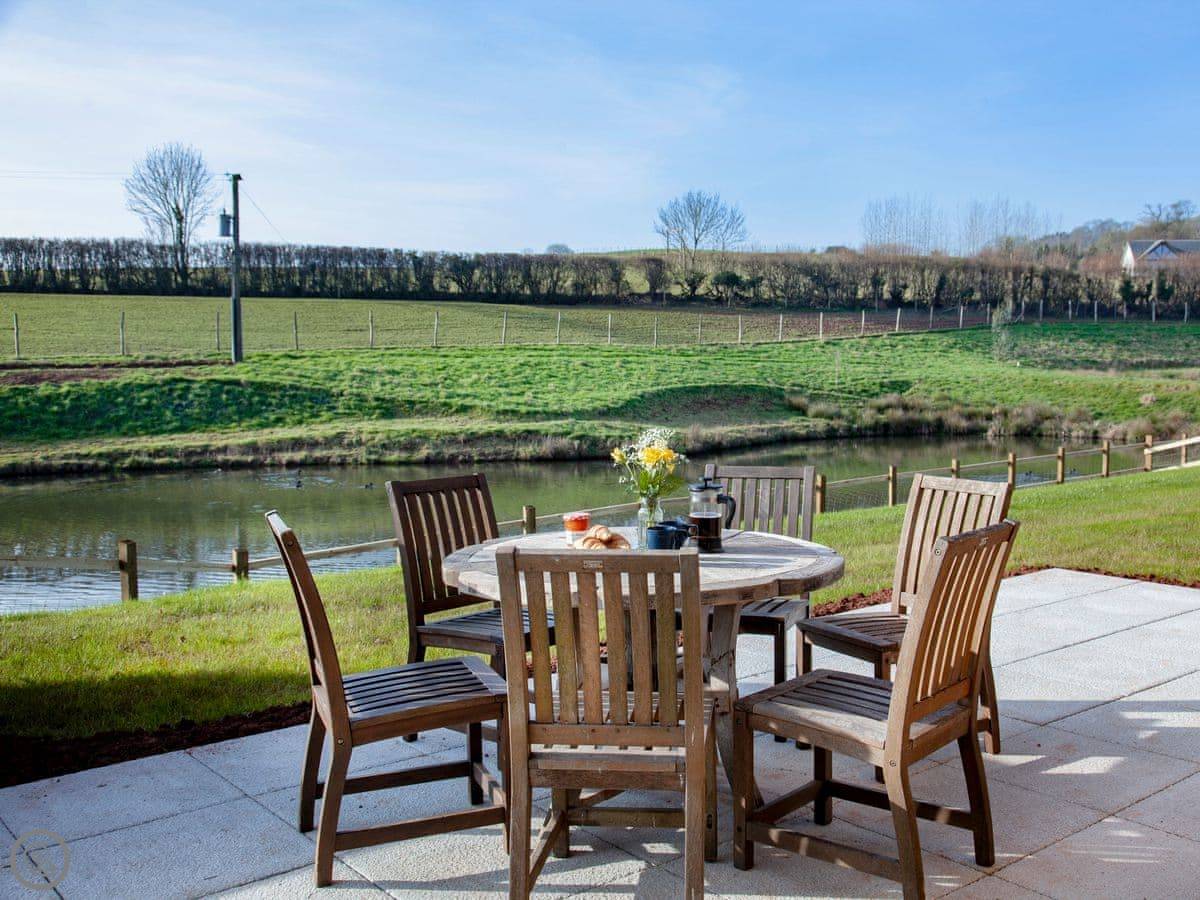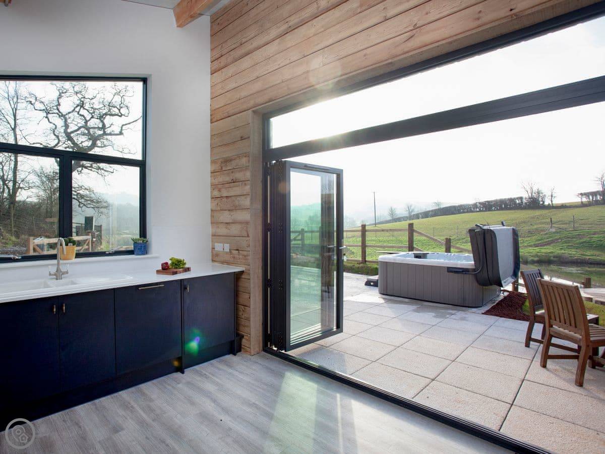 This is Kingfisher Lodge, out at East Dunster Deer Farm near Cadeleigh. It's detached, so you're on your own. It looks over a couple of ponds and the deer fields. The view is just fields and hills, really peaceful.