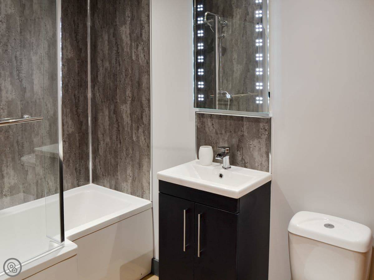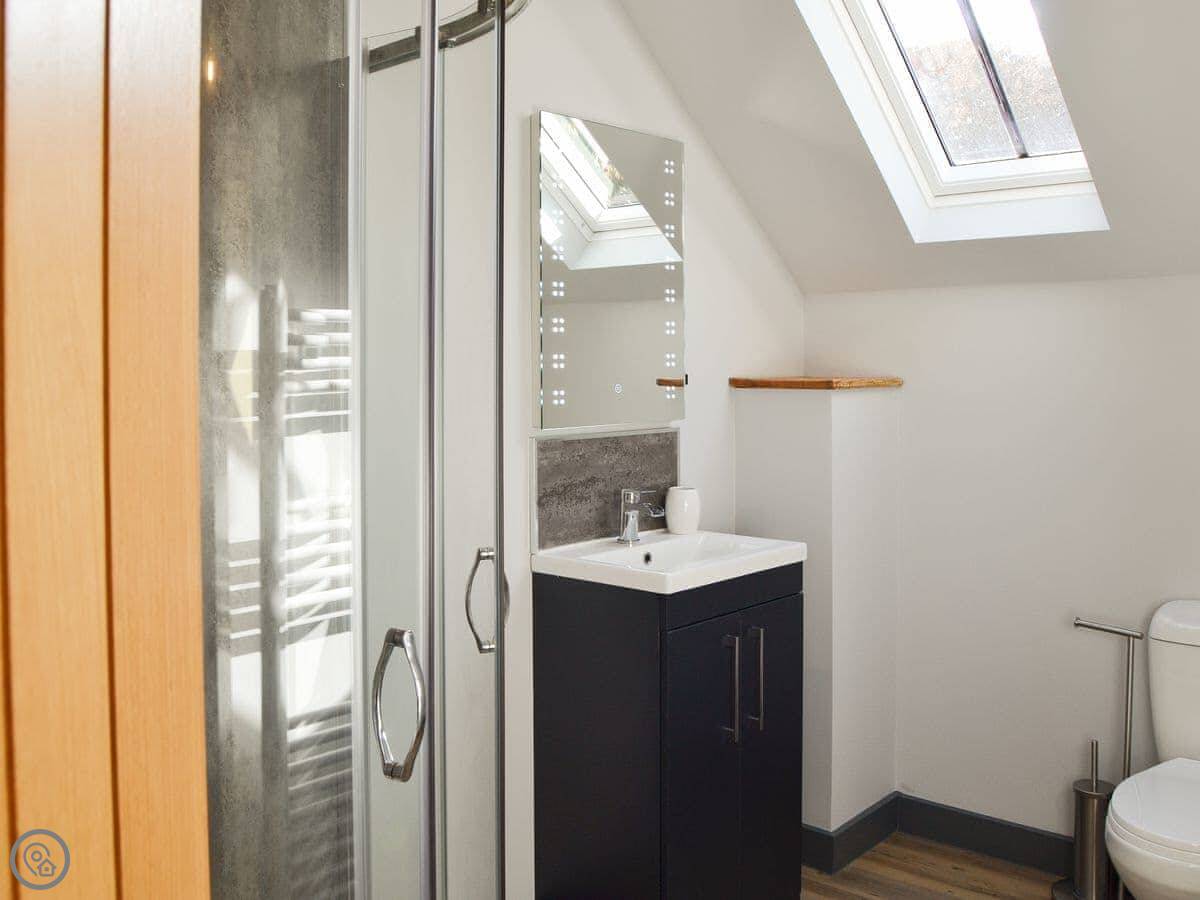 It sleeps six in three bedrooms. Each bedroom has its own ensuite bathroom, so no queues. It's a 5 Star place, which means it's well finished and comfortable. The stairs are normal.