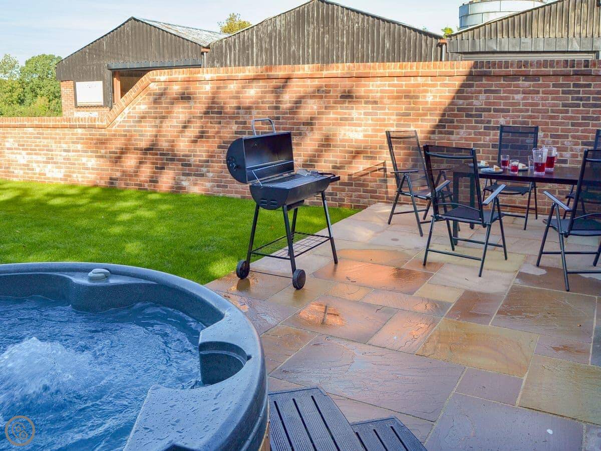 It's all open plan downstairs. The kitchen, living and dining area is one big space. There's an enclosed garden with a patio and lawn. The hot tub is out there. It's private.