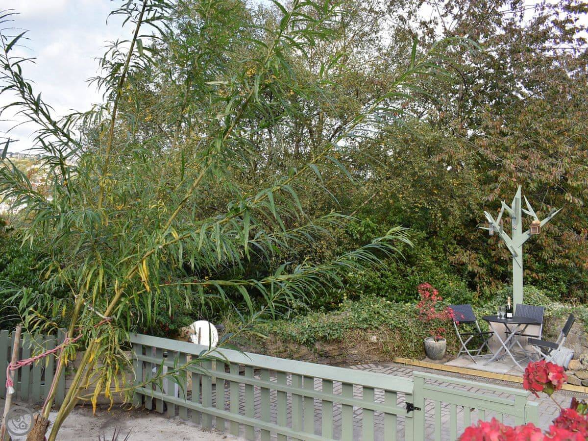 The kitchen is open plan with the sitting area. It has a dishwasher. There's a small patio garden out the back with a table.