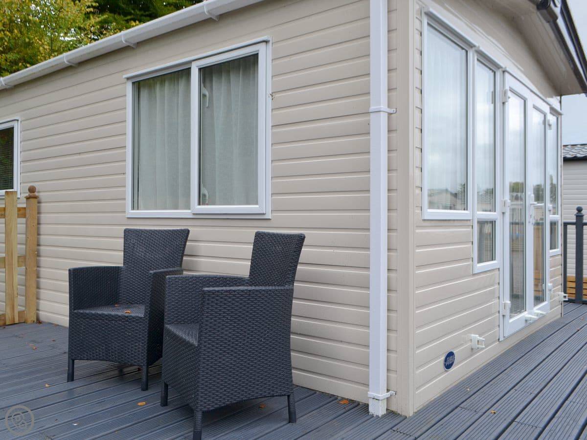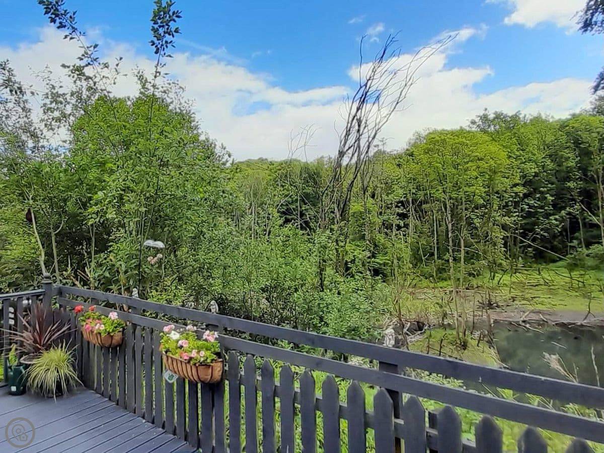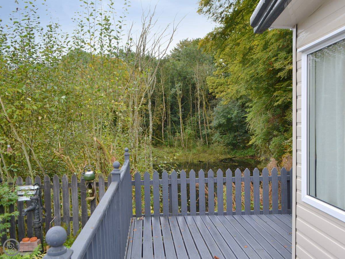 It's on an end plot, so it's detached. You've got decking on two sides. One side looks over a fenced-off pond and some woodland. You'll see birds and squirrels. It's quiet.