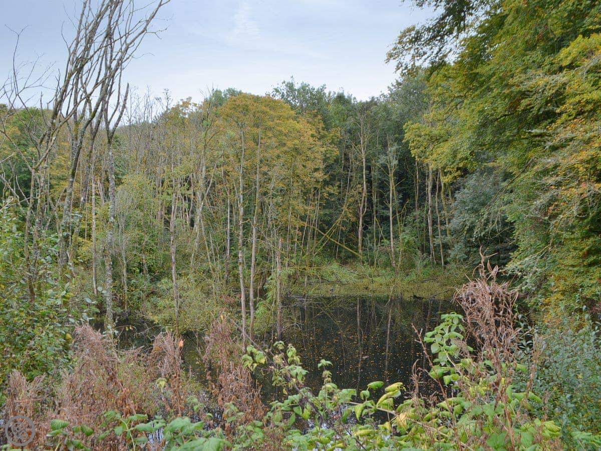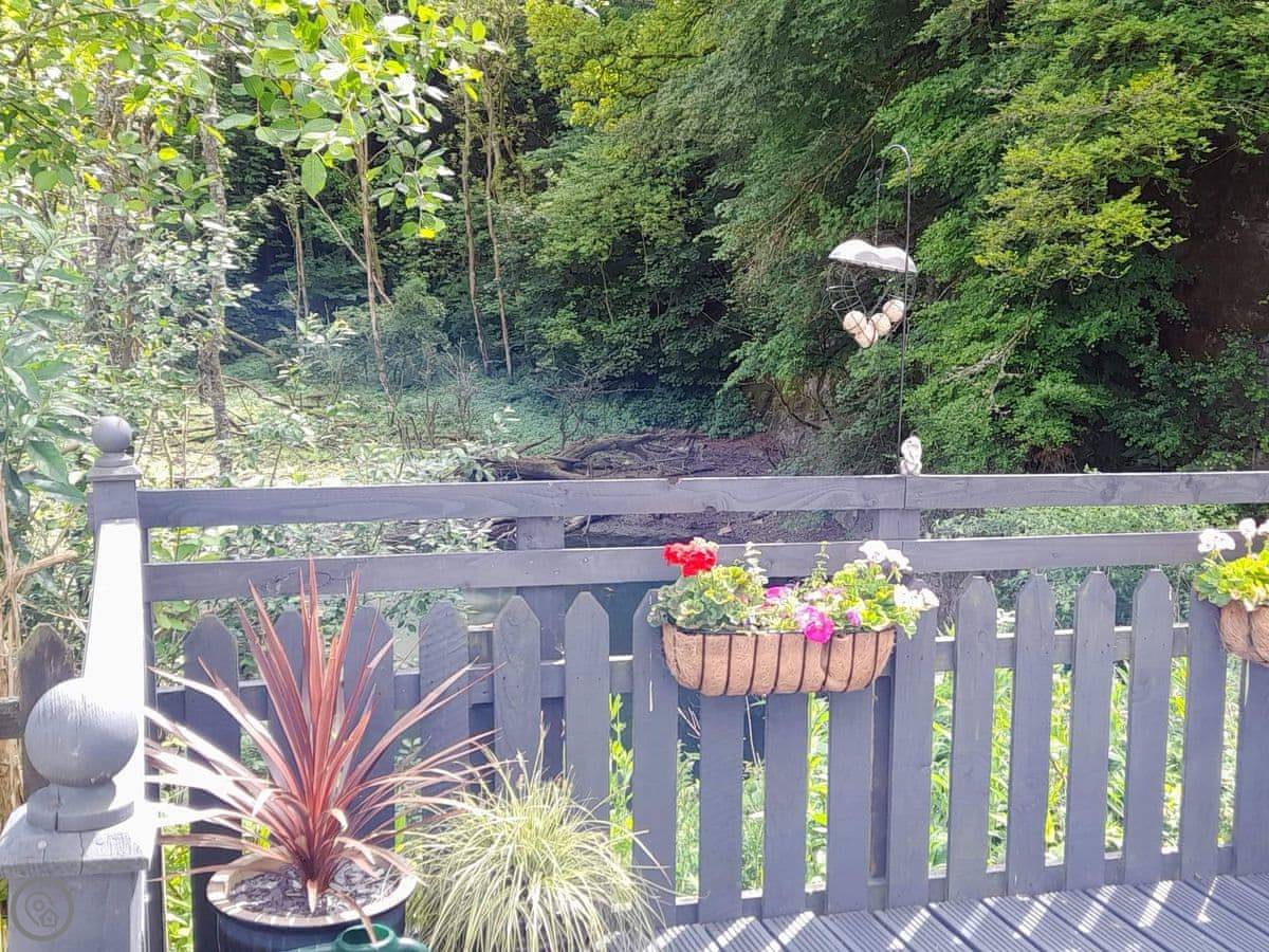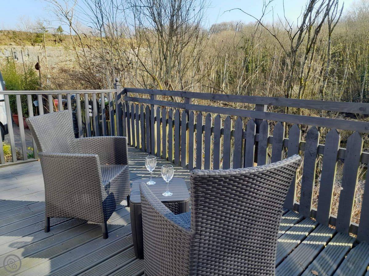 It's on an end plot, so it's detached. You've got decking on two sides. One side looks over a fenced-off pond and some woodland. You'll see birds and squirrels. It's quiet.