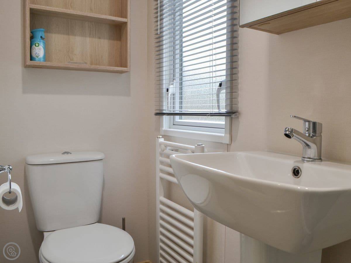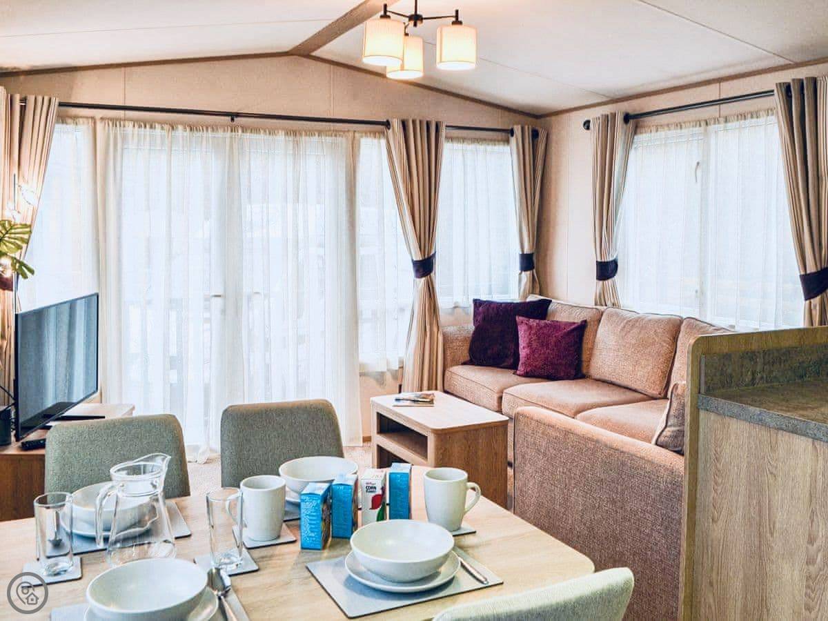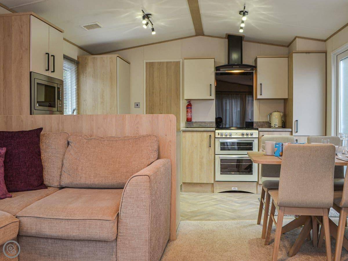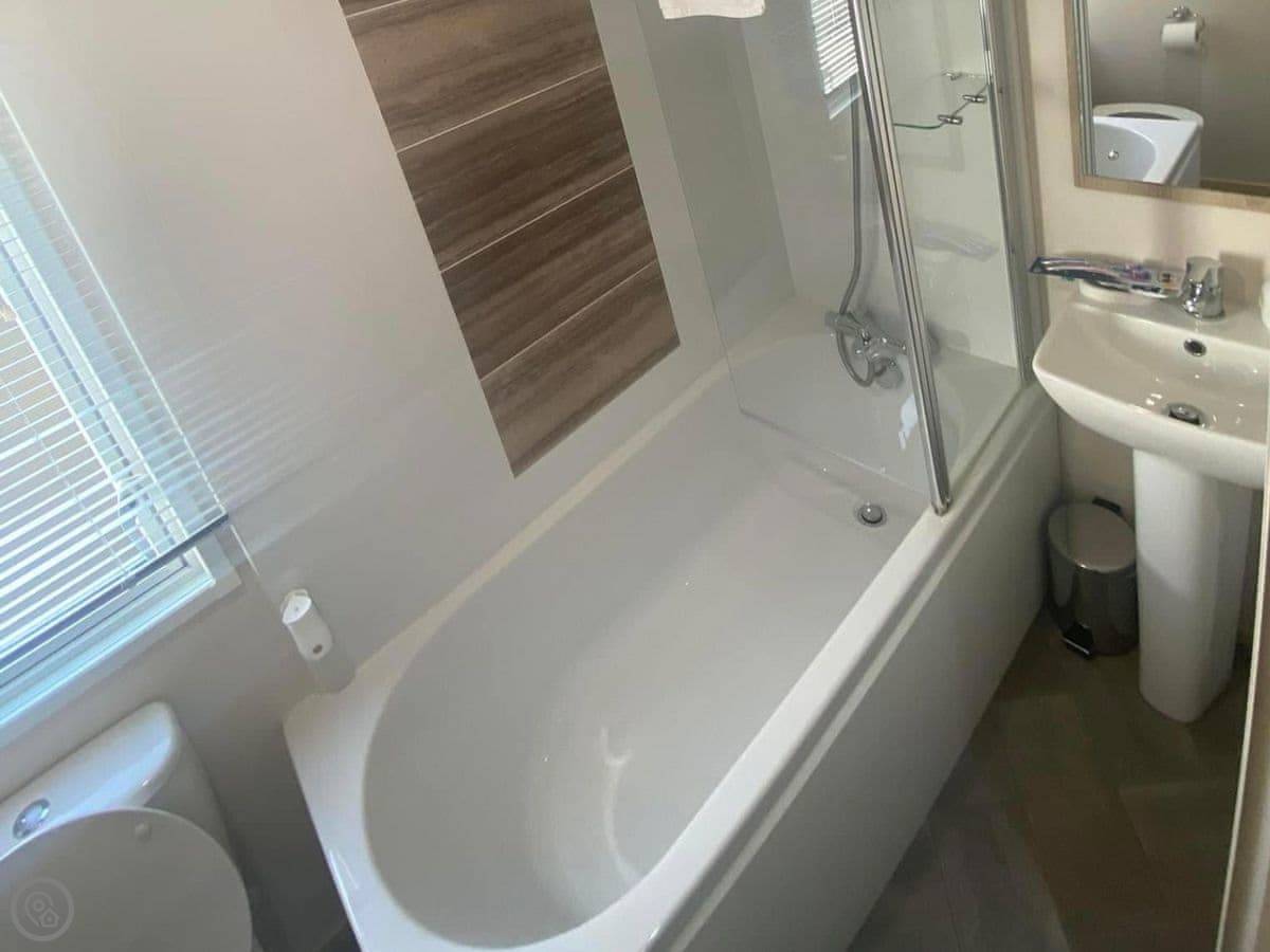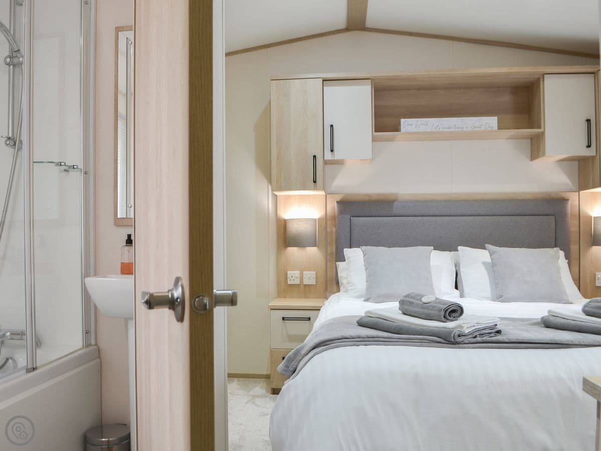 Graylings Rest is a lodge-style caravan on Brigham Holiday Park. It's new, from 2021. It sleeps four, in two bedrooms. One has a king bed with an en-suite bathroom that has a full bath. The other has twin beds. There's a second bathroom with a shower.