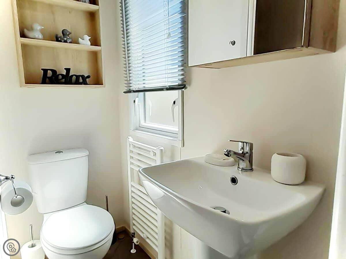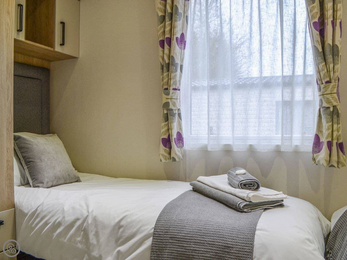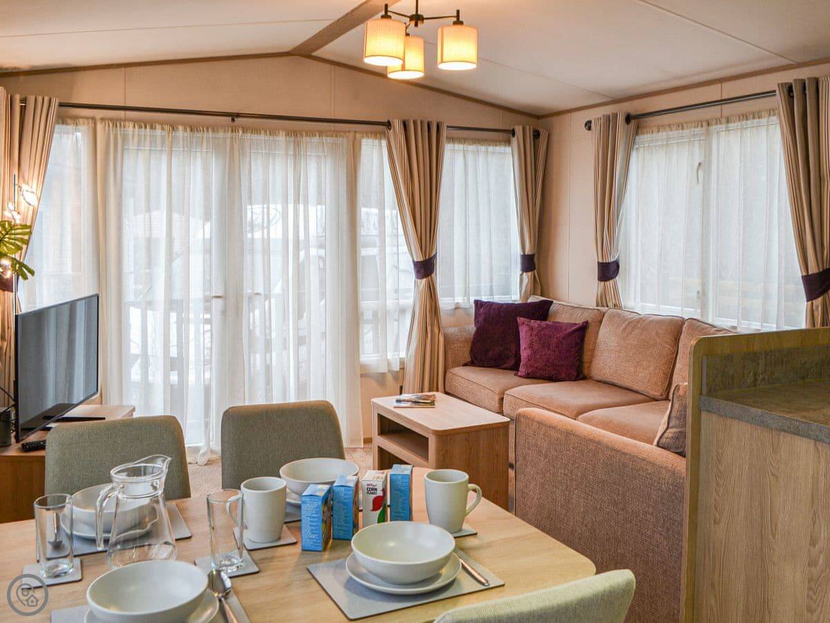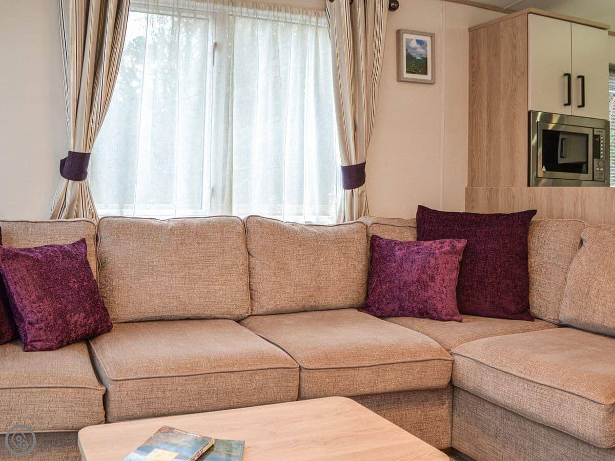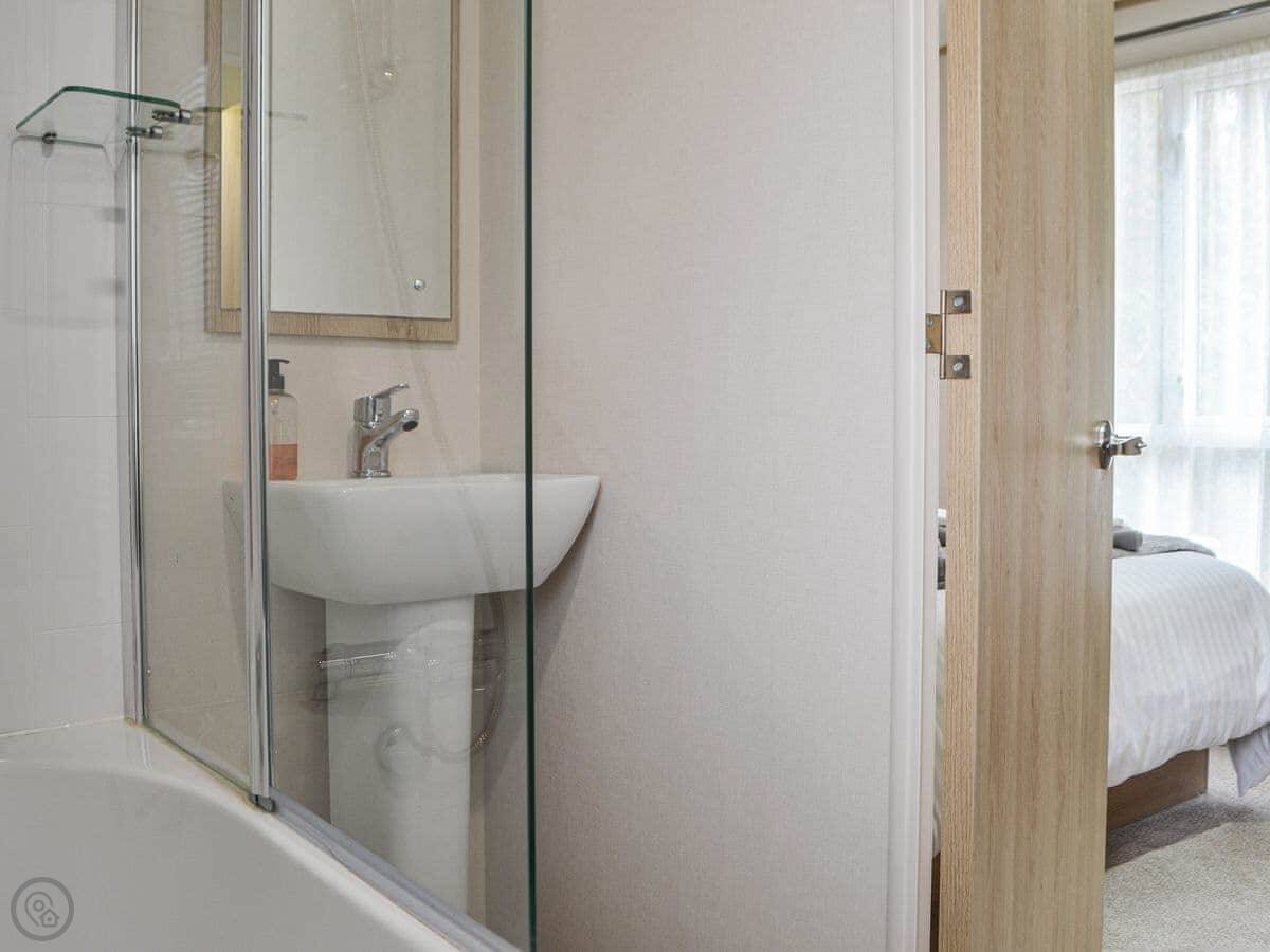 Graylings Rest is a lodge-style caravan on Brigham Holiday Park. It's new, from 2021. It sleeps four, in two bedrooms. One has a king bed with an en-suite bathroom that has a full bath. The other has twin beds. There's a second bathroom with a shower.