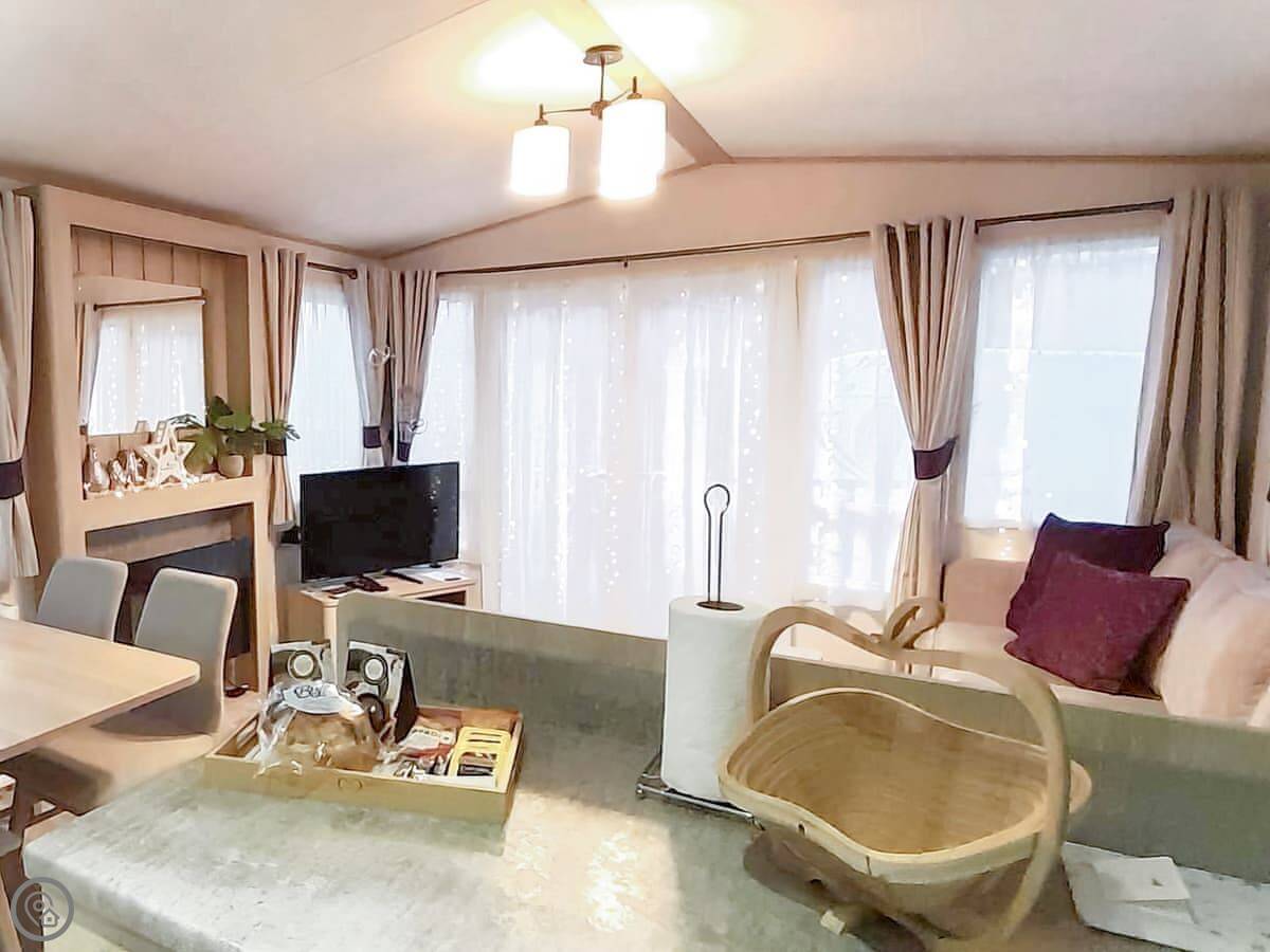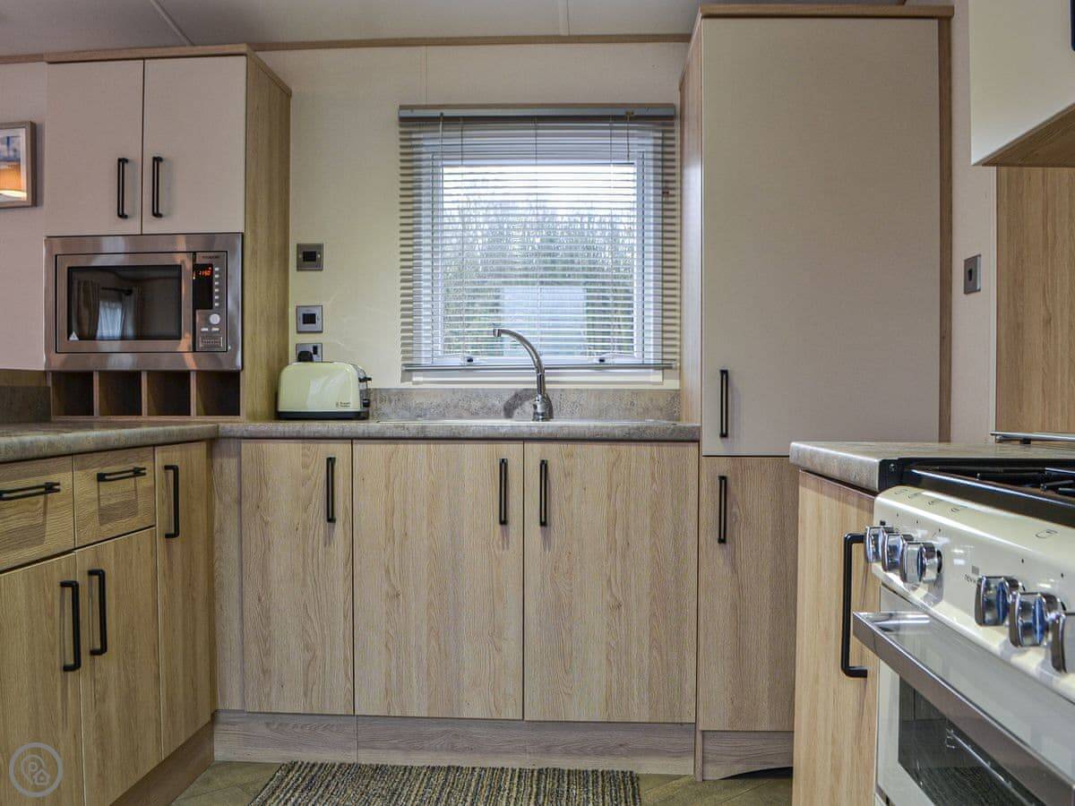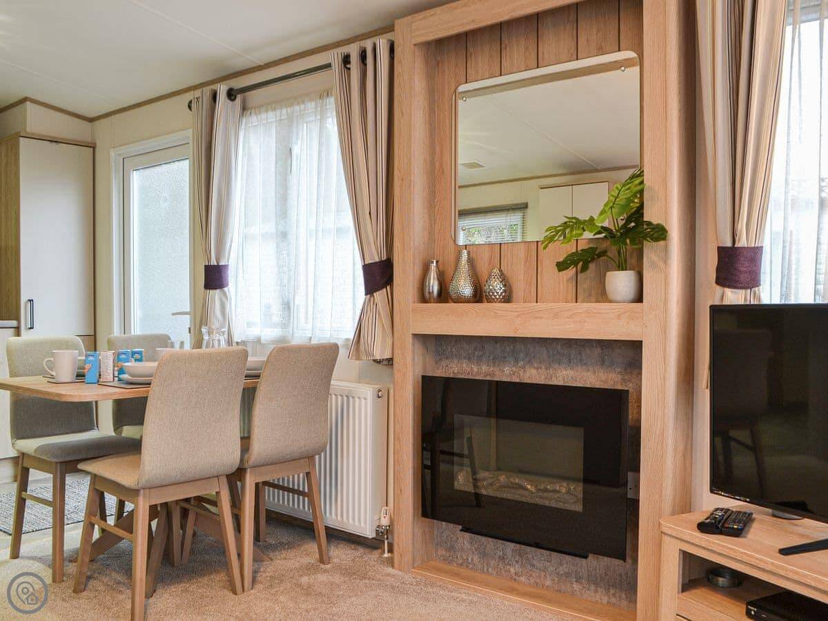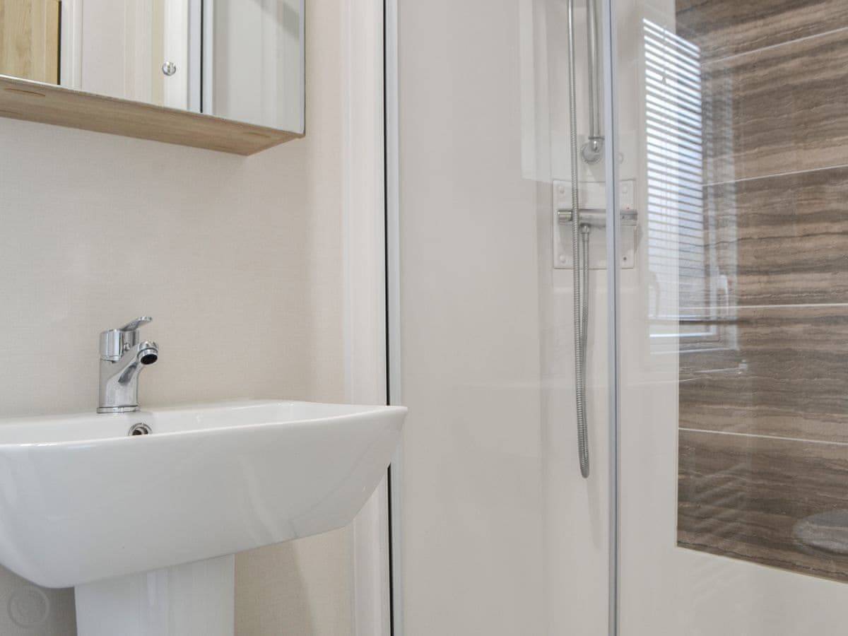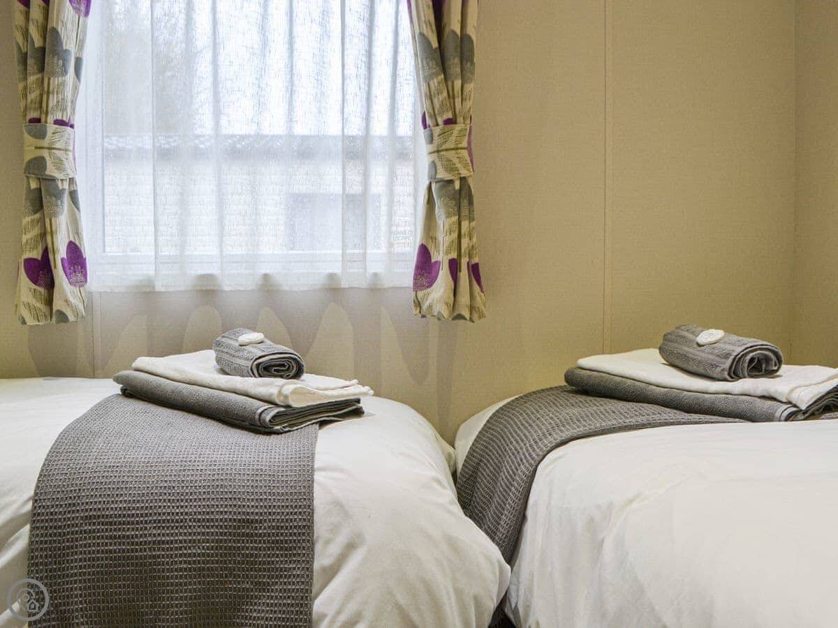 Graylings Rest is a lodge-style caravan on Brigham Holiday Park. It's new, from 2021. It sleeps four, in two bedrooms. One has a king bed with an en-suite bathroom that has a full bath. The other has twin beds. There's a second bathroom with a shower.