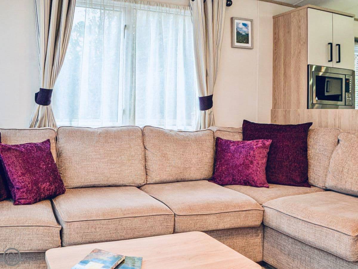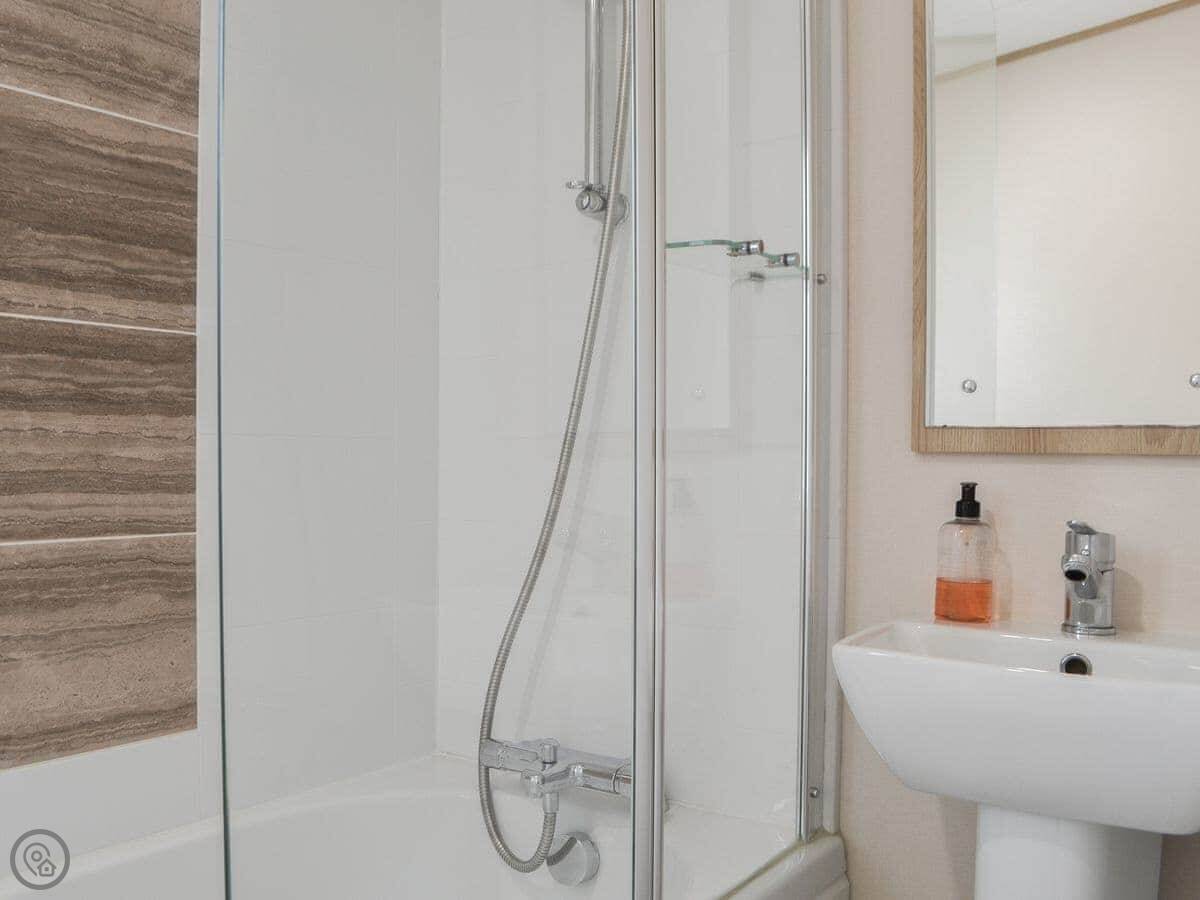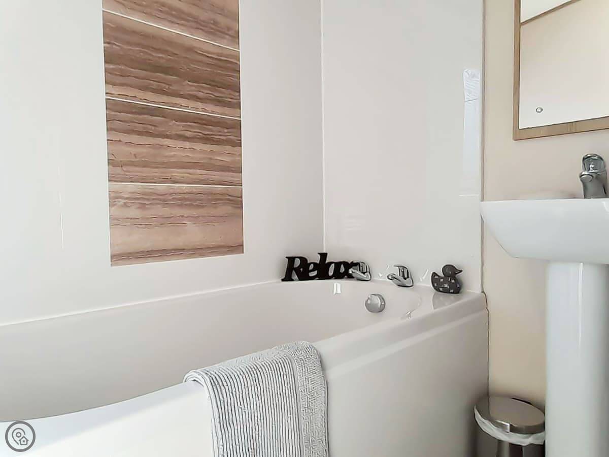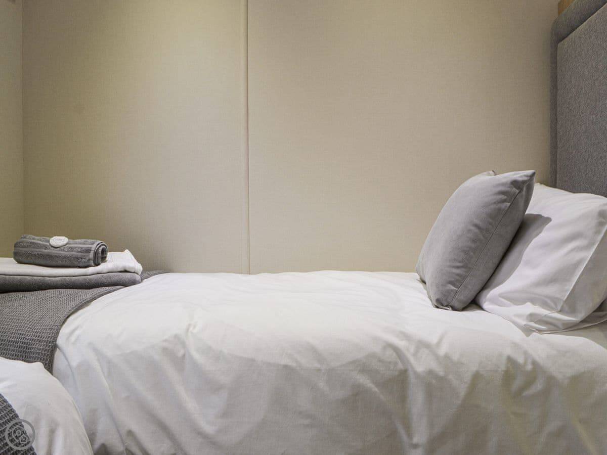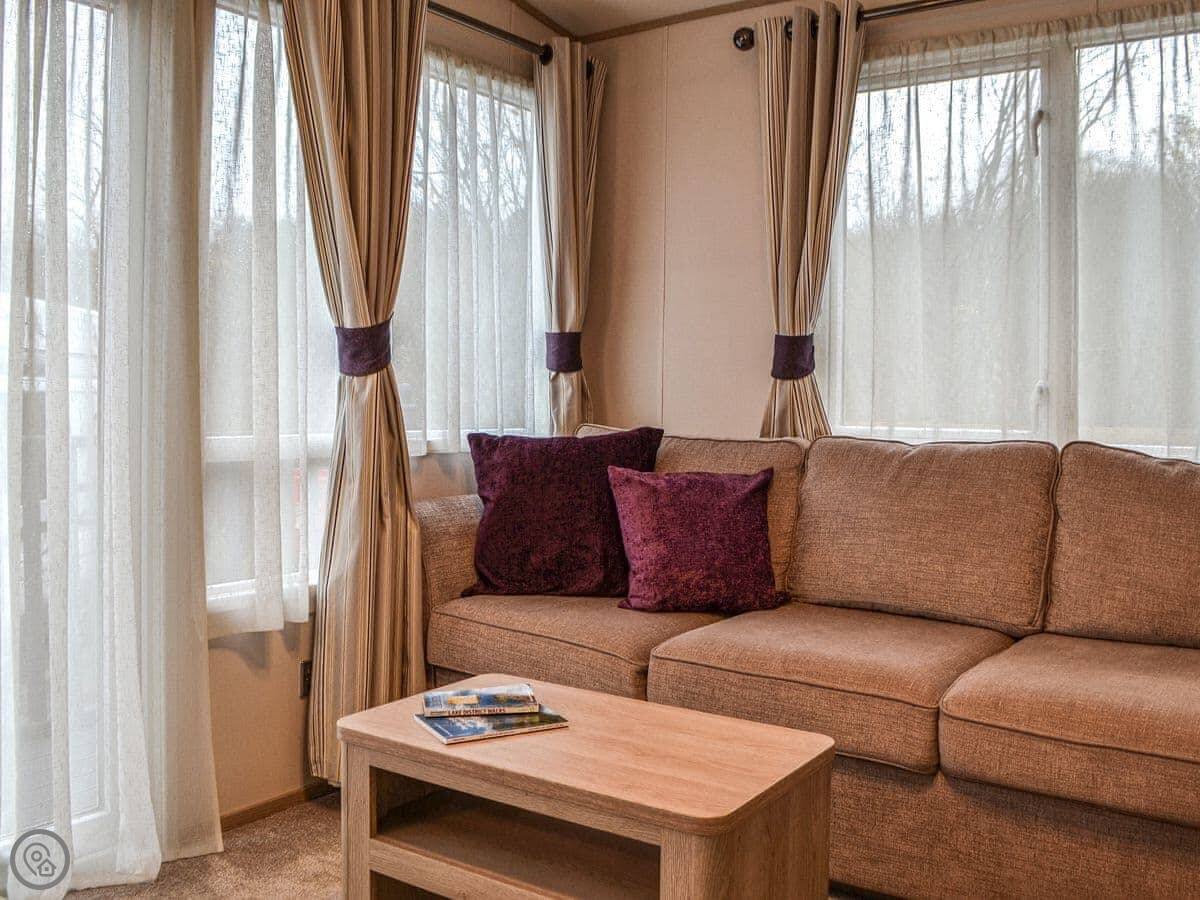 Graylings Rest is a lodge-style caravan on Brigham Holiday Park. It's new, from 2021. It sleeps four, in two bedrooms. One has a king bed with an en-suite bathroom that has a full bath. The other has twin beds. There's a second bathroom with a shower.