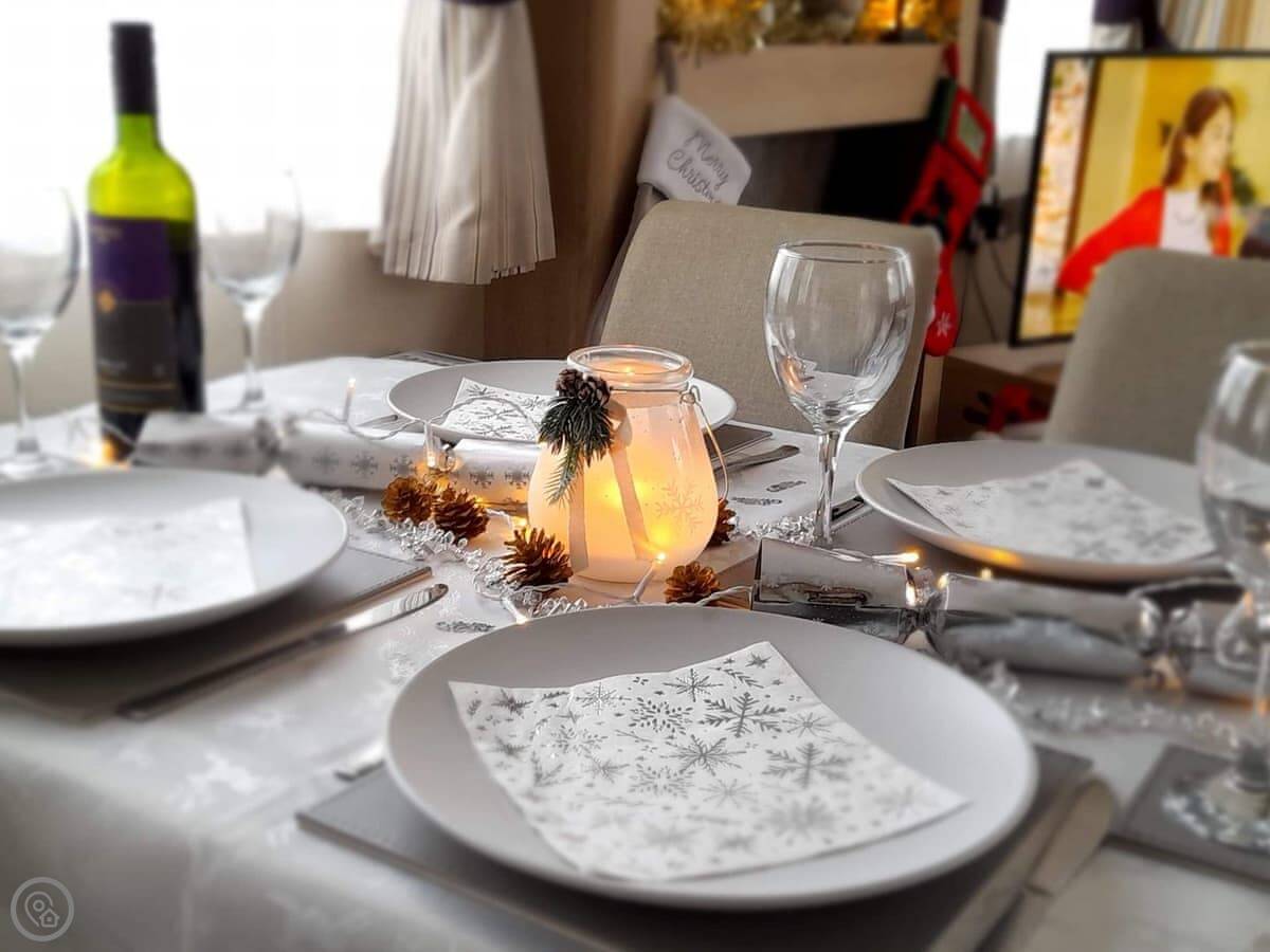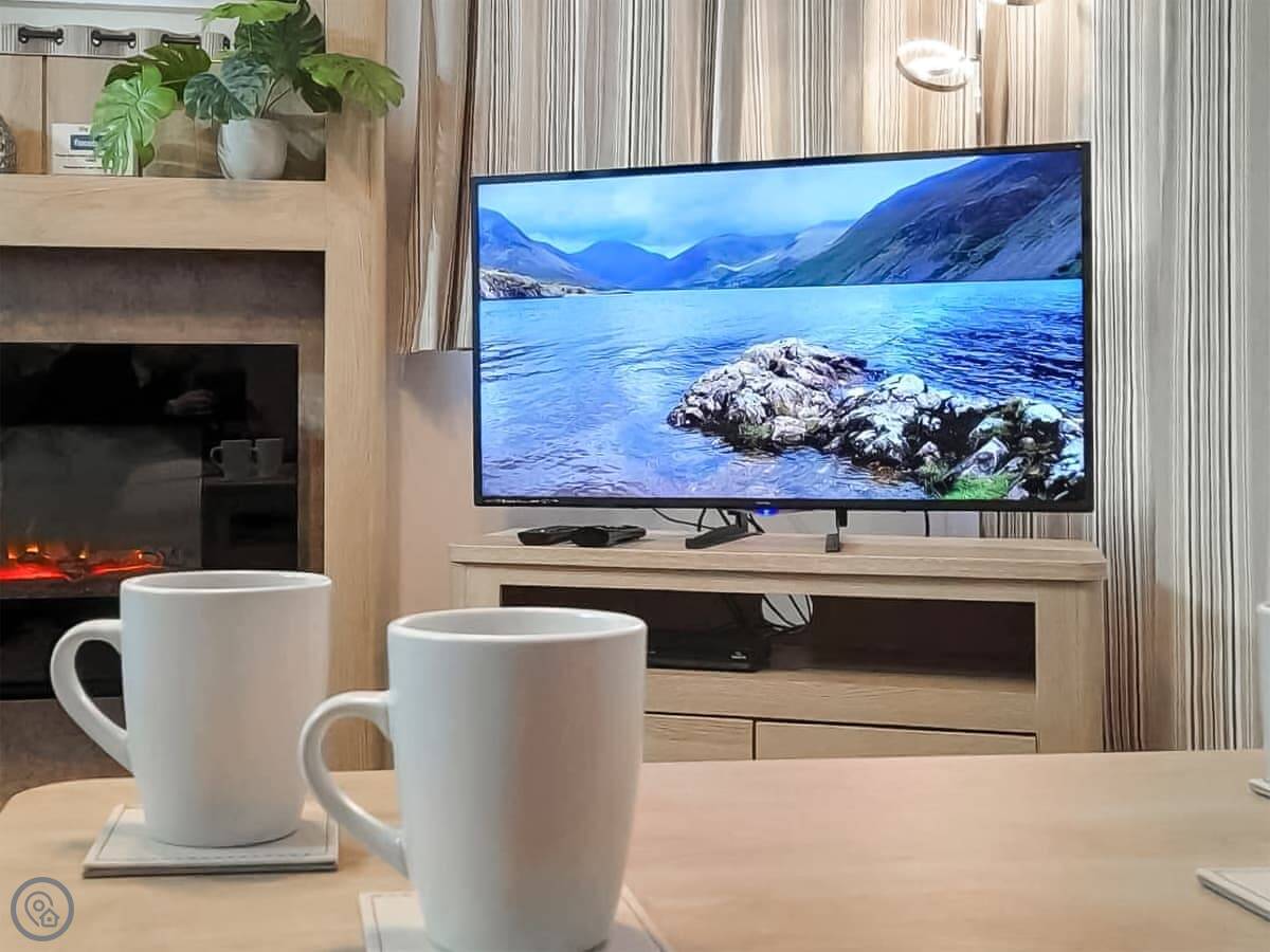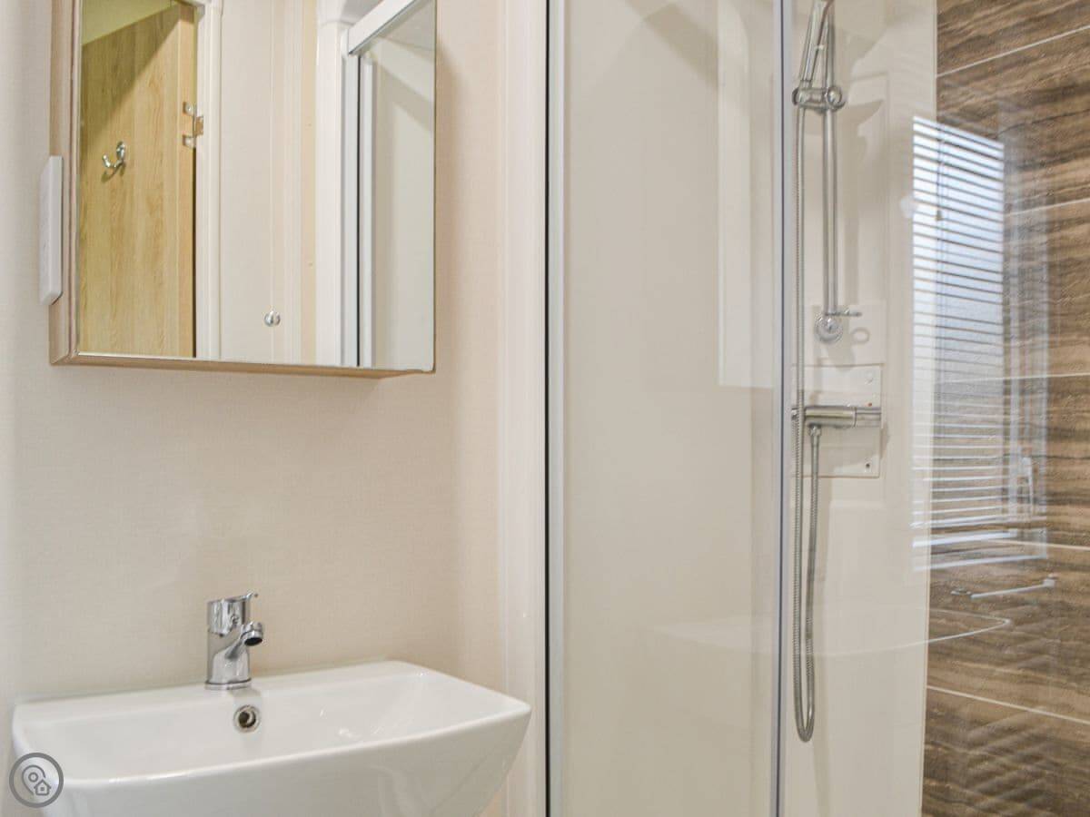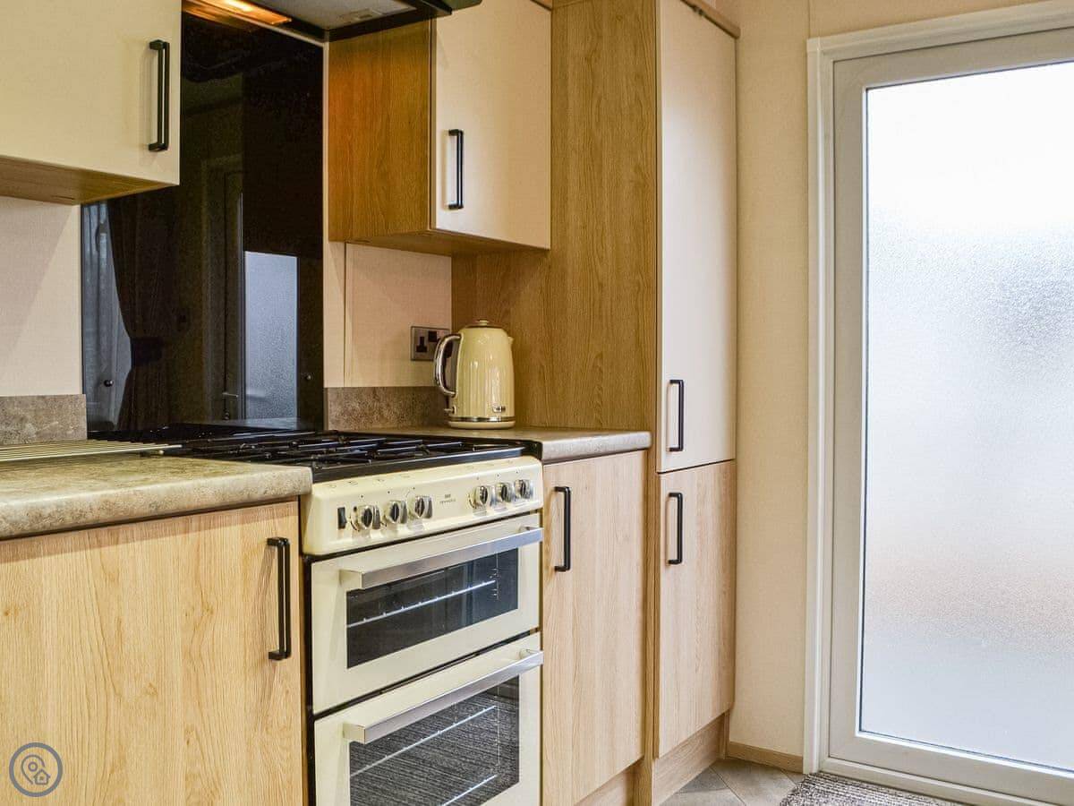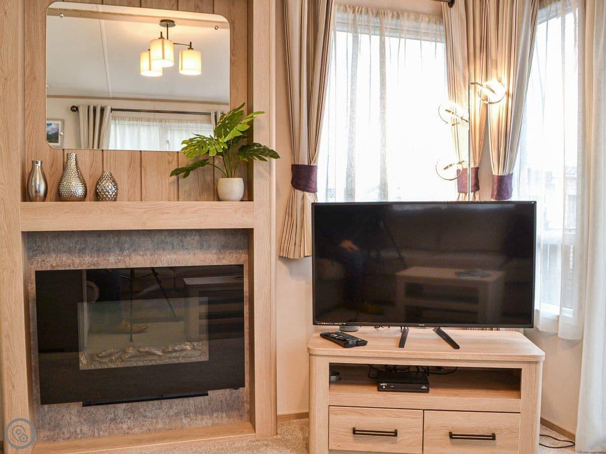 Graylings Rest is a lodge-style caravan on Brigham Holiday Park. It's new, from 2021. It sleeps four, in two bedrooms. One has a king bed with an en-suite bathroom that has a full bath. The other has twin beds. There's a second bathroom with a shower.