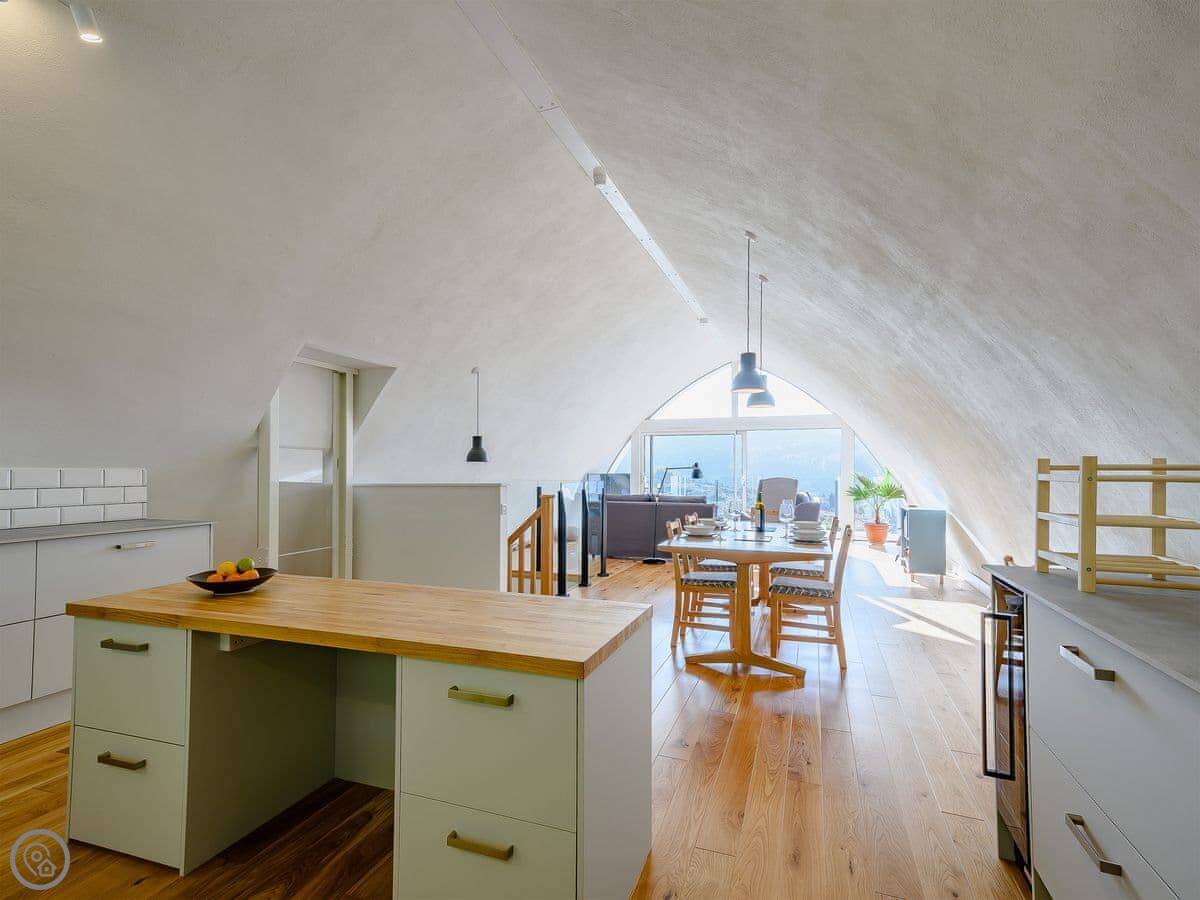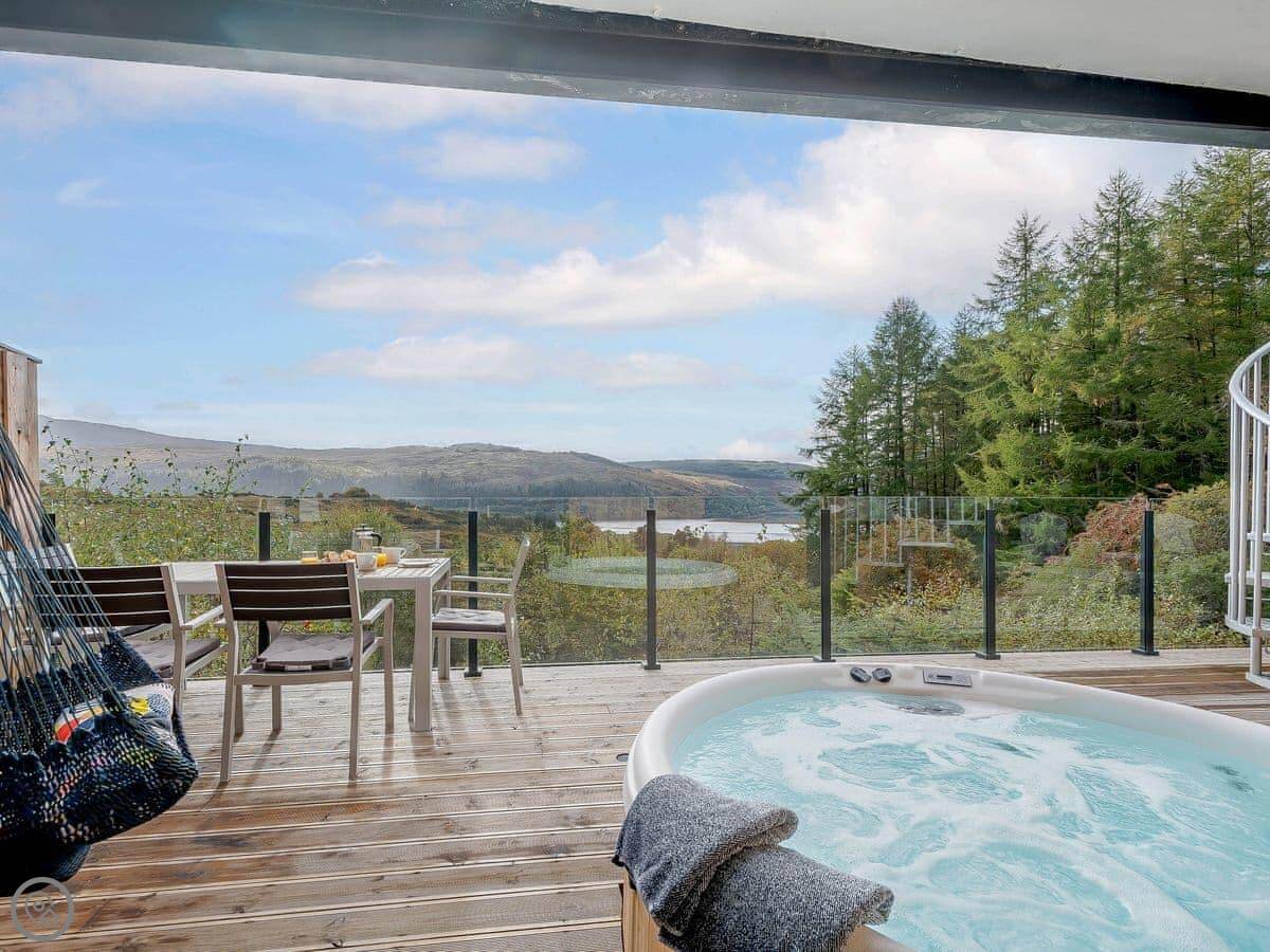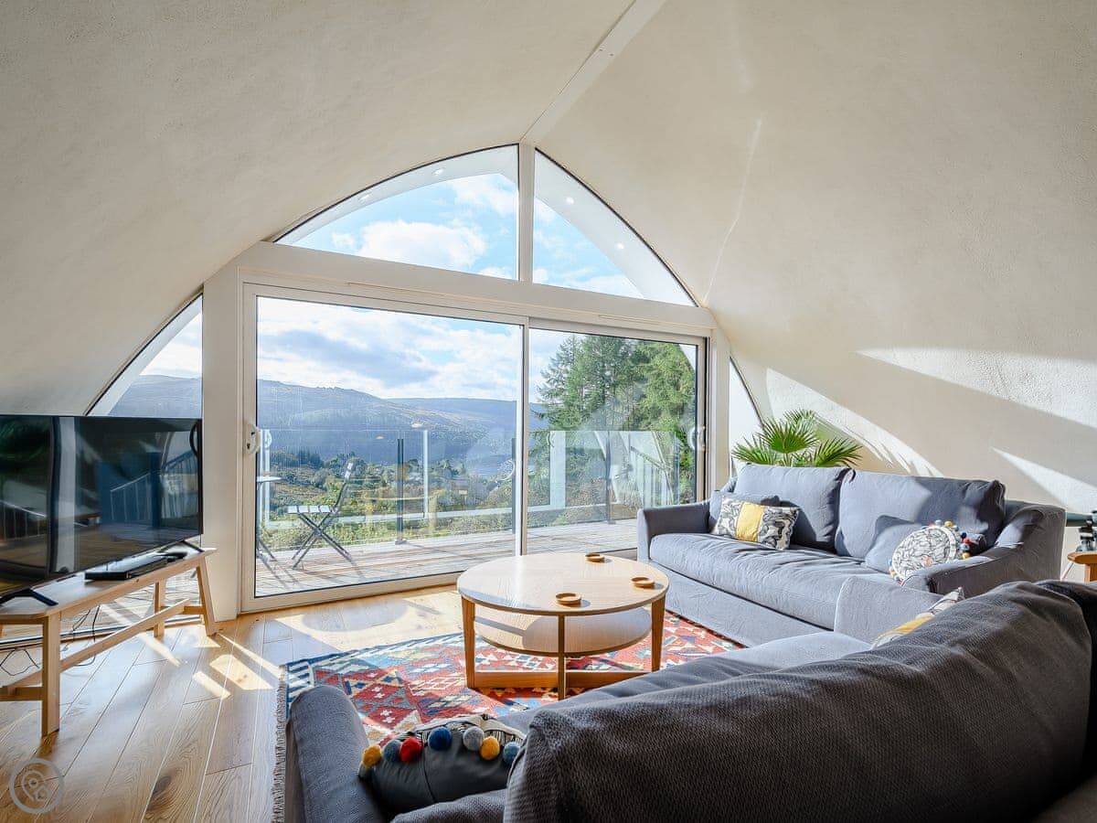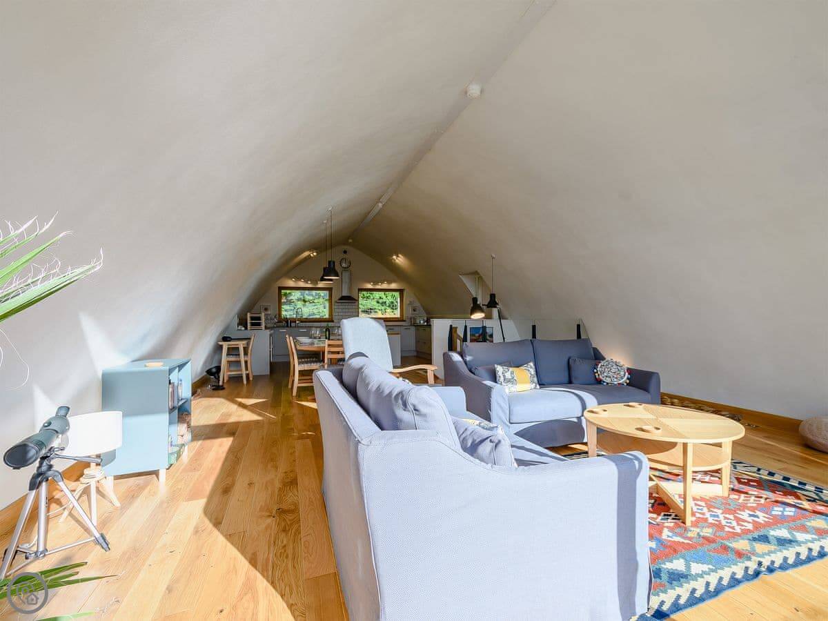 The living area is all open plan on the first floor. Big windows and doors lead out to a balcony. There's a telescope for looking at the hills or the stars. Downstairs, there's another balcony with a hot tub, a BBQ, and seating.
