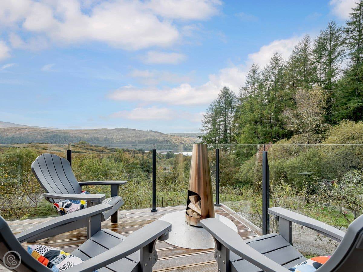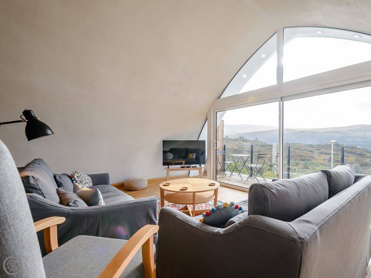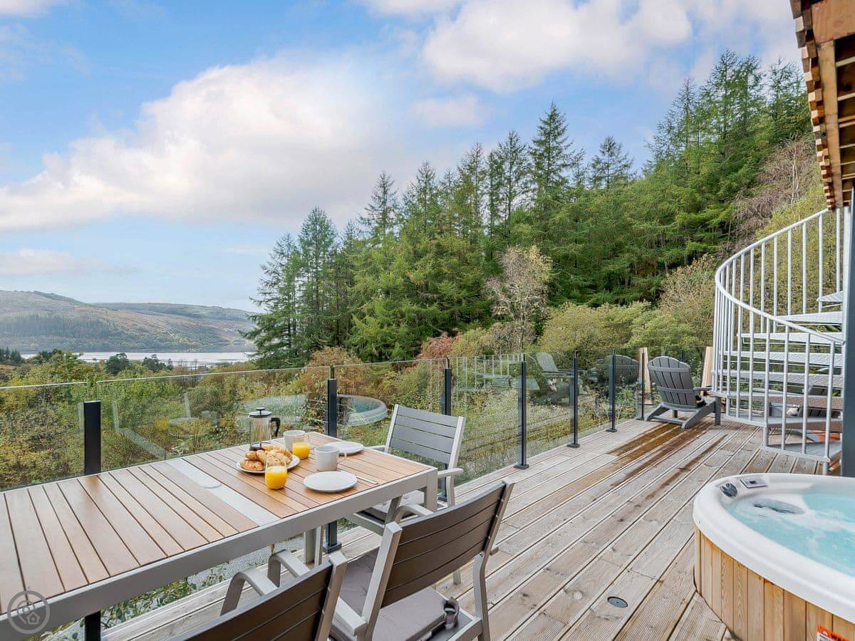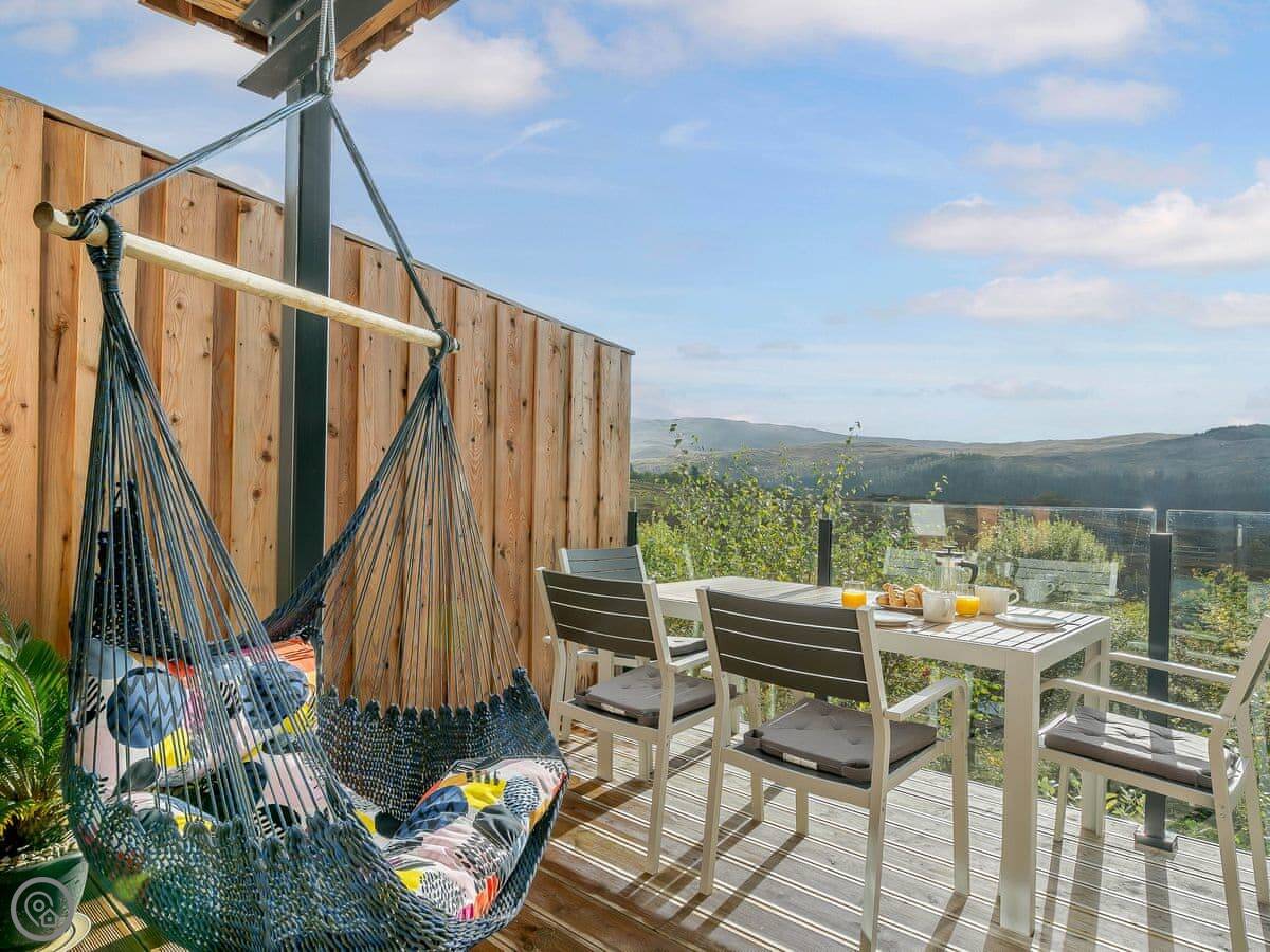 The living area is all open plan on the first floor. Big windows and doors lead out to a balcony. There's a telescope for looking at the hills or the stars. Downstairs, there's another balcony with a hot tub, a BBQ, and seating.