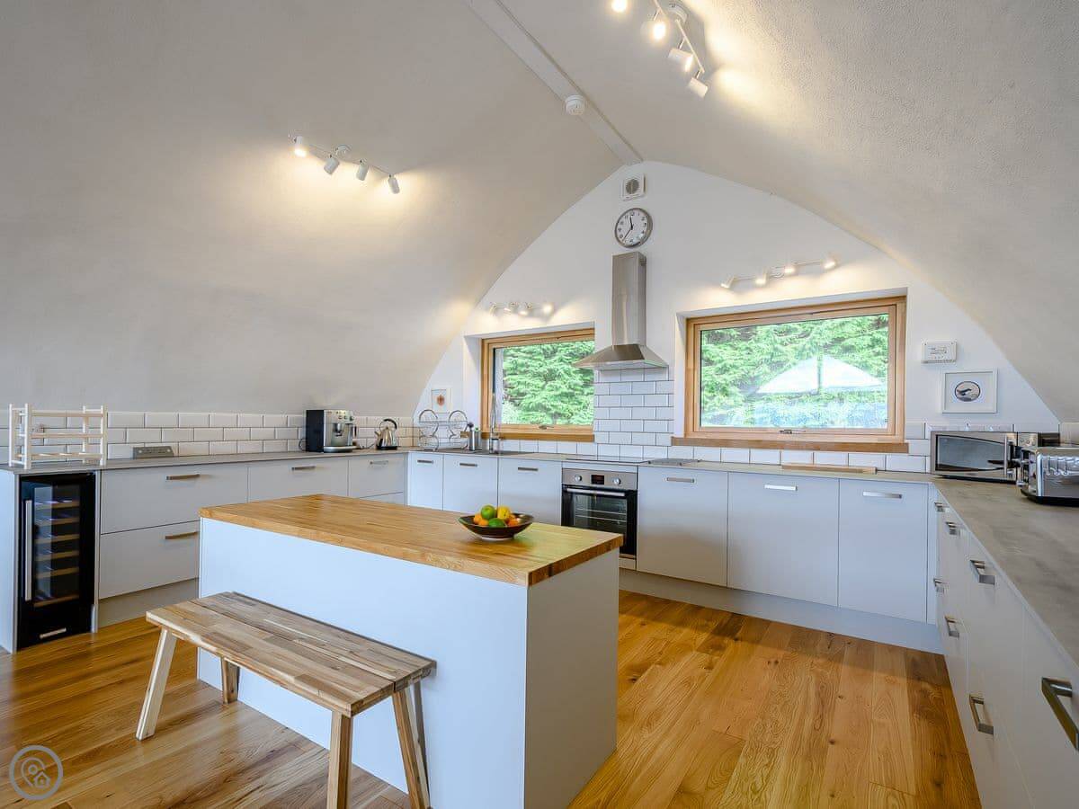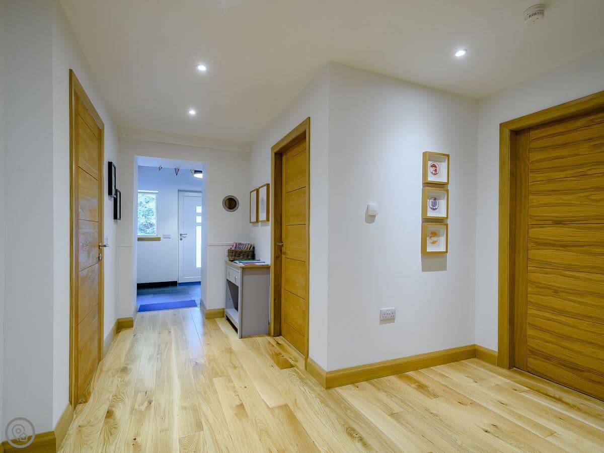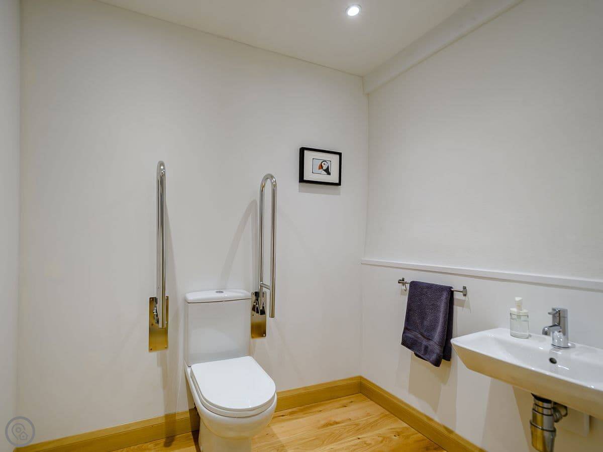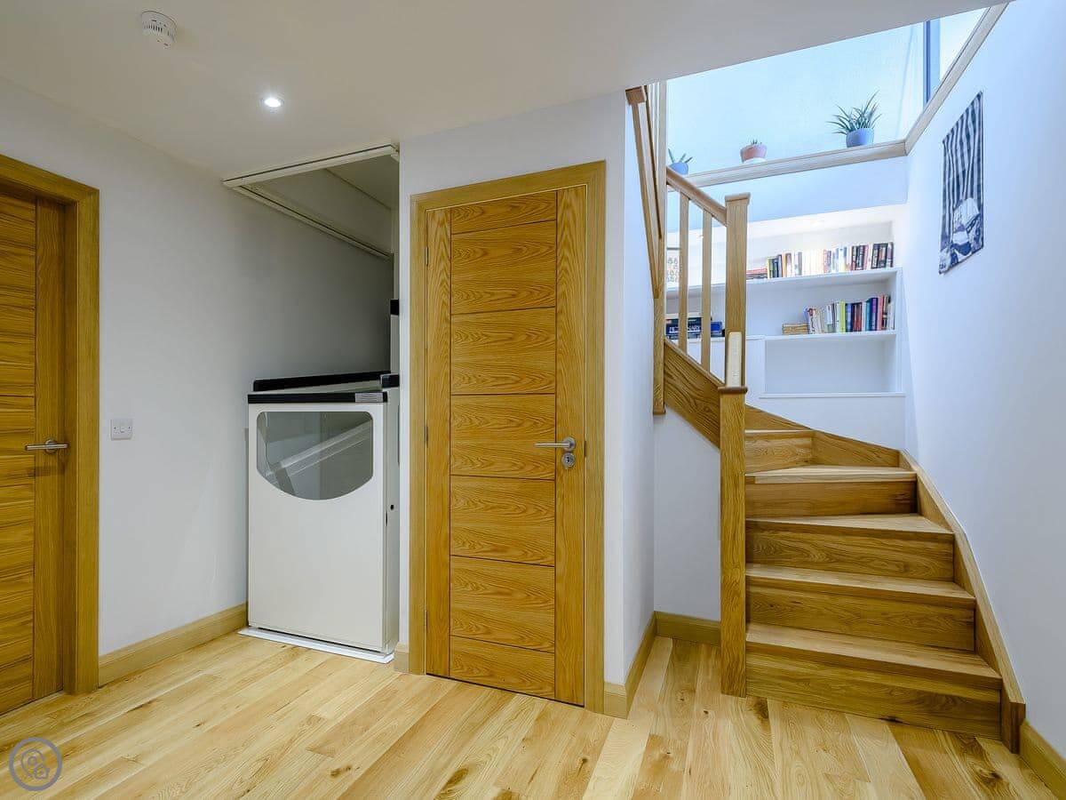It sleeps four. Two bedrooms, both en-suite. It's got a 5 Star rating. It was designed to be fully accessible, which is quite rare up here. There's a wheelchair lift between floors, wide doorways, and a hoist in the main bedroom. The kitchen worktops are lower. If you don't need that stuff, it's just a very comfortable, well-designed house.