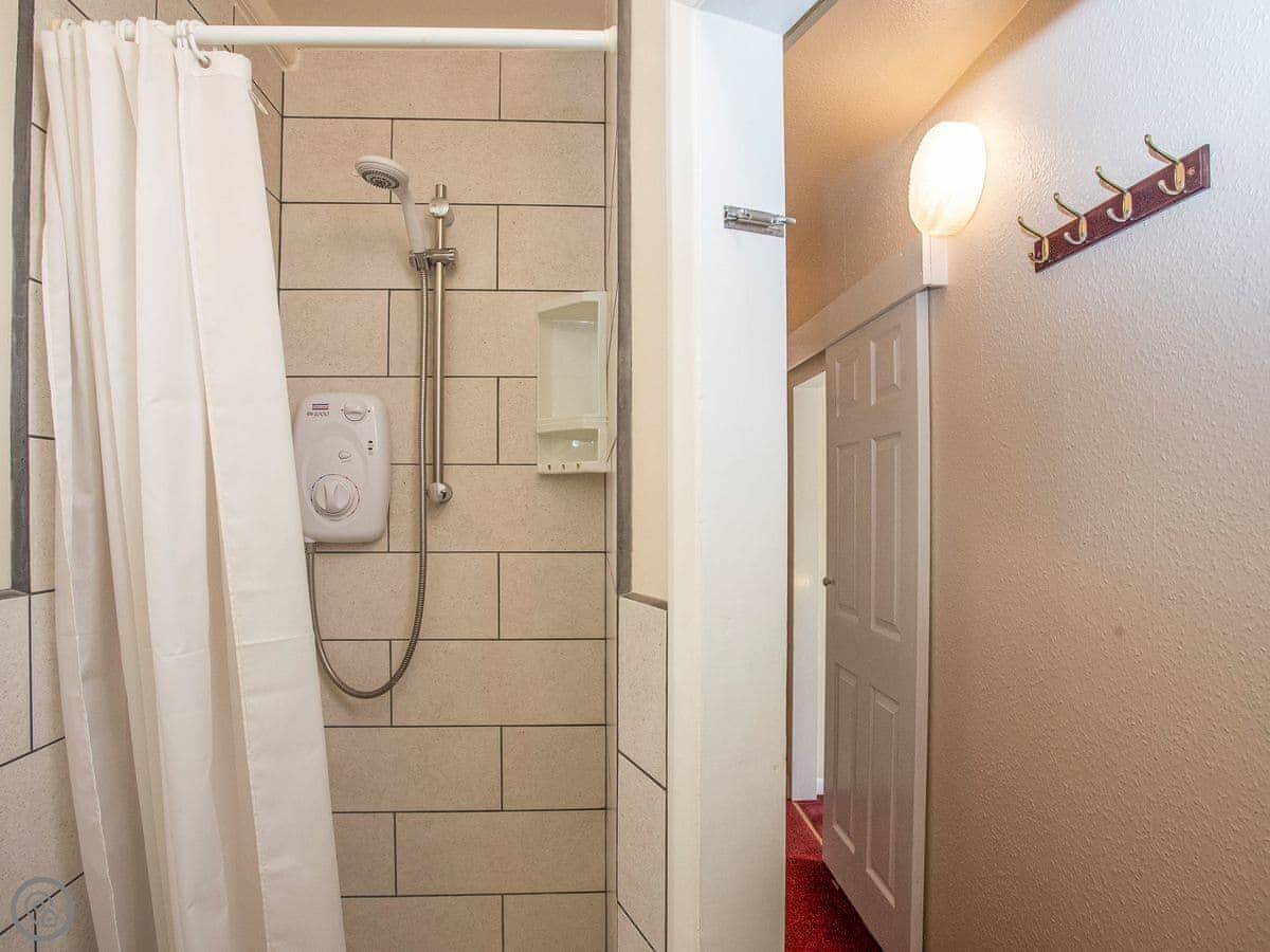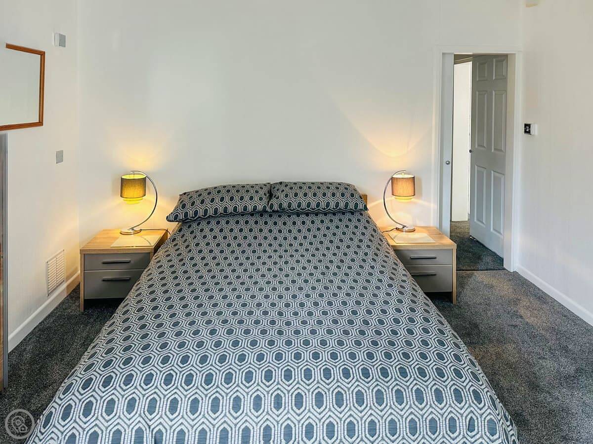 It's got one kingsize bedroom and a shower room. The lounge and dining area are open plan. The TV's a good size. The kitchen door opens onto a little paved sitting out area. It's nothing fancy, but it's clean and practical. It's rated 3 Star.