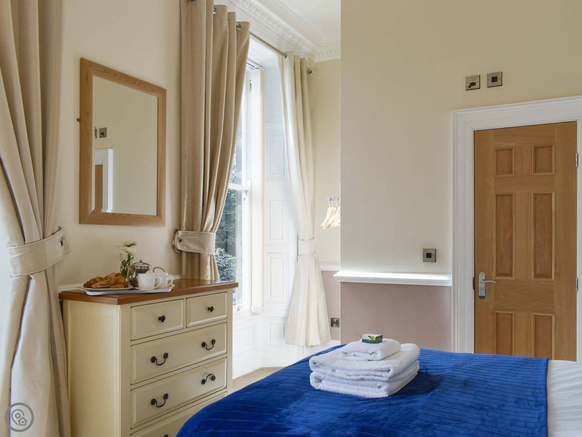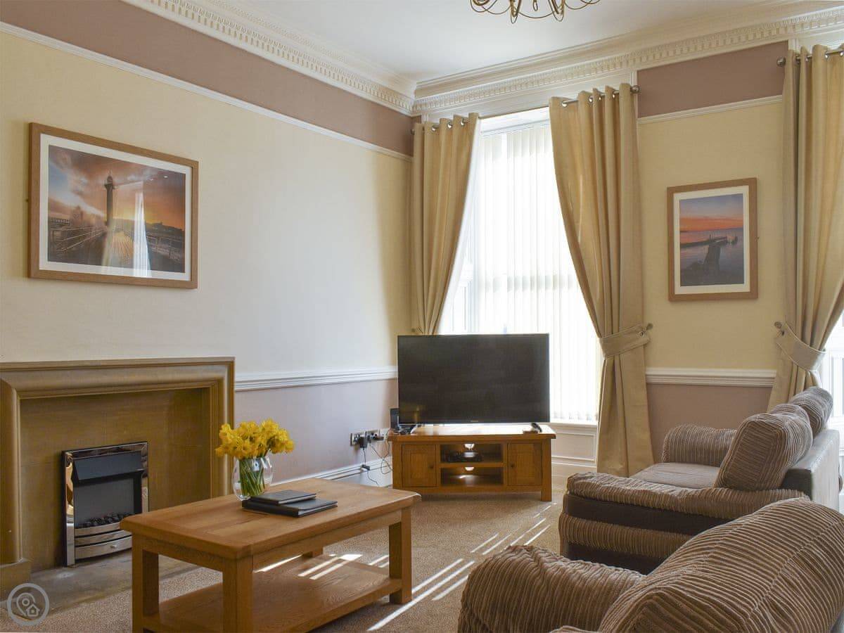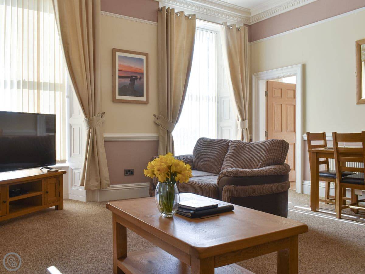 This is Seafarer. It's a one-bedroom flat for two on the west side of Whitby town centre. It's in a Georgian house, so the ceilings are nice and high. Everything's on the same level once you're in, which is handy. There are a couple of stone steps to get to the front door, then a small step into the flat itself.