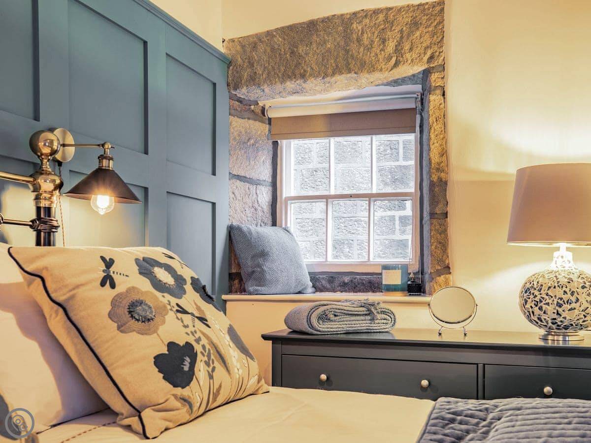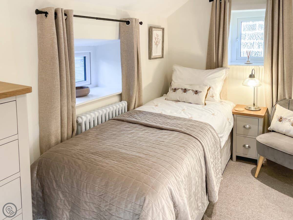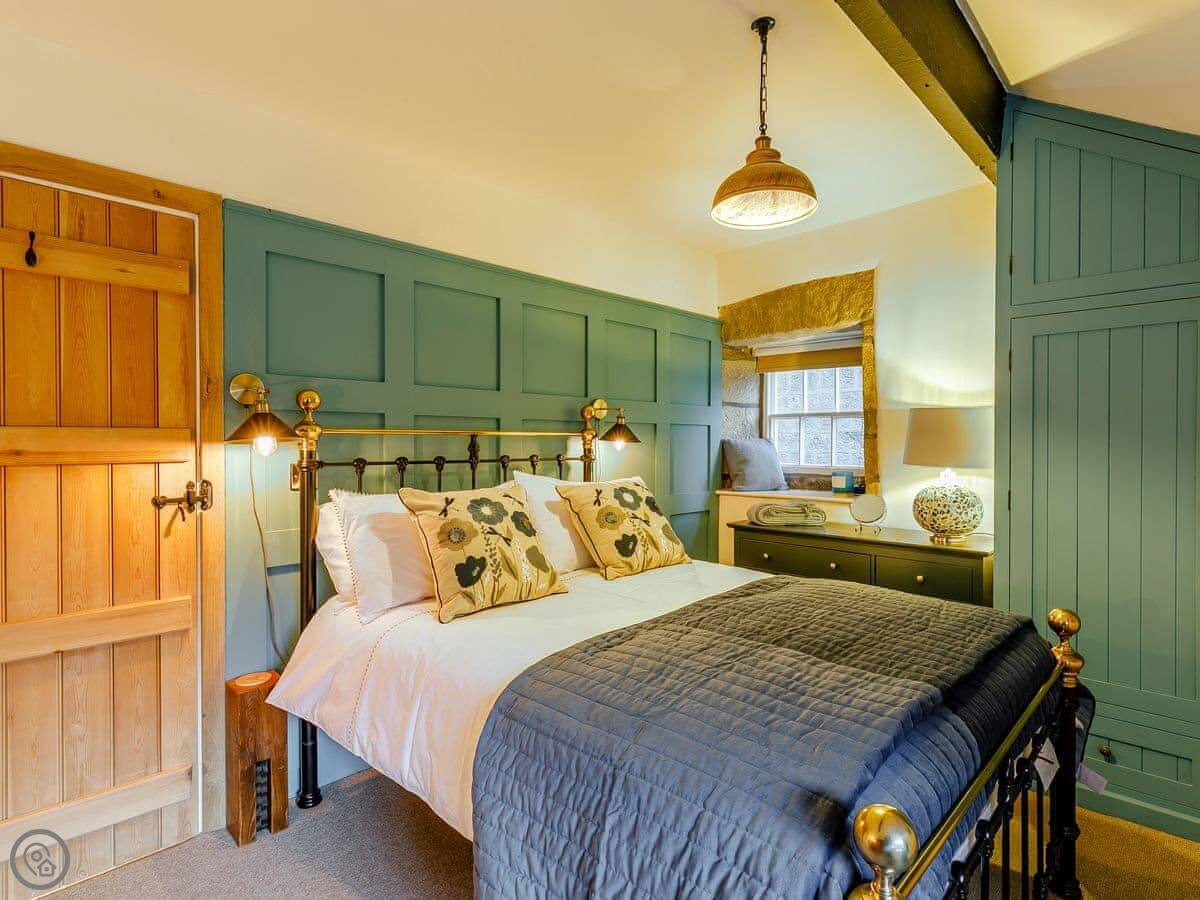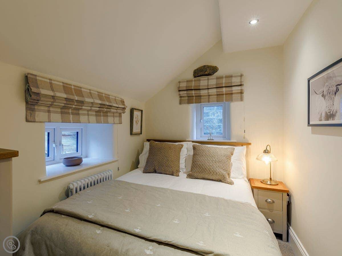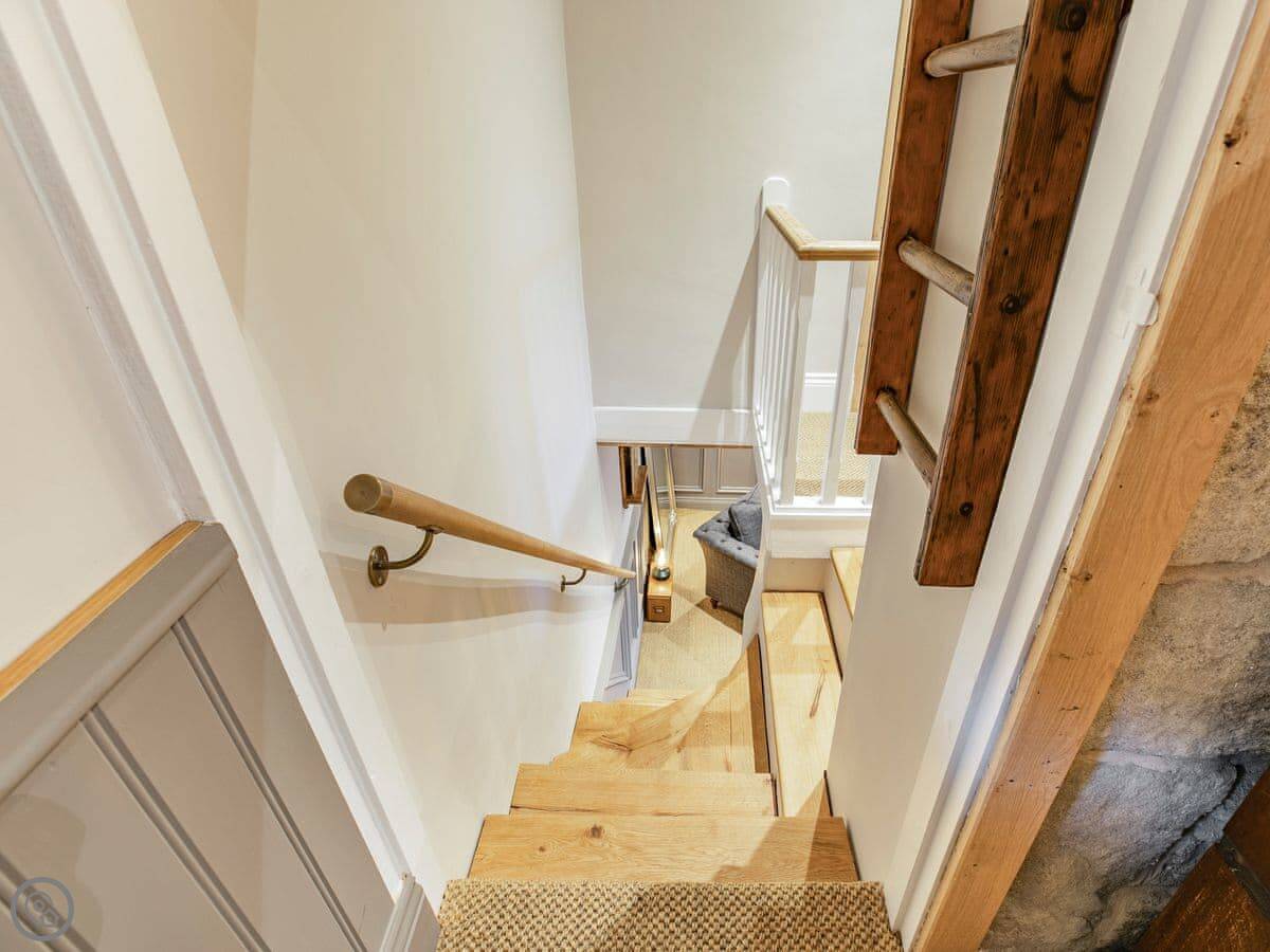 It sleeps five. Three bedrooms, one bathroom. It's got a 5 Star rating, which covers things like the wood burner and the finishes. The stairs are steep. They're open-sided and the steps aren't all the same size. Some of the doorways are low, you'll need to duck.