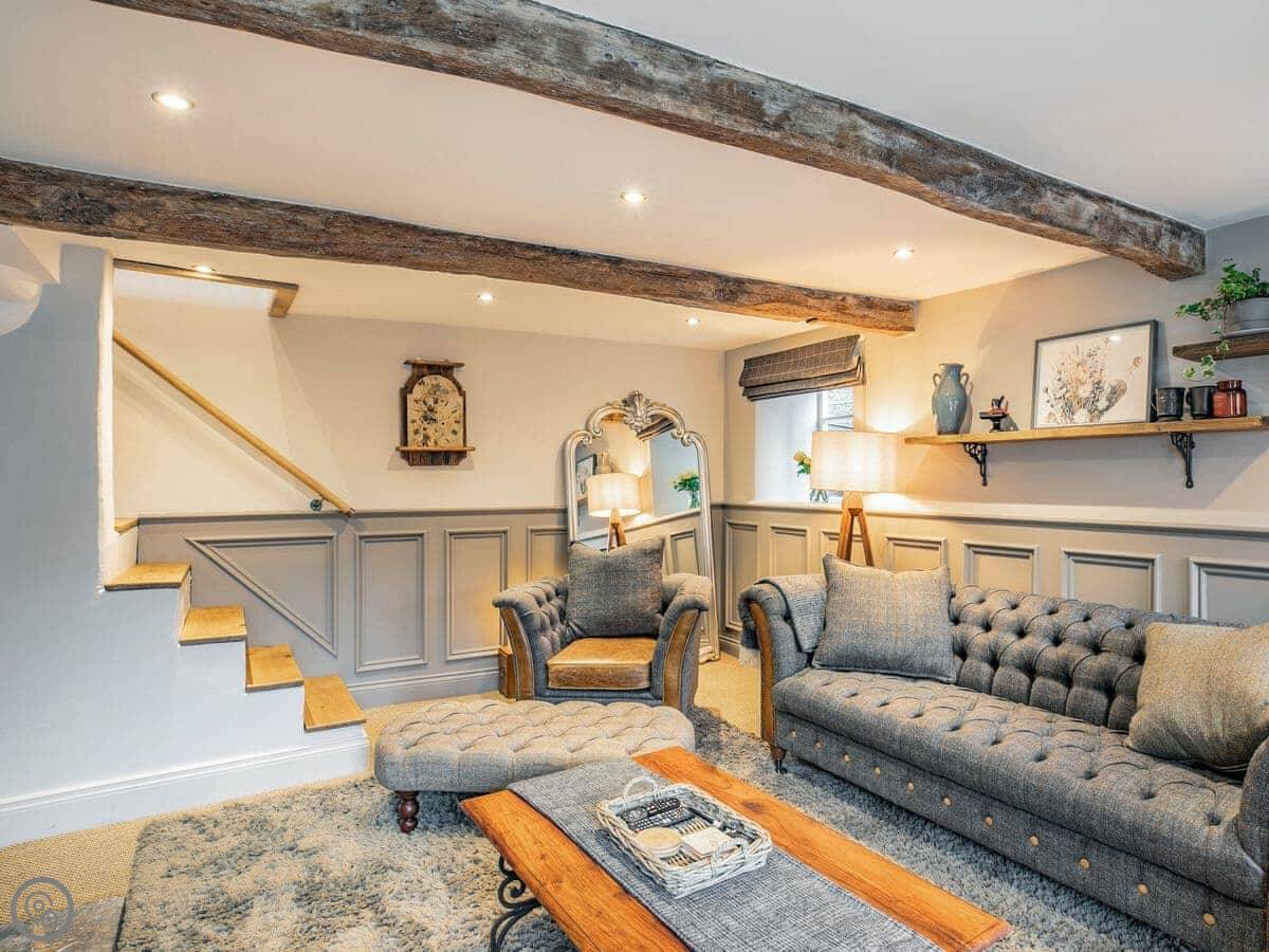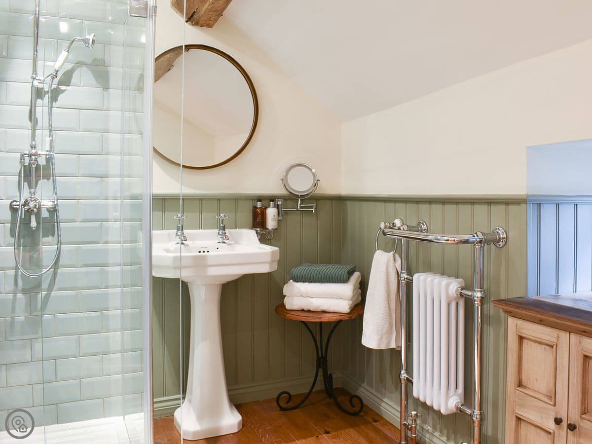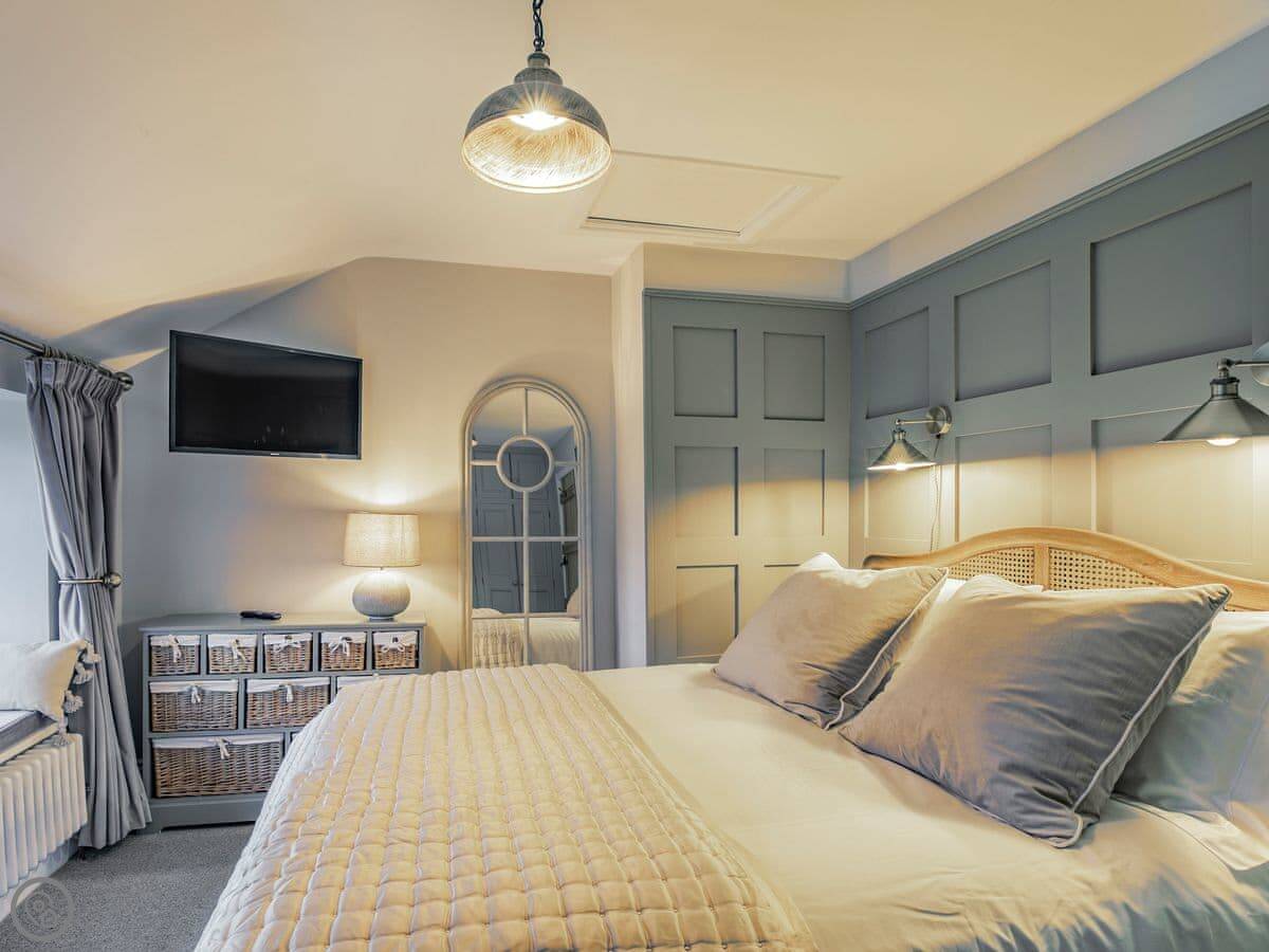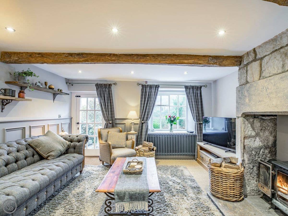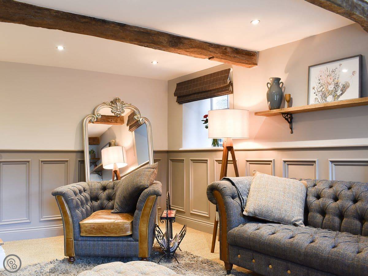 It sleeps five. Three bedrooms, one bathroom. It's got a 5 Star rating, which covers things like the wood burner and the finishes. The stairs are steep. They're open-sided and the steps aren't all the same size. Some of the doorways are low, you'll need to duck.
