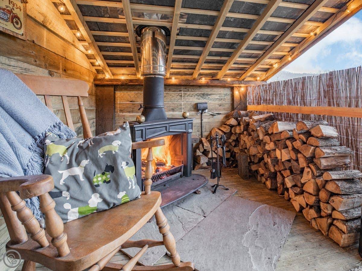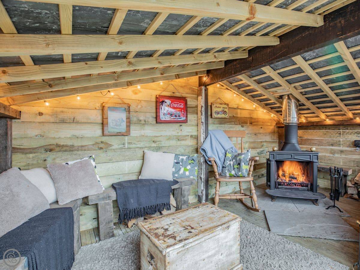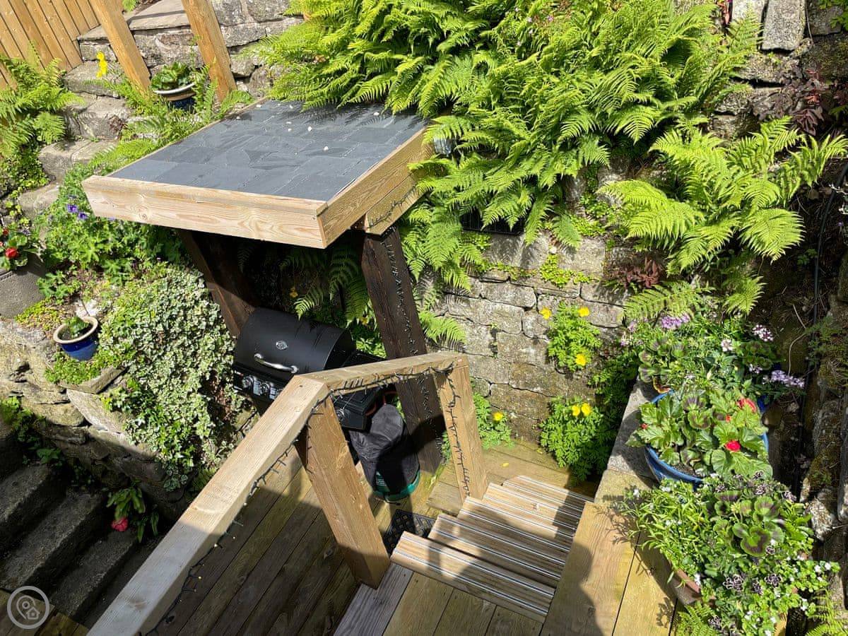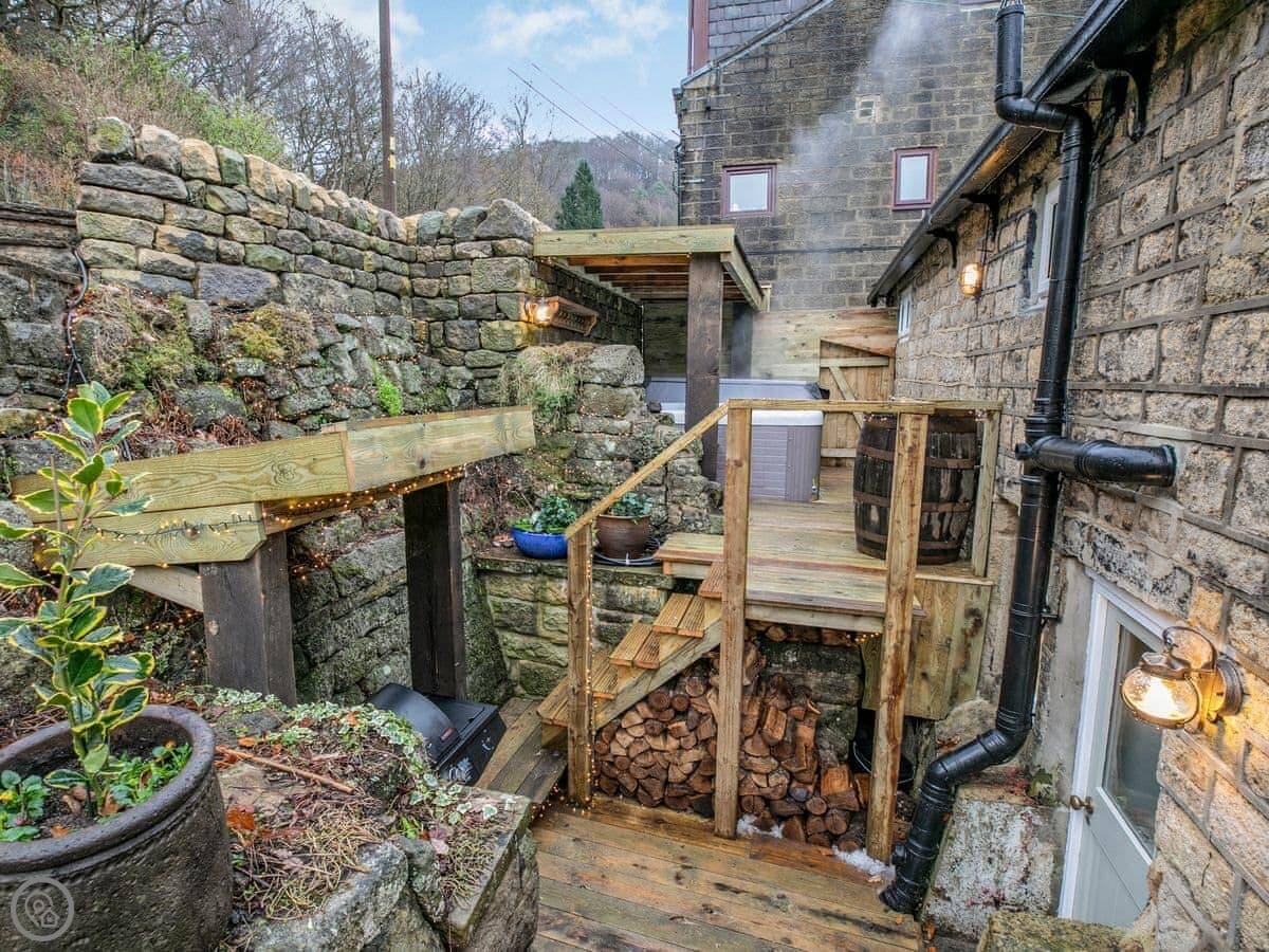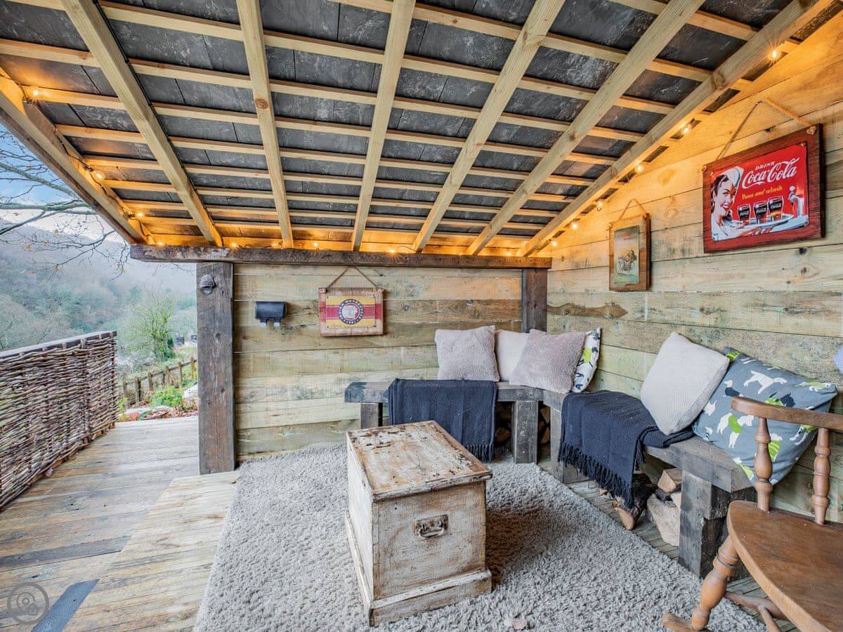Outside, there's a patio at the front that gets the sun. At the back, there's a sheltered bit with a barbecue and the hot tub. The garden goes up the hill behind. There's a little hut up there with its own wood burner, so you can sit and look over the valley even if it's raining.