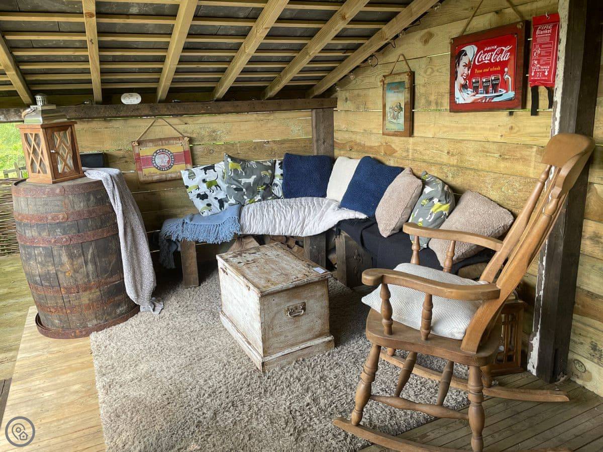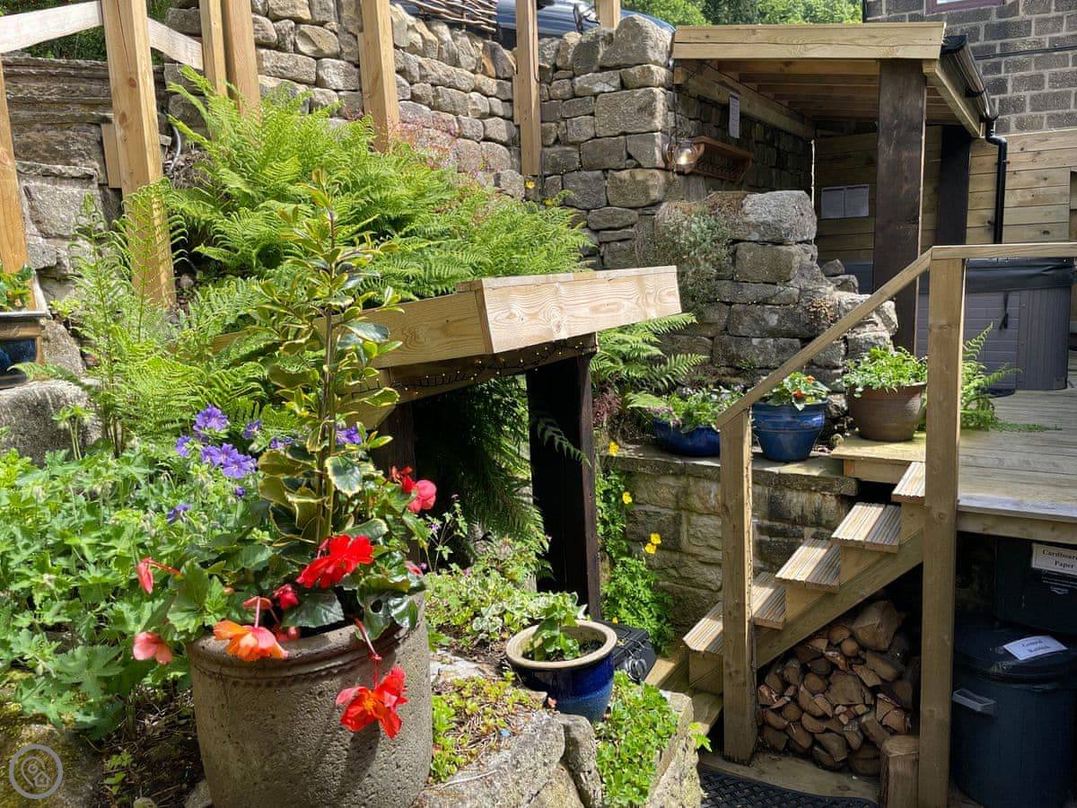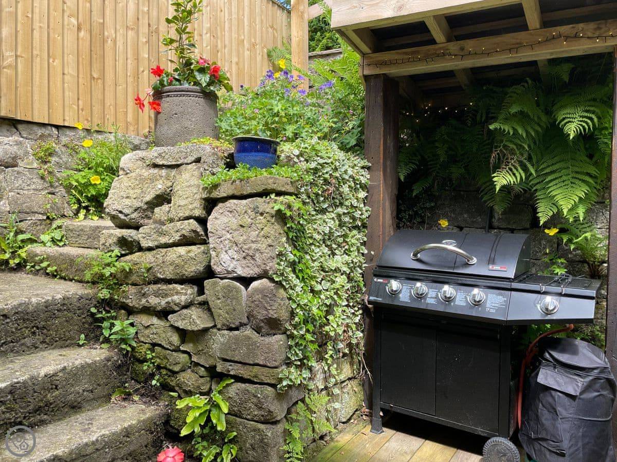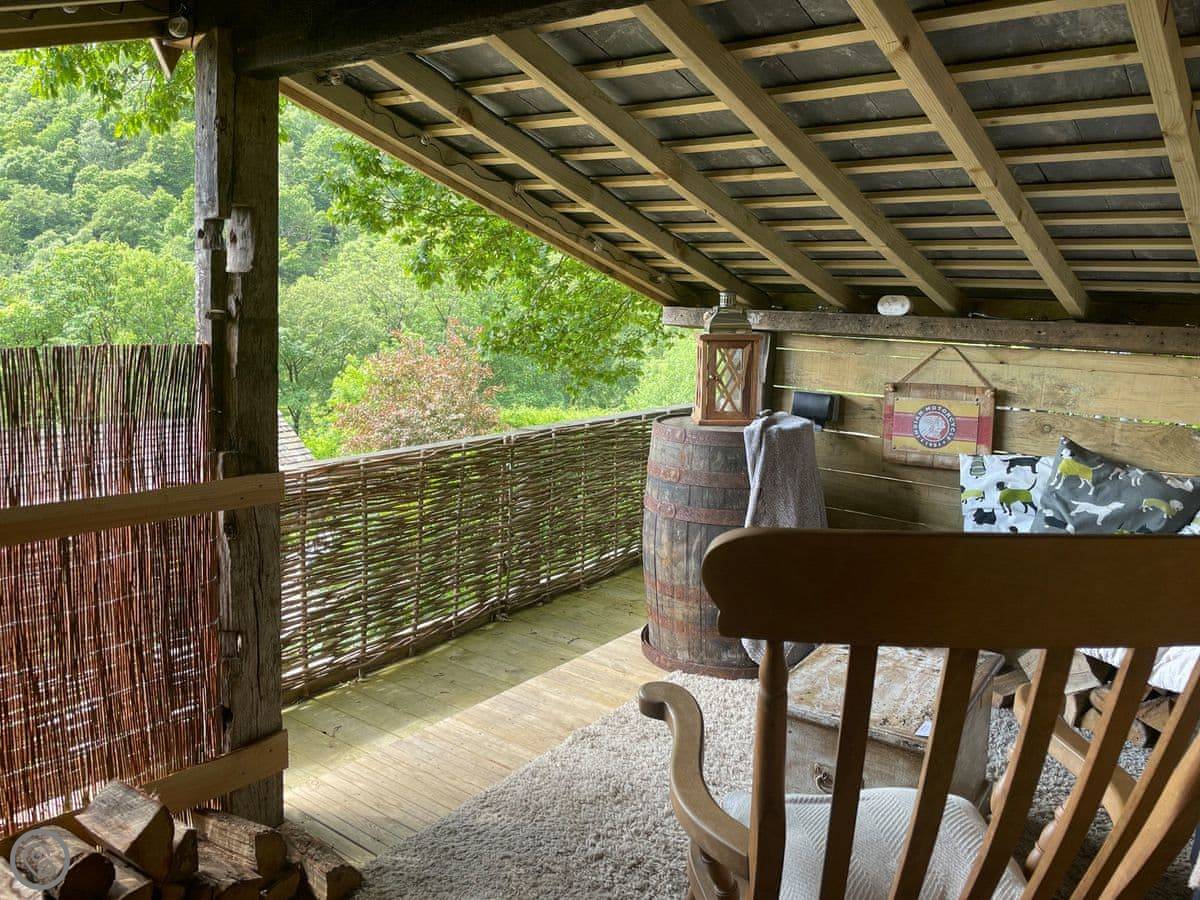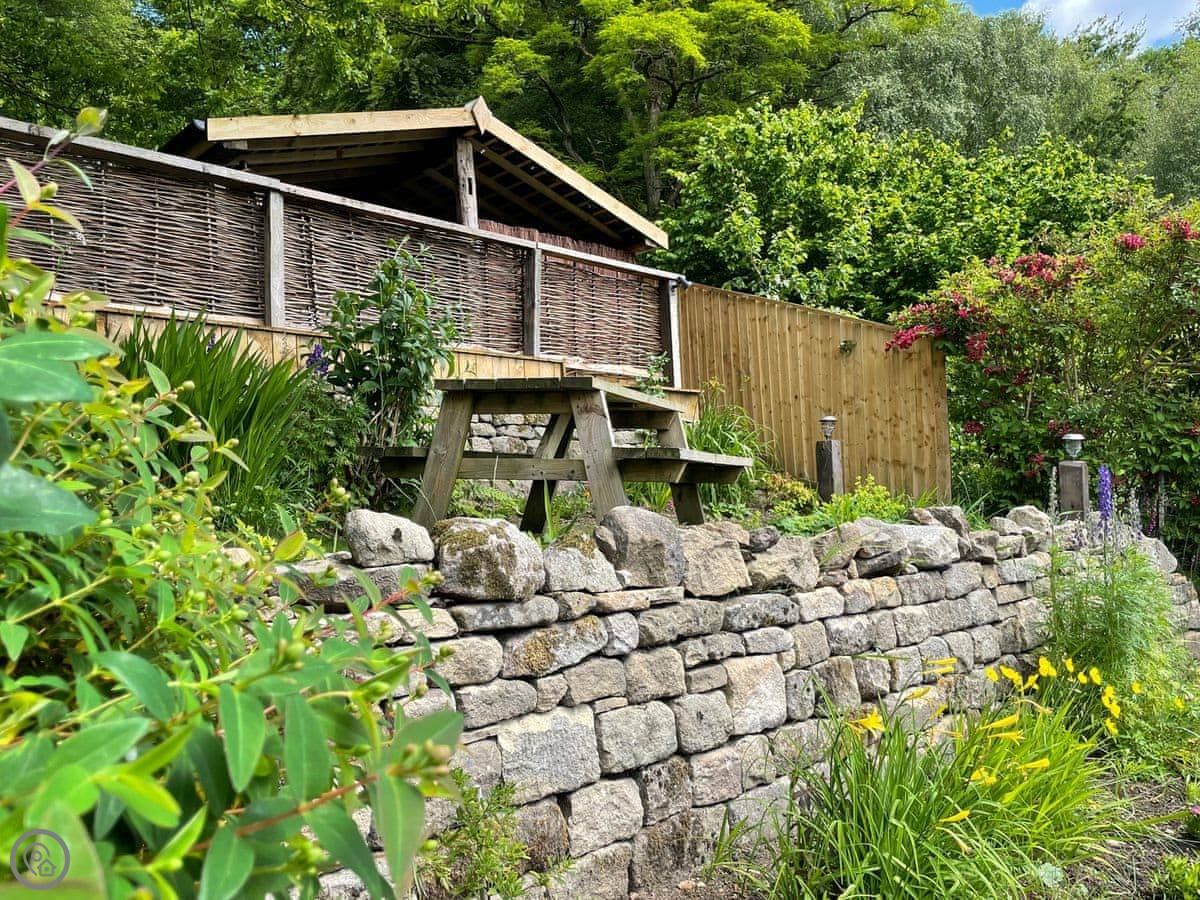 Outside, there's a patio at the front that gets the sun. At the back, there's a sheltered bit with a barbecue and the hot tub. The garden goes up the hill behind. There's a little hut up there with its own wood burner, so you can sit and look over the valley even if it's raining.