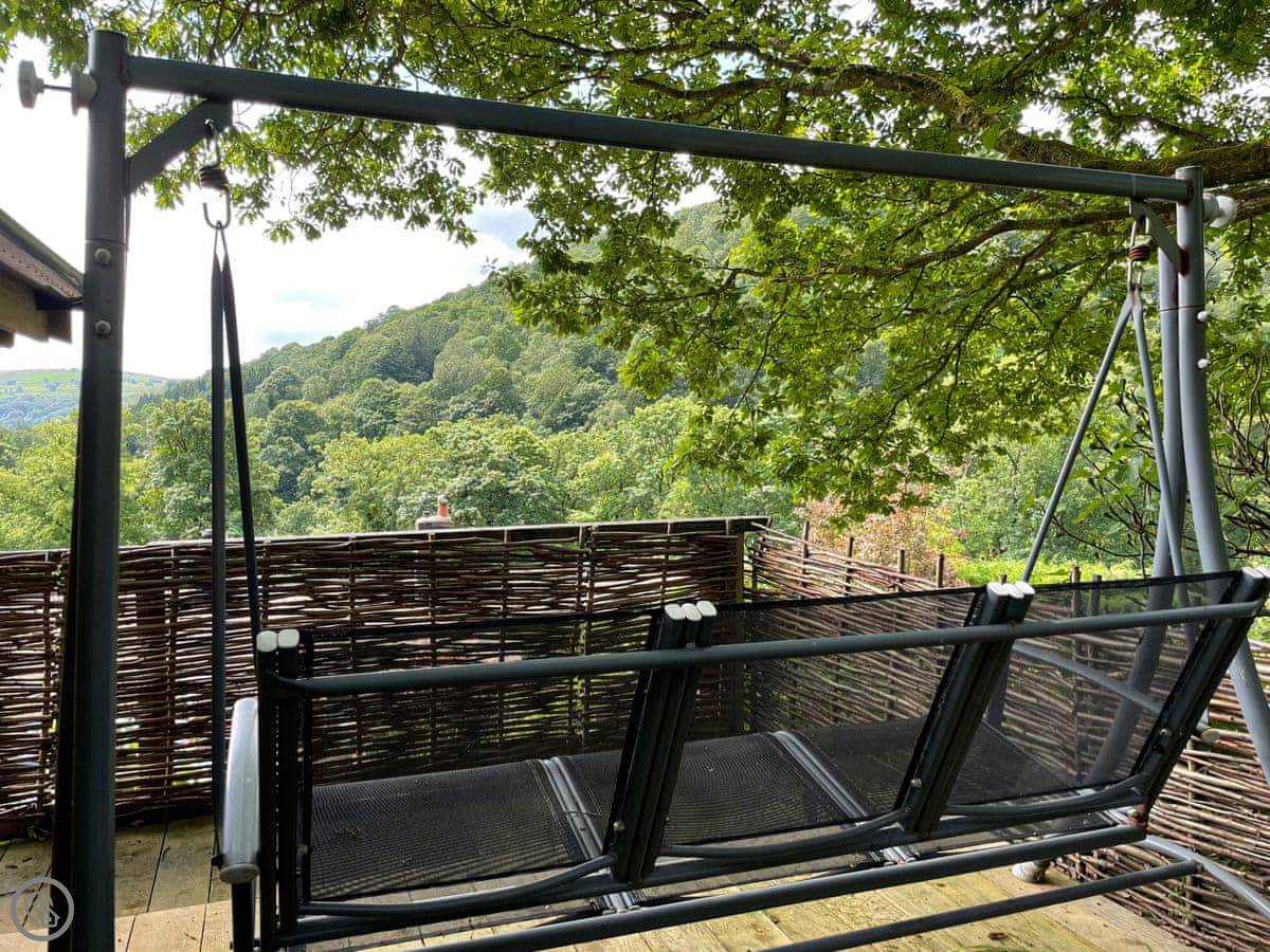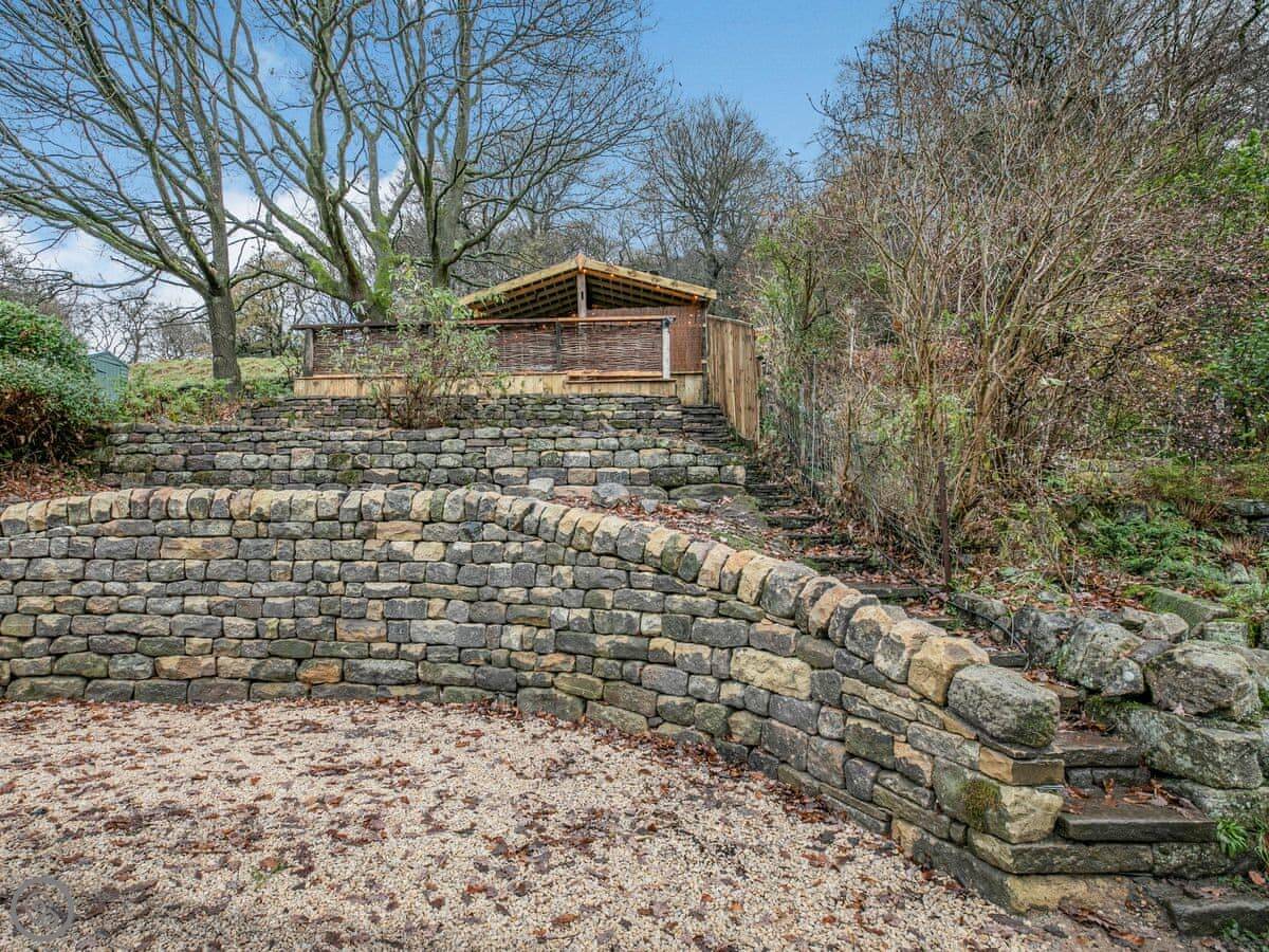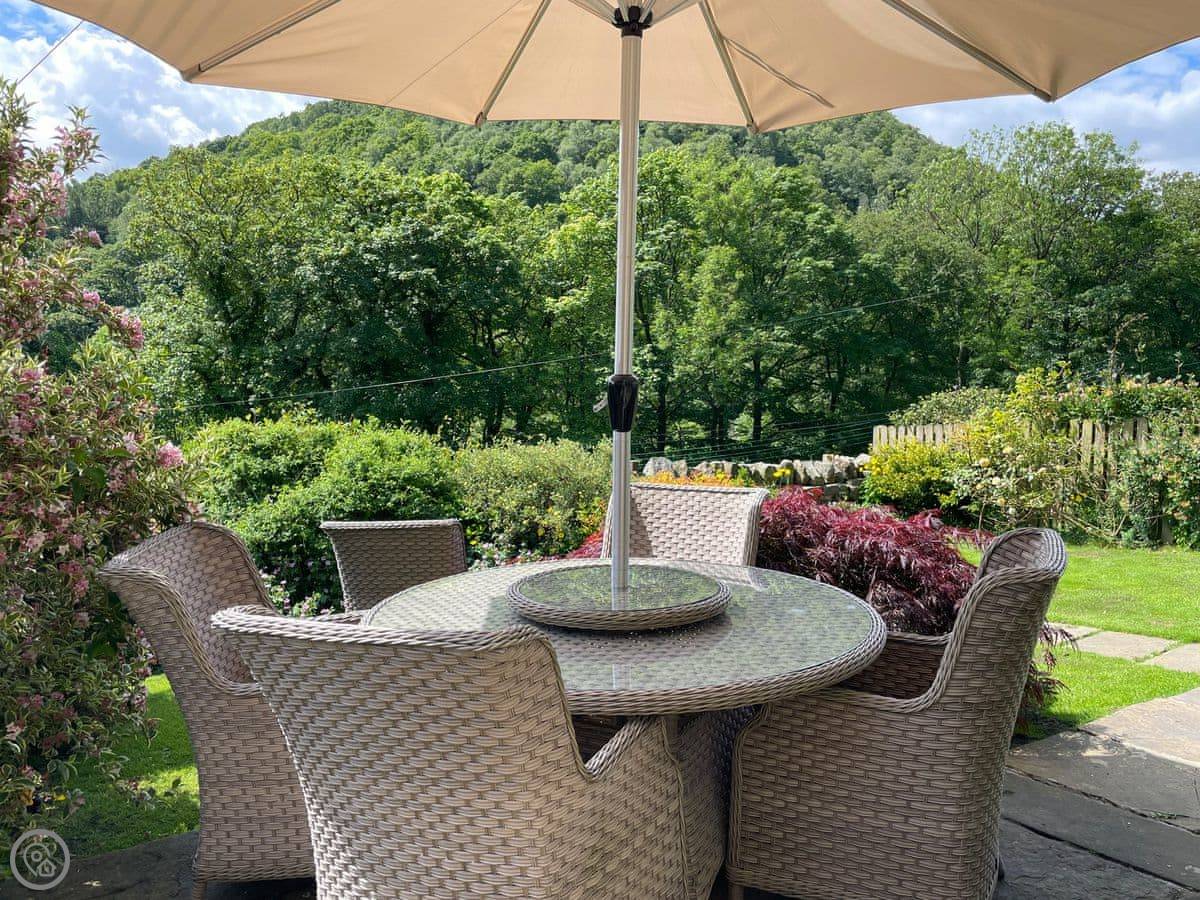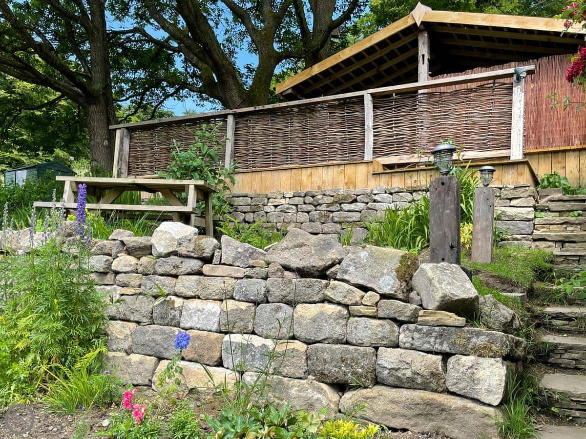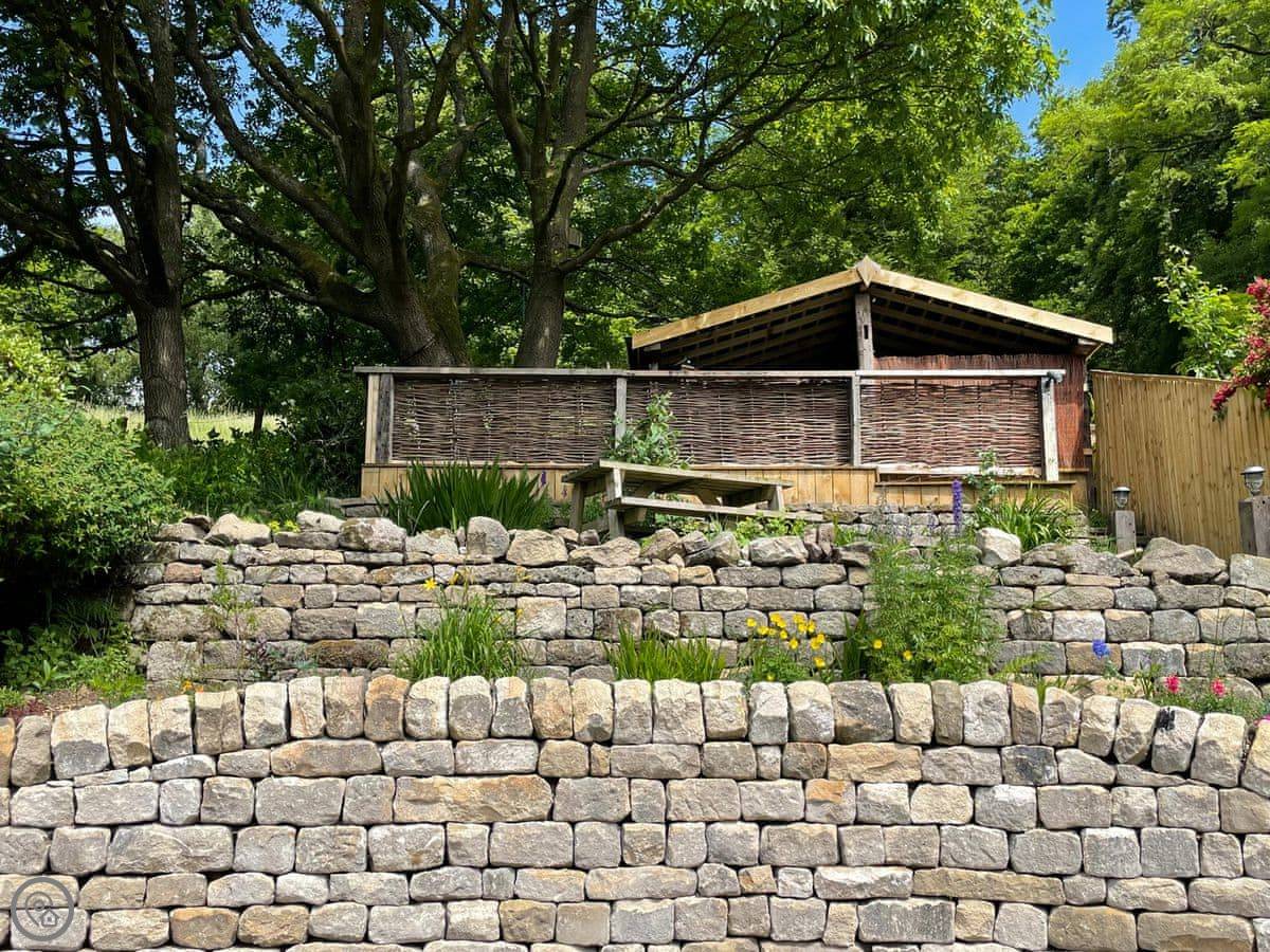 Outside, there's a patio at the front that gets the sun. At the back, there's a sheltered bit with a barbecue and the hot tub. The garden goes up the hill behind. There's a little hut up there with its own wood burner, so you can sit and look over the valley even if it's raining.