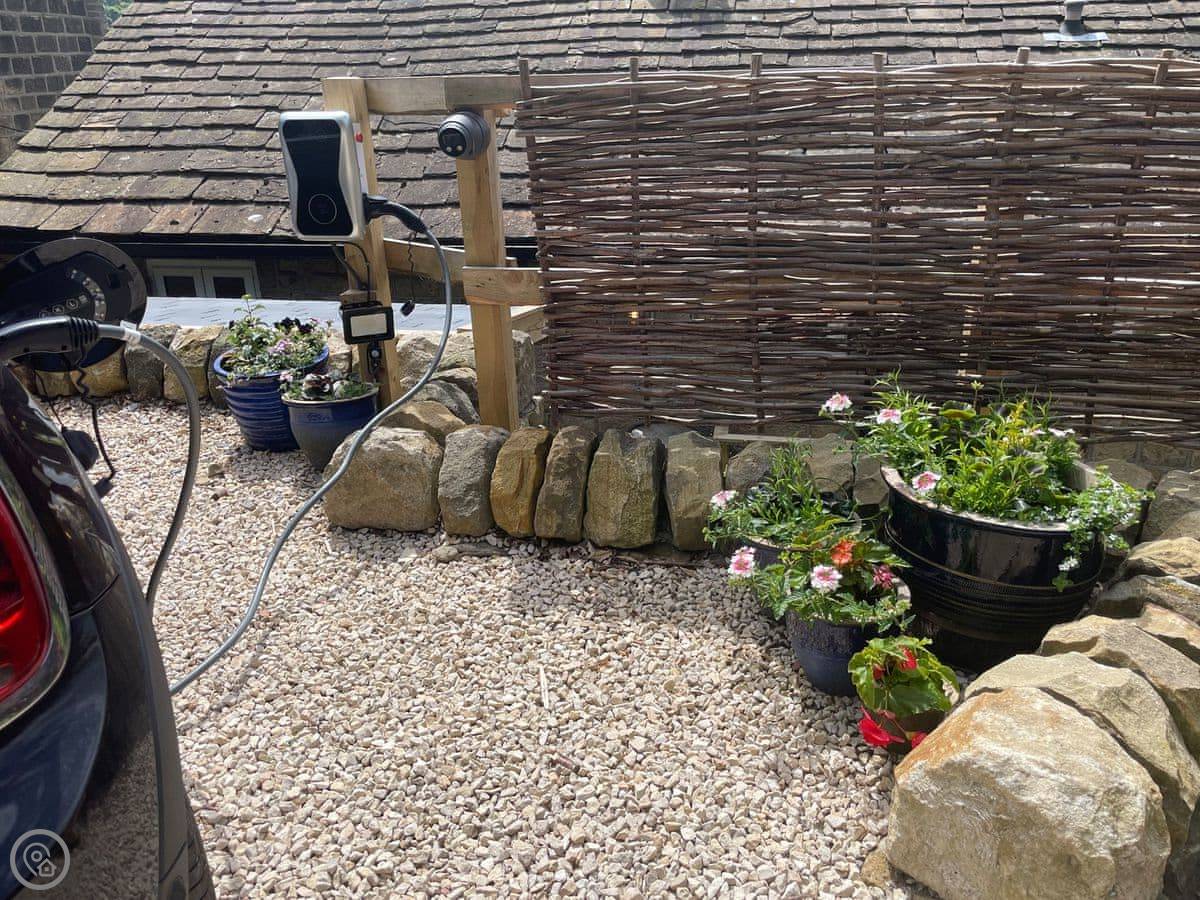 What's here: parking, the hot tub, a washing machine, dishwasher, WiFi, bedding and towels included. There's an electric vehicle charger. You can bring two dogs.