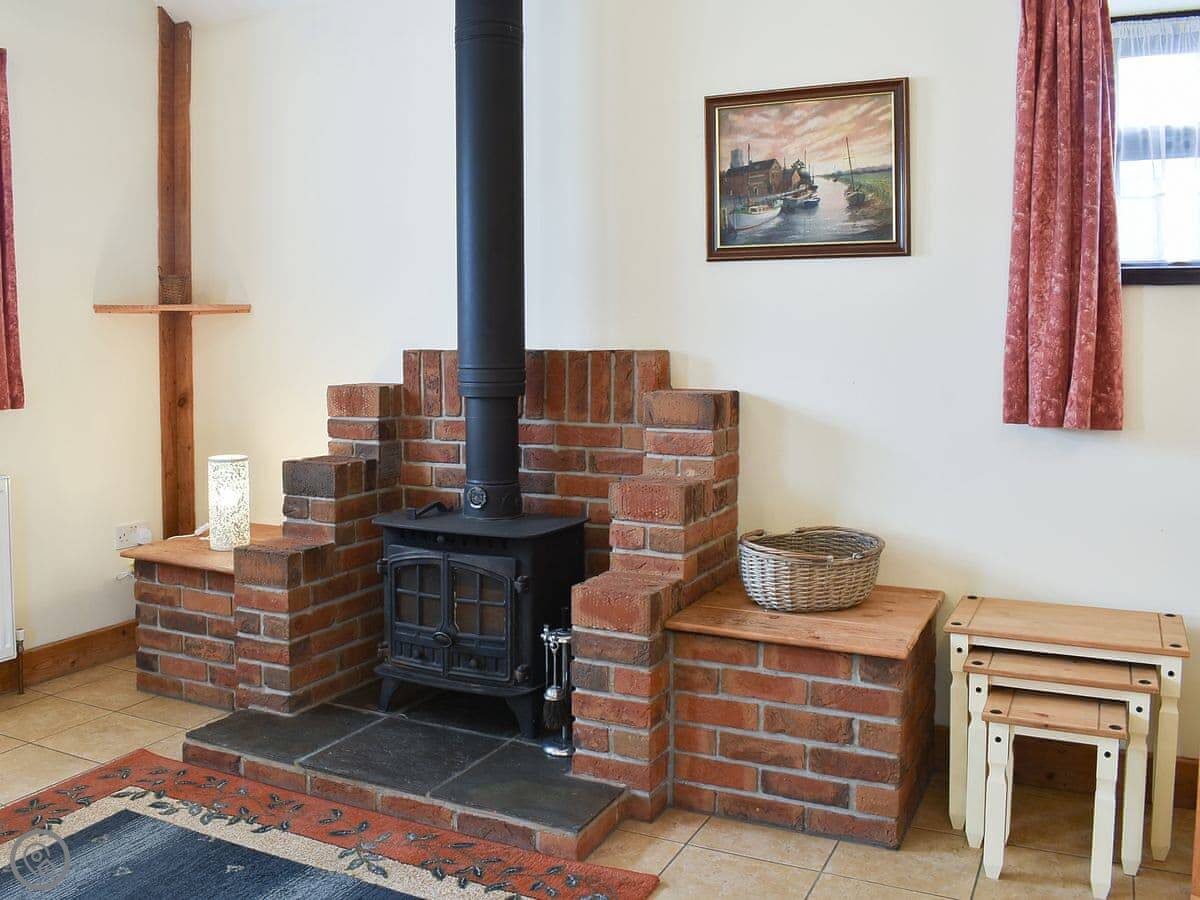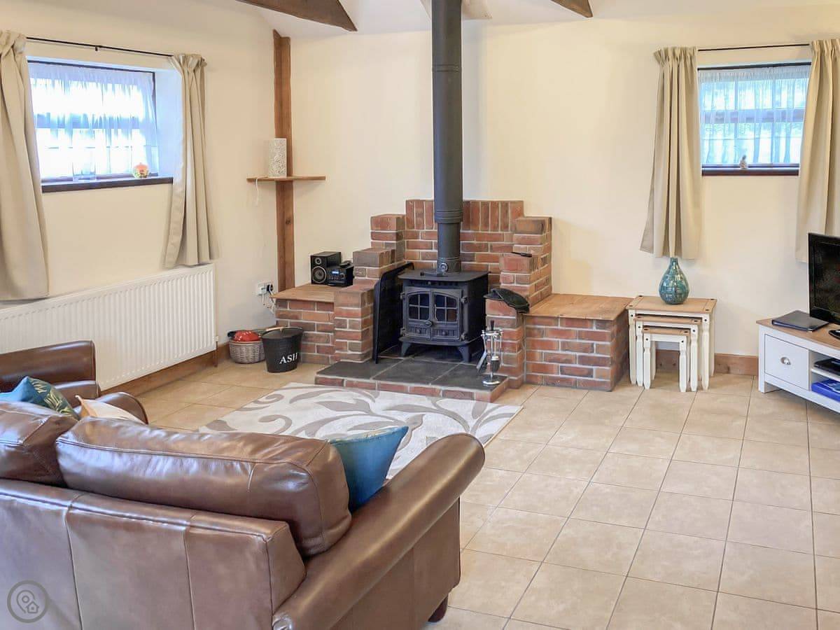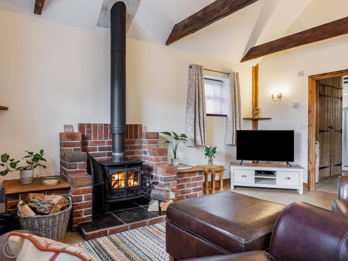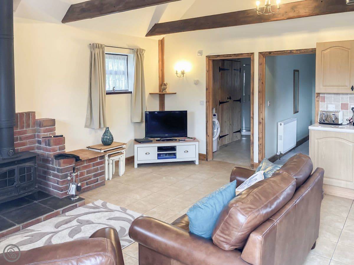 Inside, it's open plan. There's a woodburning stove. TV and WiFi are here if you need them. There's a washing machine. Bedding and towels are included.