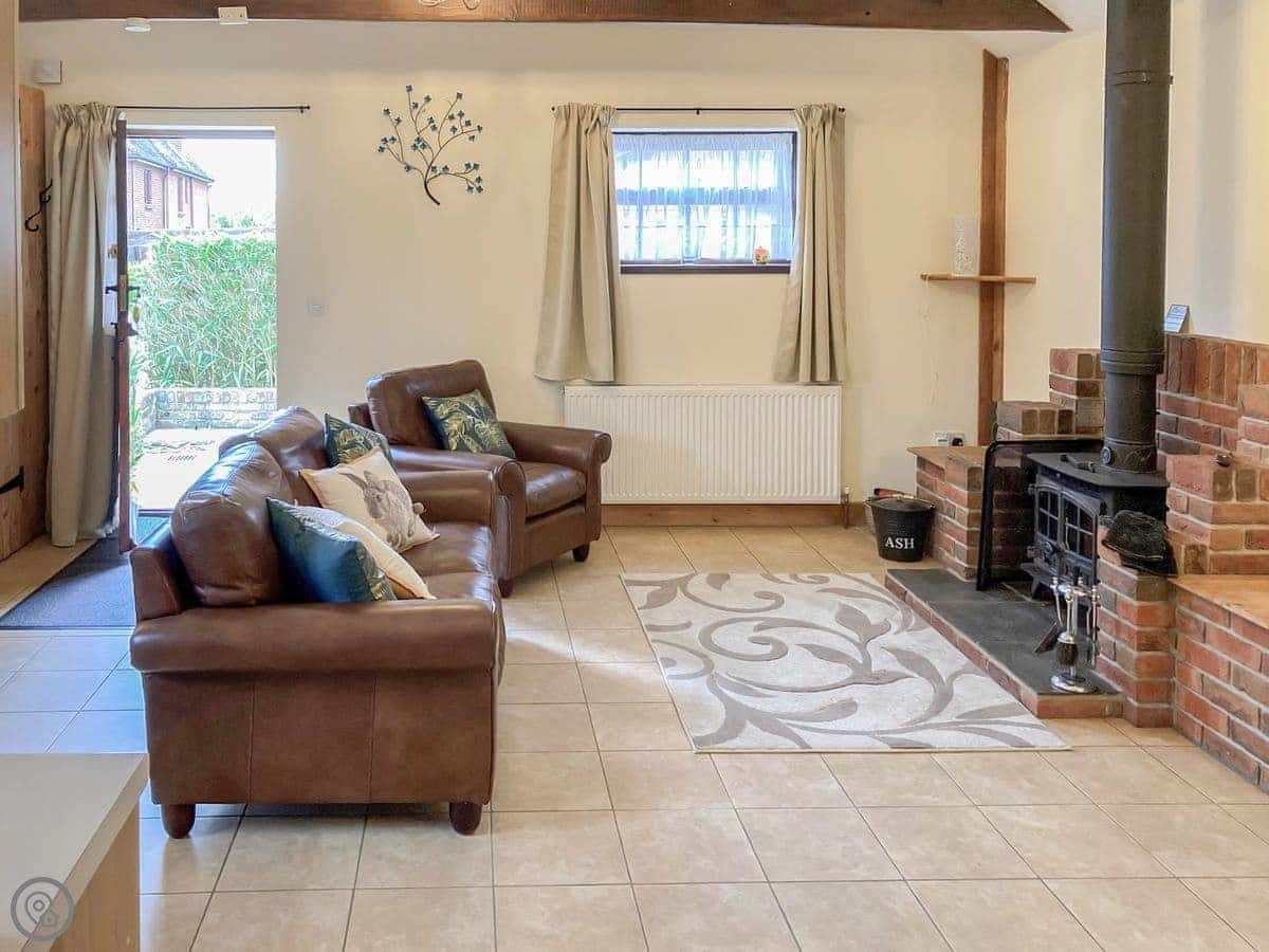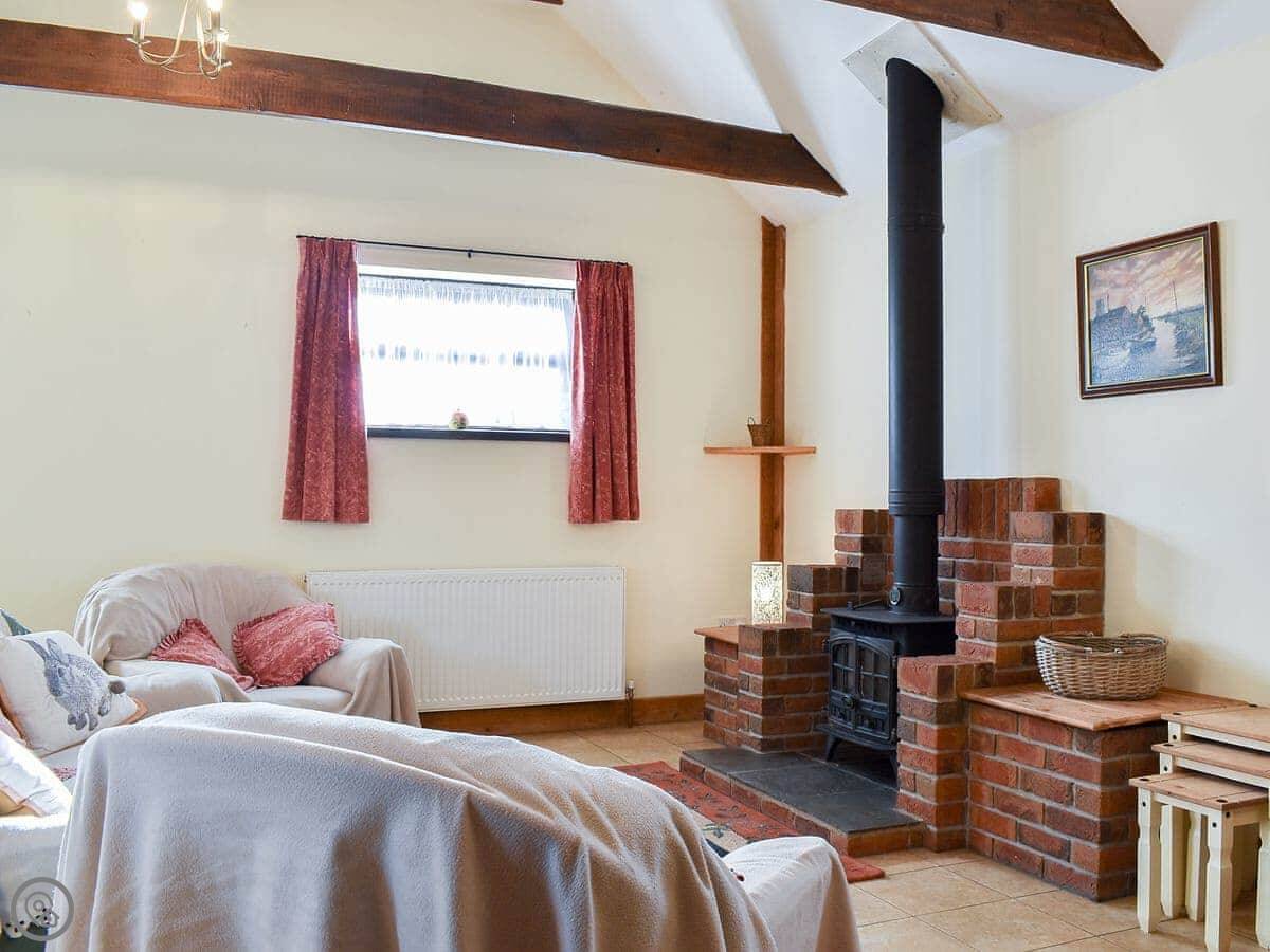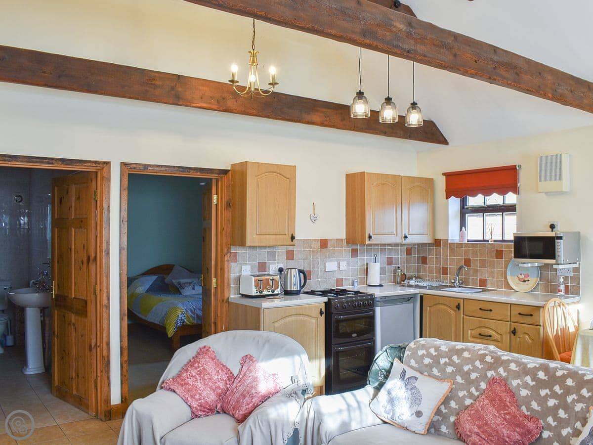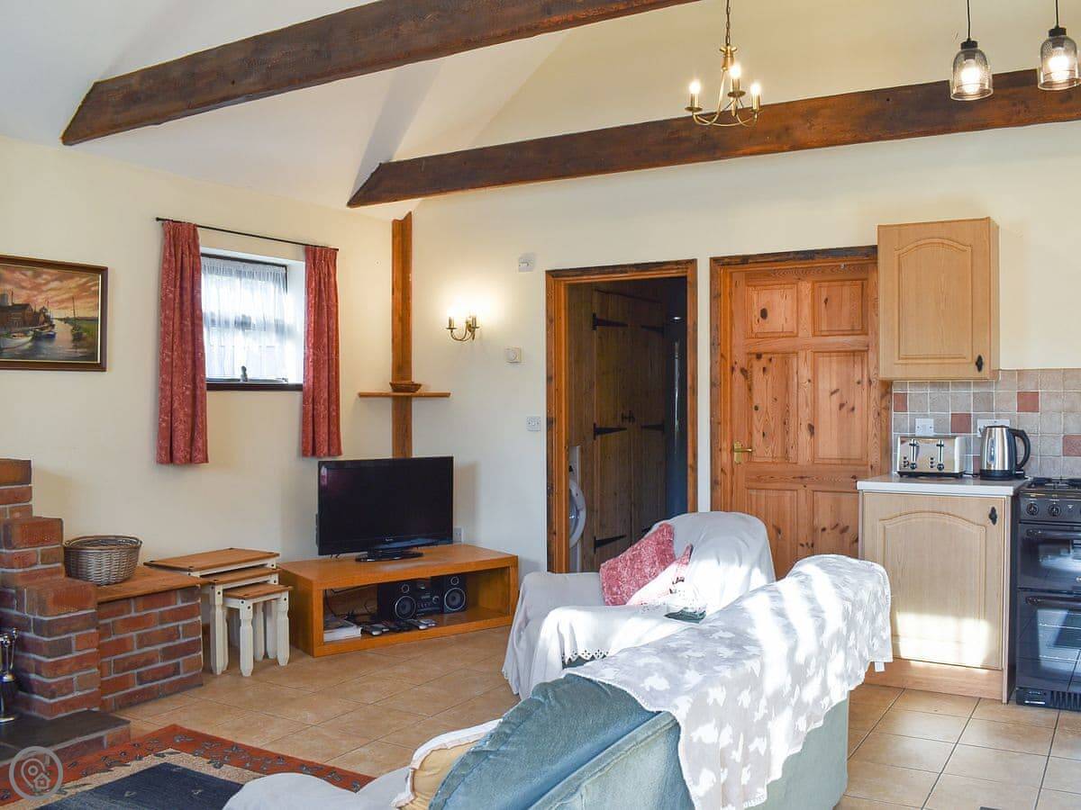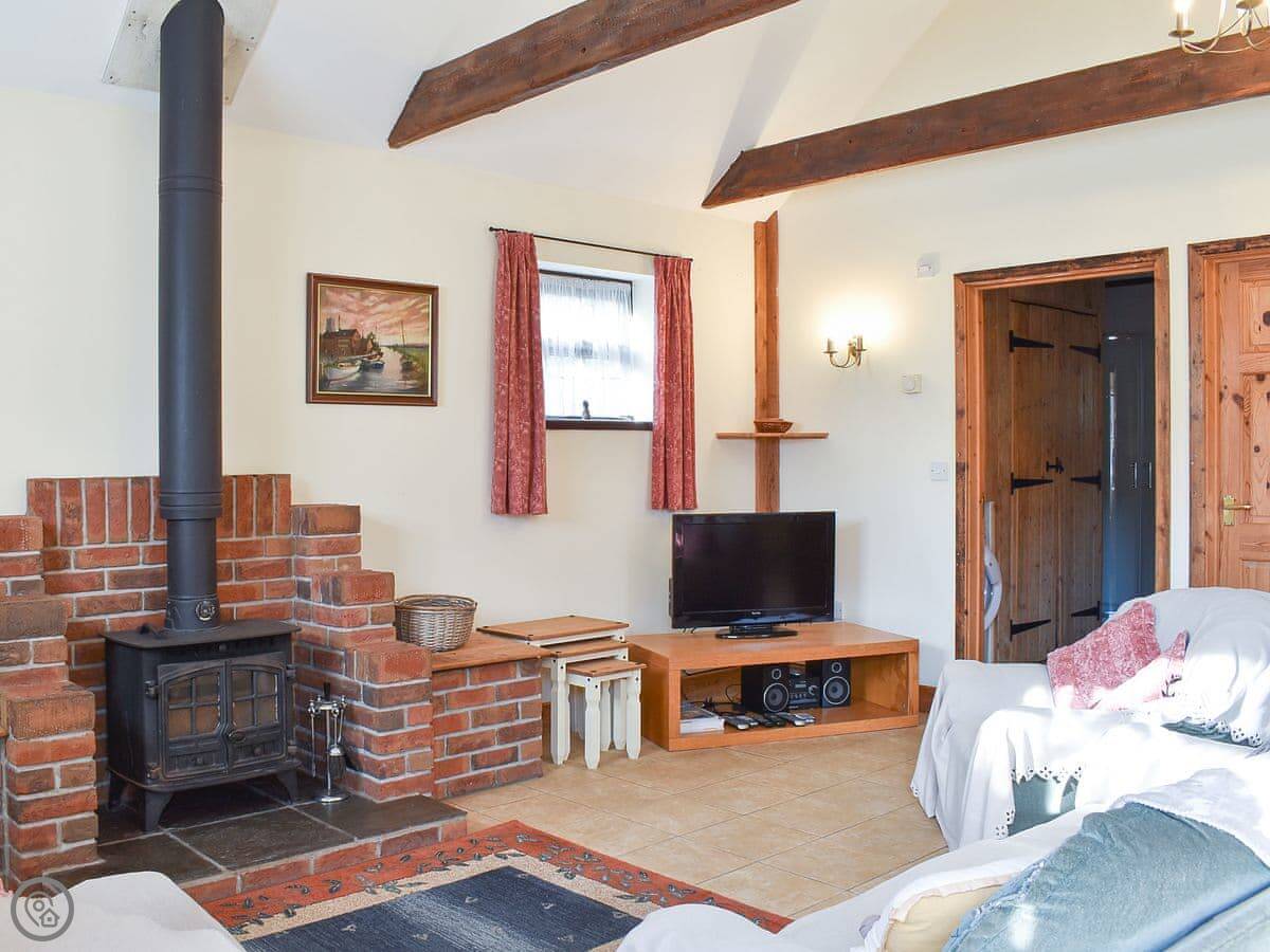 Inside, it's open plan. There's a woodburning stove. TV and WiFi are here if you need them. There's a washing machine. Bedding and towels are included.