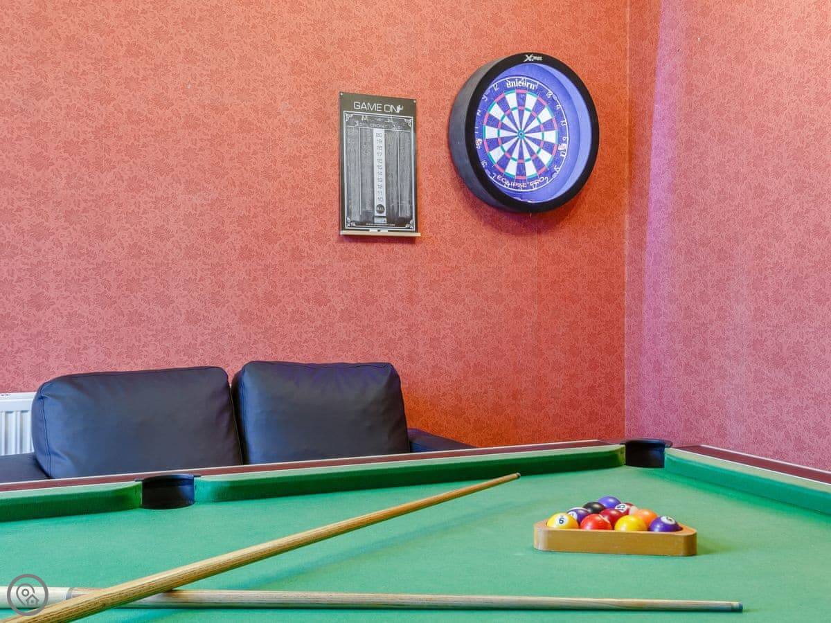 It sleeps eight in four bedrooms. There are two bathrooms. It's got a 5 Star rating. That means it's well kept and has everything you'd need. It's a proper family house, not a show home. The games room is in a converted outbuilding, it's got a pool table and some toys for wet days.