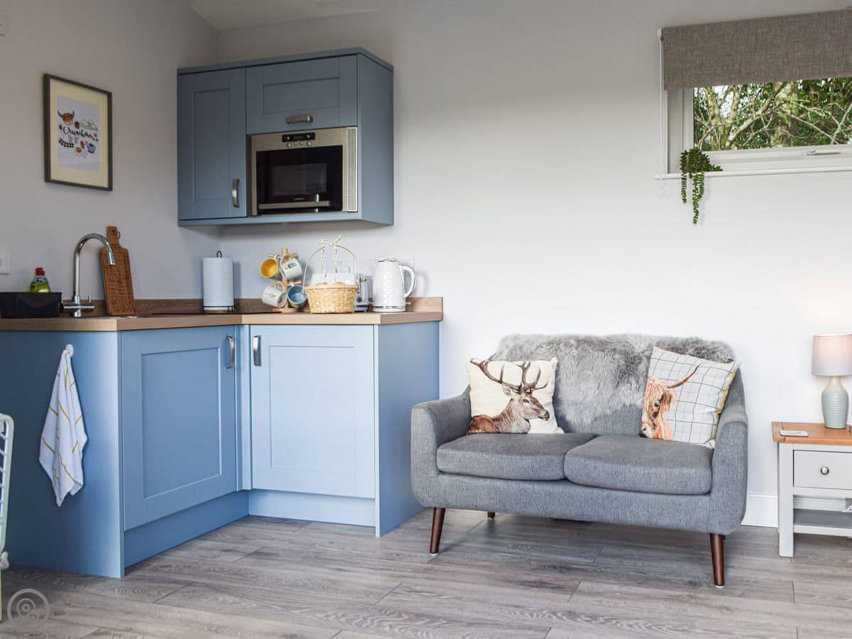 Lora Cabin has been thoughtfully laid out to maximise space and is completely open-plan. There’s plenty of space to relax on the comfy seating or on the welcoming double bed, where you can enjoy watching the wall-mounted TV with access to channels via a Firestick. A large patio door opens out onto a lovely decking area sheltered by the overhanging roof. There’s outdoor seating with a separate barbecue area, perfect for watching the day go by or gazing up at the stars on those clear, dark sky nights.