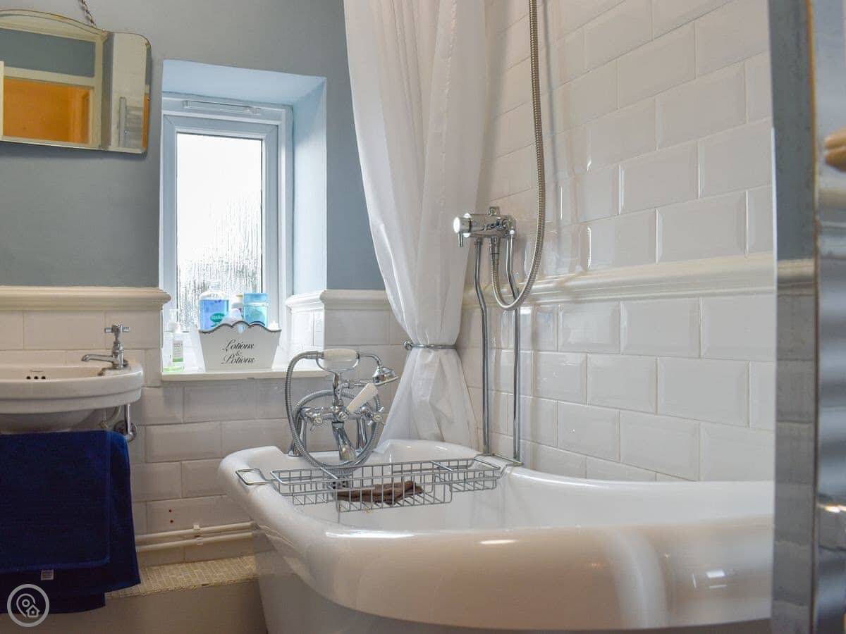 Inside, the stairs are cottage stairs. They're steep and a bit narrow. The bathroom has a roll-top bath with a shower over it.