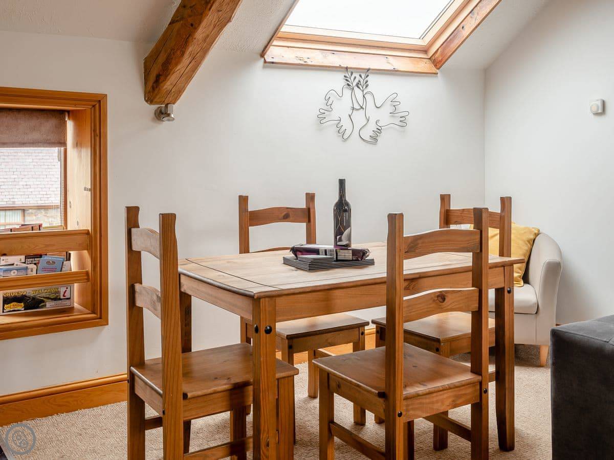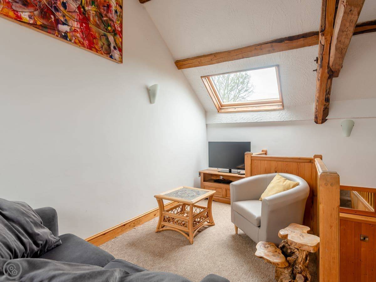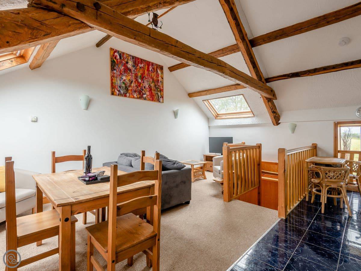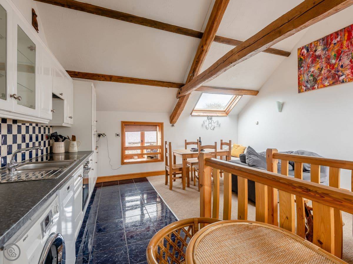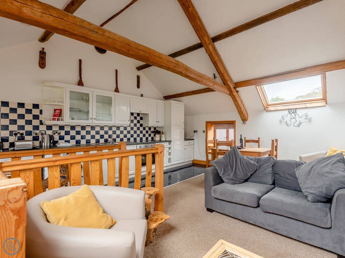 You come in on the ground floor straight into the bedroom. That's where the en-suite bathroom is too, shower over the bath. Then you go upstairs to the main living area. It's all open plan up there: kitchen, dining space, sitting area. It's got a tall ceiling with skylights so it feels bright even on a grey day. The beams are original. The stairs are fairly steep, just so you know.