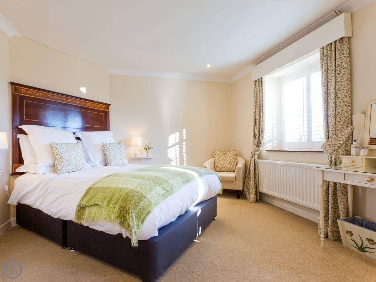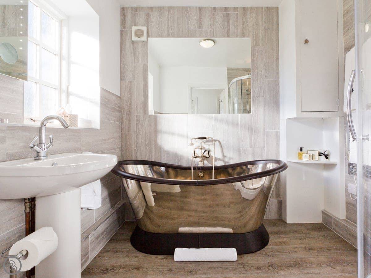 It sleeps four people, in two bedrooms. There’s one bathroom with a bath and a separate walk-in shower. The place has a 5 Star rating, which means it’s been finished to a high standard.