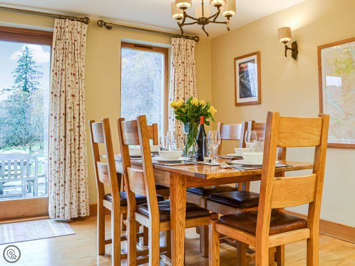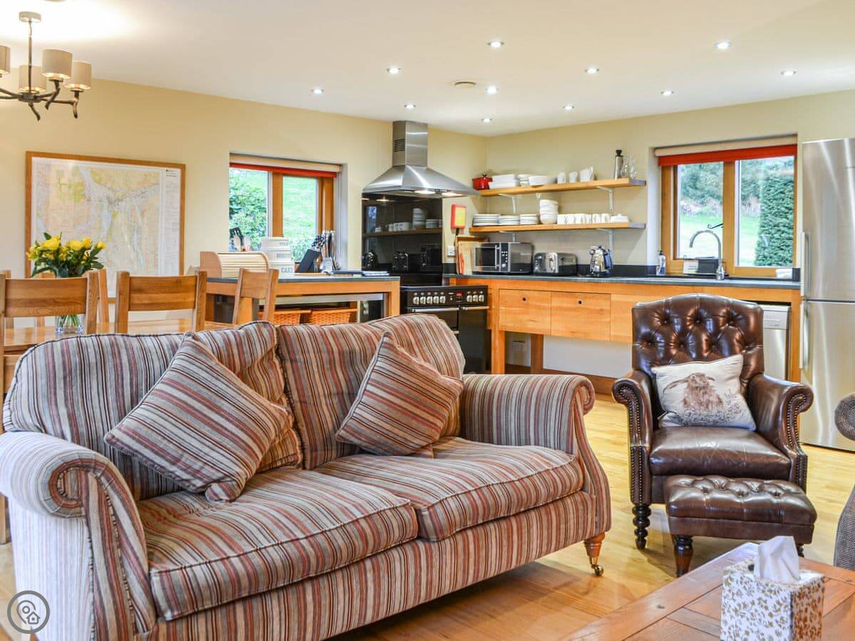 The living area is open plan, with doors out onto a slate terrace. That's where you’ll sit. The kitchen has what you need, and there’s a big table. It's heated by an air source heat pump, so it's warm. There's Starlink wifi.